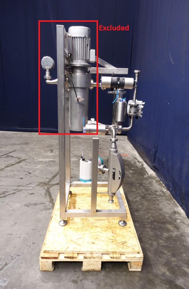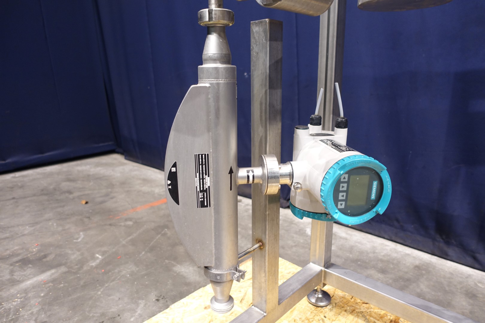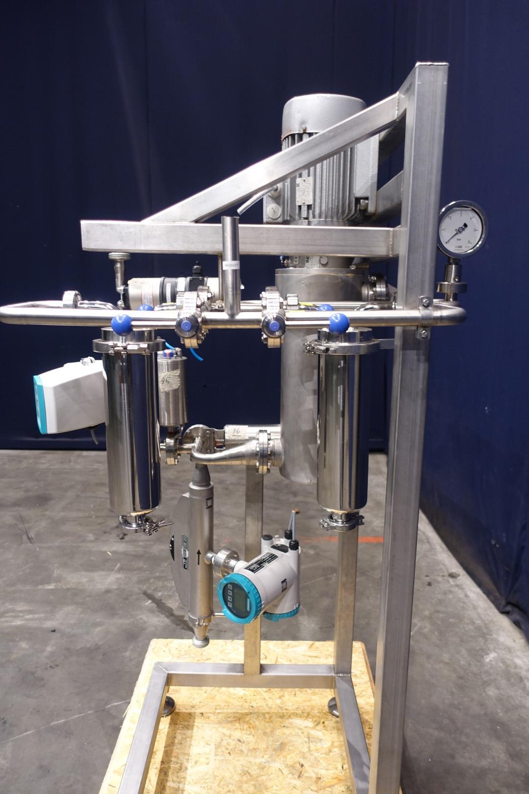 Mix system to inline 2 liquid ingredients with and without conductivy like a fatt and water including: Siemens Sitrans FC330 mass flow transmitter. Capacity minimal 240 kg/h to maximum 20.500 kg/h. Connections: in 26 mm / out 26 mm, DIN. With electronic head-display. With Siemens Sitrans F M Mag 5000 magnetic flow transmitter with tryclamp connections and 2 x SS amazon filters, type 720117VH10M1PS01, volume per filter 2,60 ltr. With spare filters 20 and 30 micron. Filter system with 4 x manual butterfly valves. Built on SS frame with indag inline mixer, which is STN15268. Dimensions: 120x80x185 cm. Total weigth 185 kg.