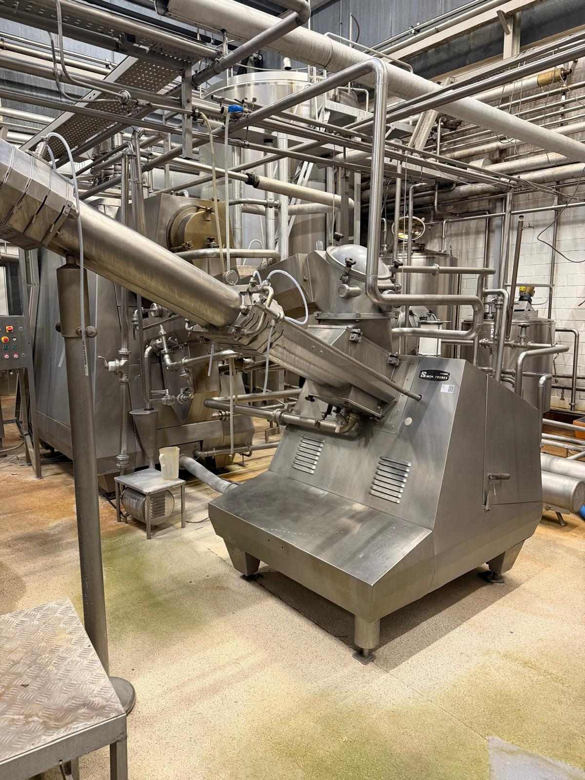 Complete continous butter production line (CBM). Operating principle of the production line: the cream pump transports the cream from the buffer tanks to the CBM. The CBM is capable of converting 4.000 liters of cream into 2.000 kg of butter. It also features a butter milk cooling and a vacuum section, and injection pumps for culture and water or brine. Furthermore, it includes all needed buttermilk components: CIP pumps, a collection tank, valves, piping, and all the necessary controls. After the butter is made in the CBM, it is pumped into the Simon freres butter silo, which includes 2 Waukesha outlet pumps to transport the butter to the filling machines. Documentation available.