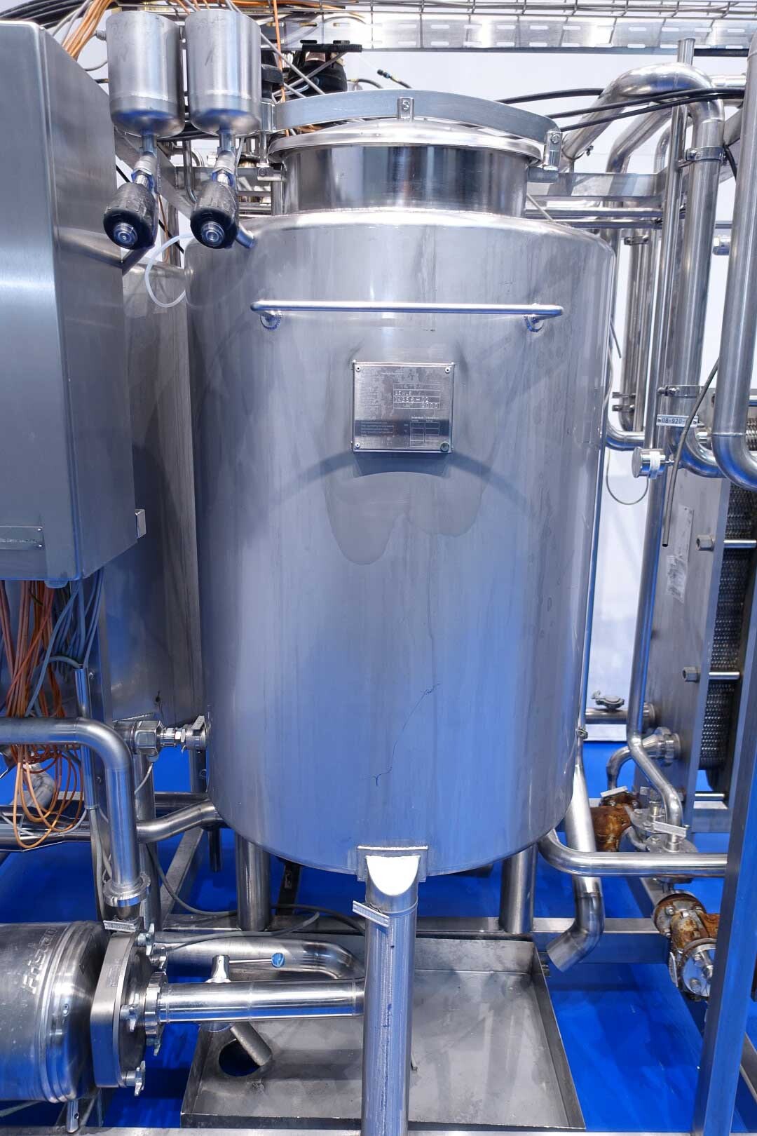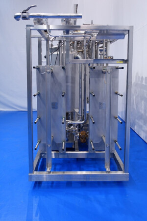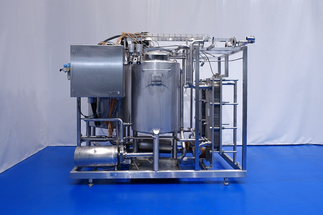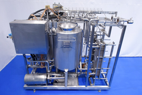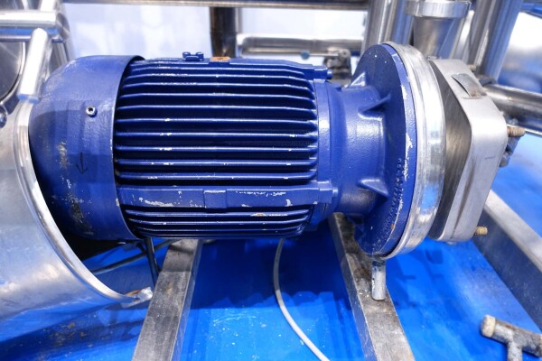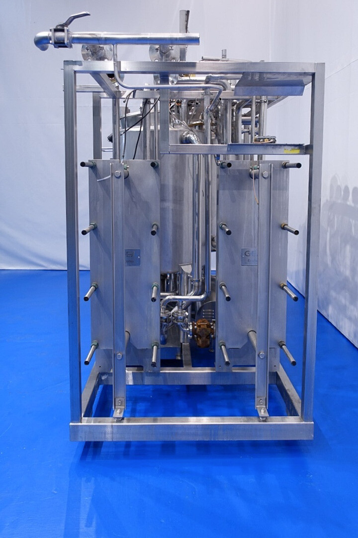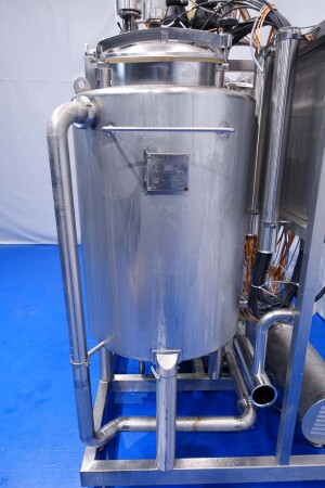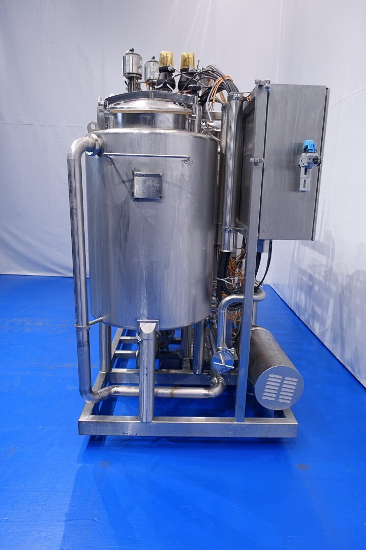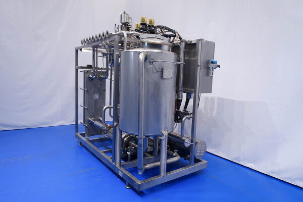Skid gemonteerde dubbele CIP unit, 2 onafhankelijke CIP units gemonteerd in 1 frame. Elke unit bestaat uit: balansvat 500 liter, Fristam centrifugaalpomp CIP+ pomp, filter en een platenwarmtewisselaar. Details pomp: Fristam type: FP742 A - nr. 0443440080 motor: ABM 5,5 kW - 12 A - 2.890 tpm - 50 Hz - waaier Ø 175 mm - aansluitingen in: 2,5" Din - uit: 2" Din. Pomp 2 identiek alleen nr. 2 0443440081 en motor: 5,5 kW - 10,3 A - 2.930 tpm., beide geven 25-50m3/h bij >4bar - aansluitingen in: 3" Din - uit: 2" Din. 2x GEA platenwarmtewisselaar om het reinigingsmiddel te verwarmen tot de ingestelde temperatuur. Beide type: VT20CDS-C-10 - nr.: 170/13975 en 170/13976 - 1 sectie 22 platen. 11x pijpen aan de zijkant van skid met aansluitingen 2" Flens. Besturing: Siemens remote I-O box. Compleet met leidingwerk voor condensaat en cip + retourkleppen, 2 kleine vaten aangesloten op het vat voor het toevoegen van enzymen. (Alleen stoomregelkleppen ontbreken)