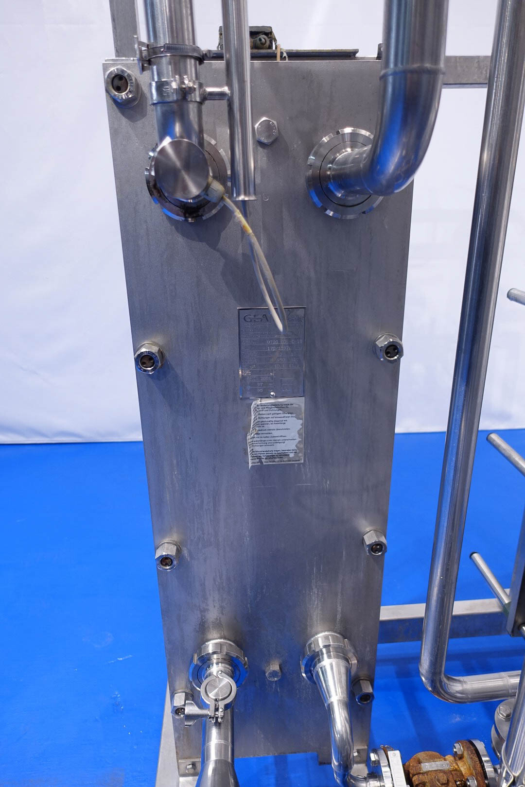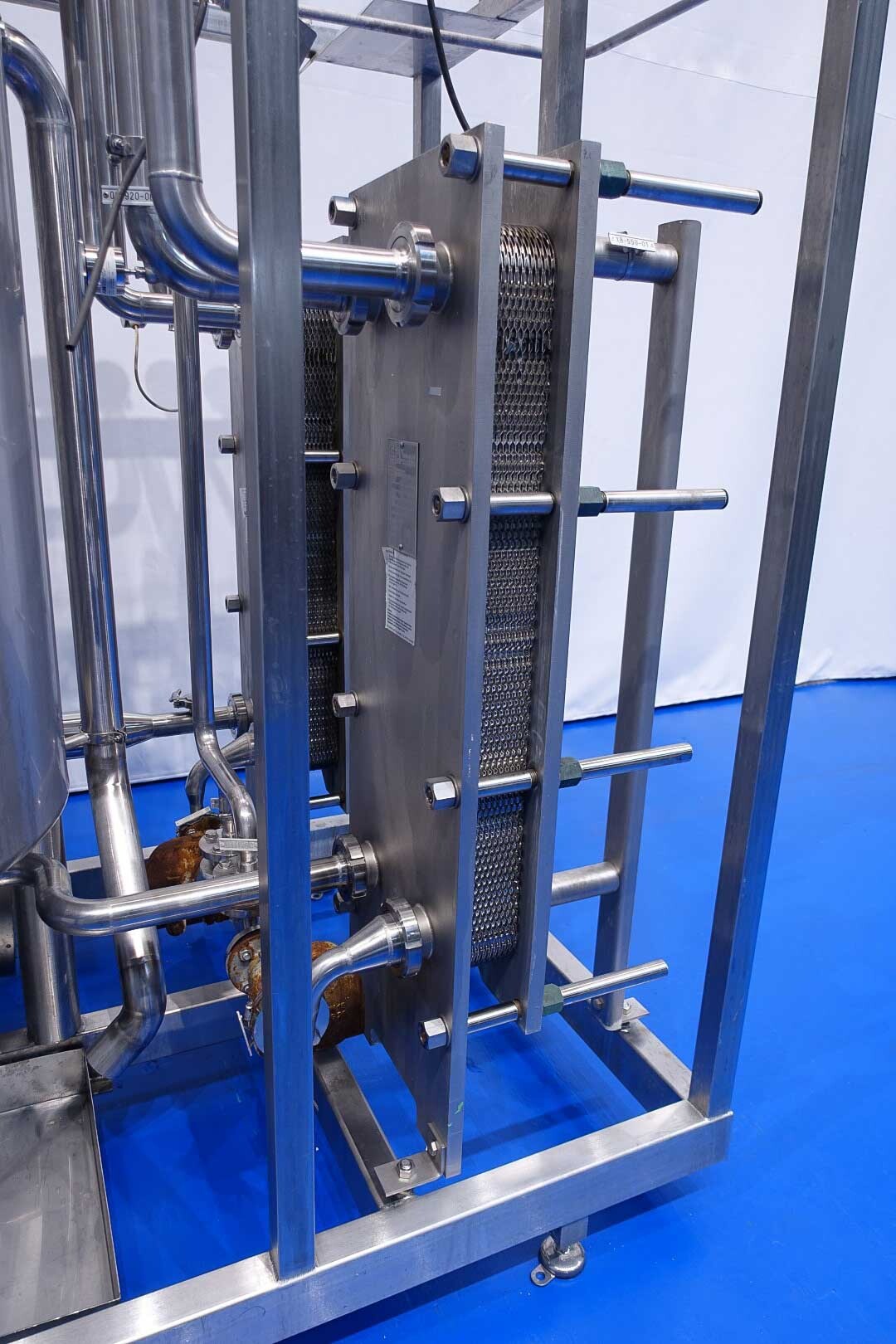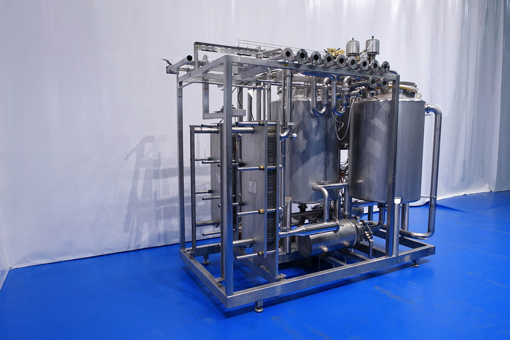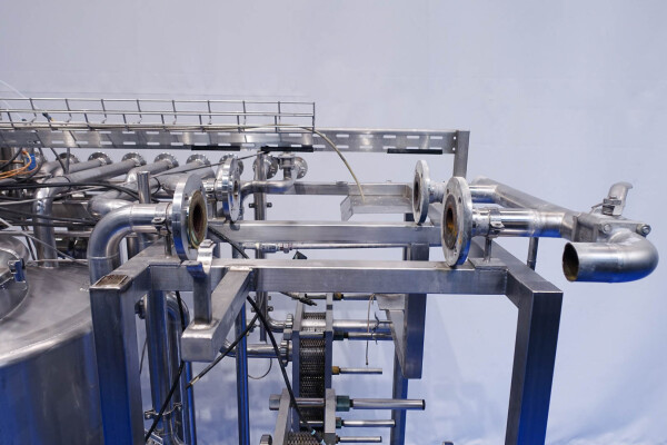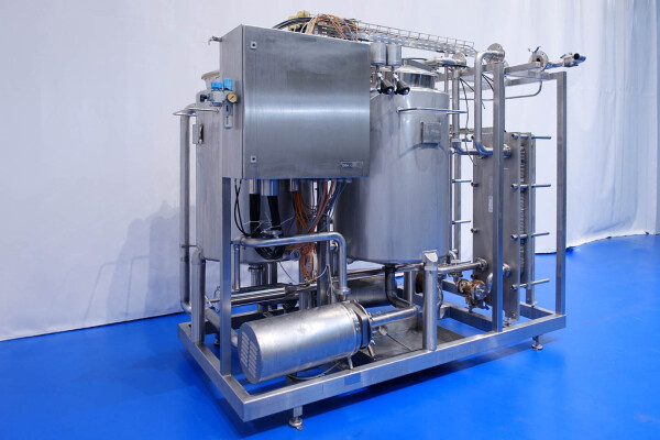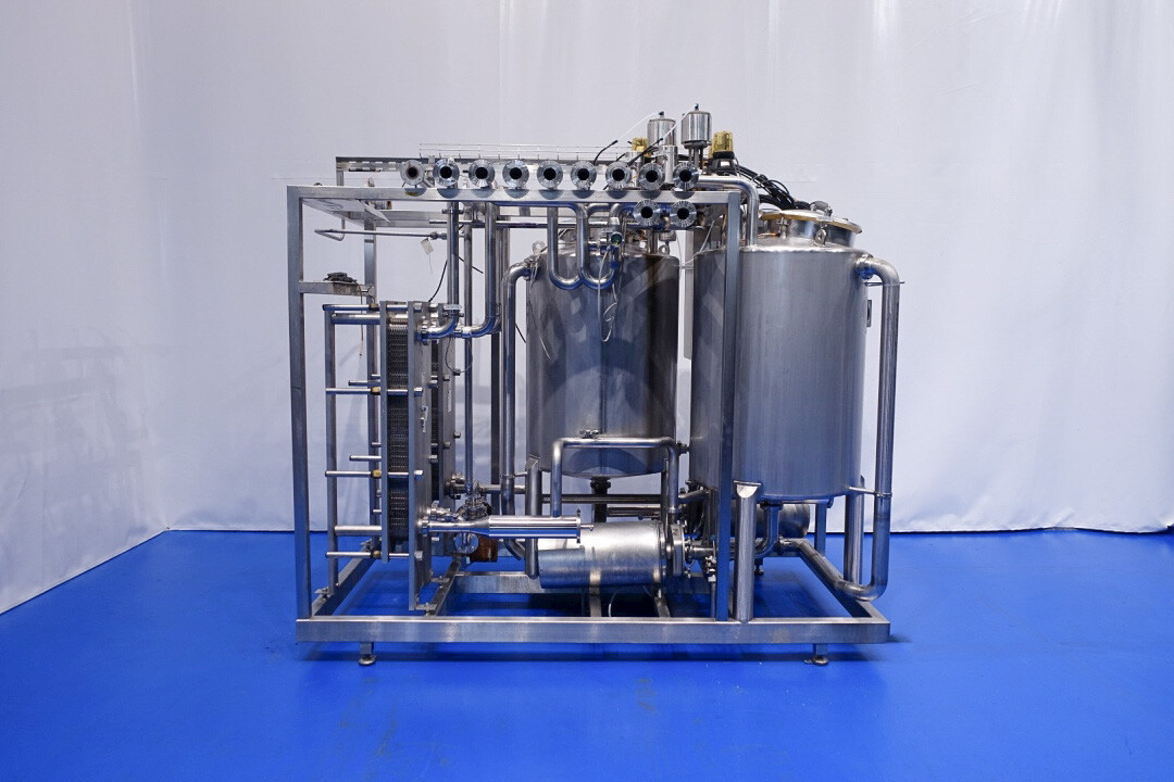 Skid gemonteerde dubbele CIP unit, 2 onafhankelijke CIP units gemonteerd in 1 frame. Elke unit bestaat uit: balansvat 500 liter, Fristam centrifugaalpomp CIP+ pomp, filter en een platenwarmtewisselaar. Details pomp: Fristam type: FP742 A - nr. 0443440080 motor: ABM 5,5 kW - 12 A - 2.890 tpm - 50 Hz - waaier Ø 175 mm - aansluitingen in: 2,5" Din - uit: 2" Din. Pomp 2 identiek alleen nr. 2 0443440081 en motor: 5,5 kW - 10,3 A - 2.930 tpm., beide geven 25-50m3/h bij >4bar - aansluitingen in: 3" Din - uit: 2" Din. 2x GEA platenwarmtewisselaar om het reinigingsmiddel te verwarmen tot de ingestelde temperatuur. Beide type: VT20CDS-C-10 - nr.: 170/13975 en 170/13976 - 1 sectie 22 platen. 11x pijpen aan de zijkant van skid met aansluitingen 2" Flens. Besturing: Siemens remote I-O box. Compleet met leidingwerk voor condensaat en cip + retourkleppen, 2 kleine vaten aangesloten op het vat voor het toevoegen van enzymen. (Alleen stoomregelkleppen ontbreken)