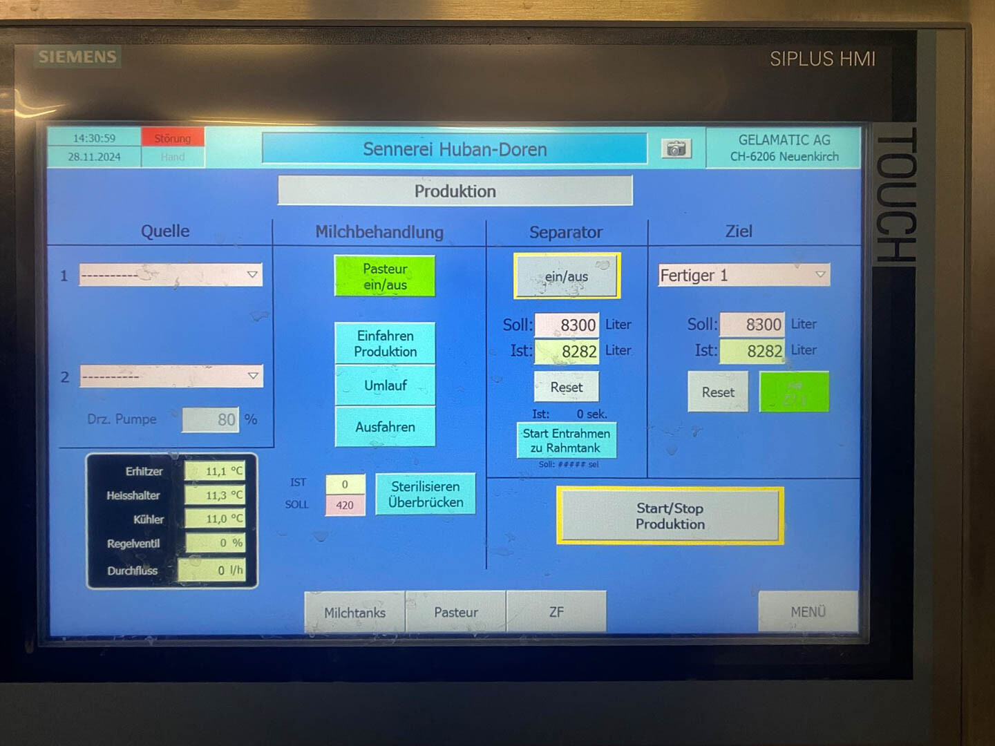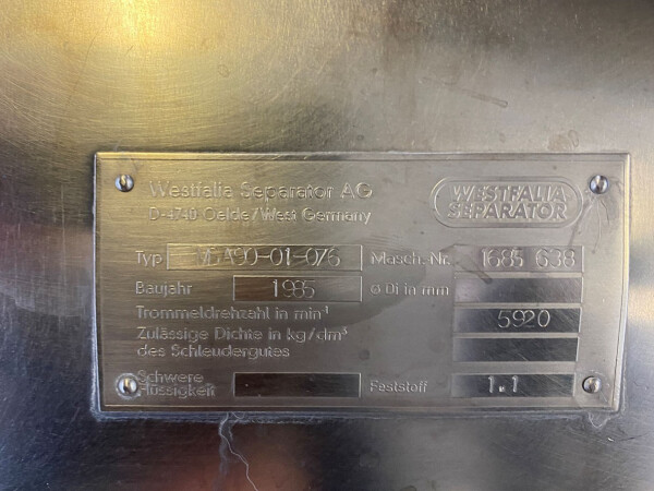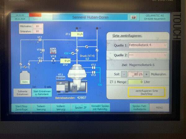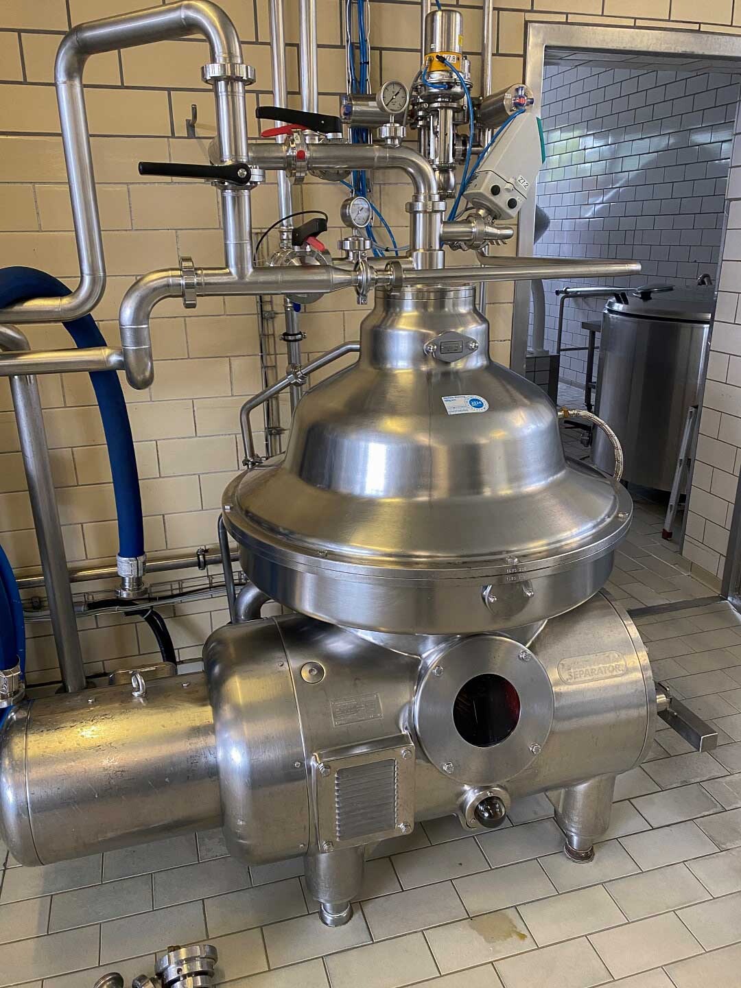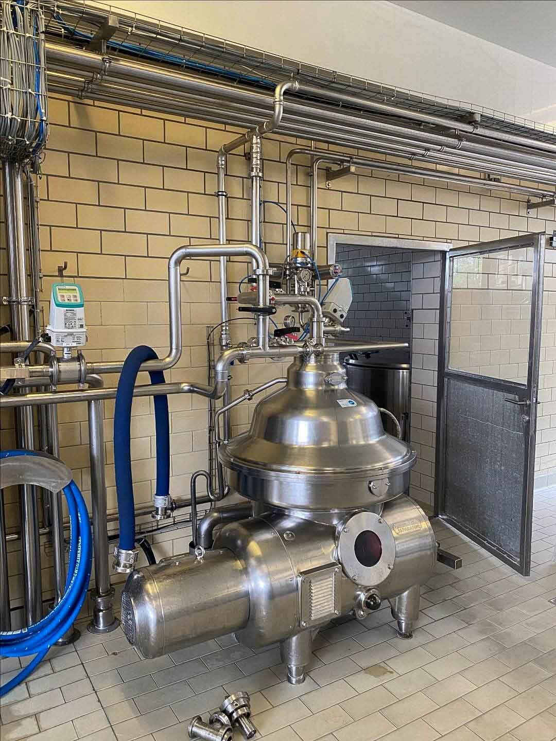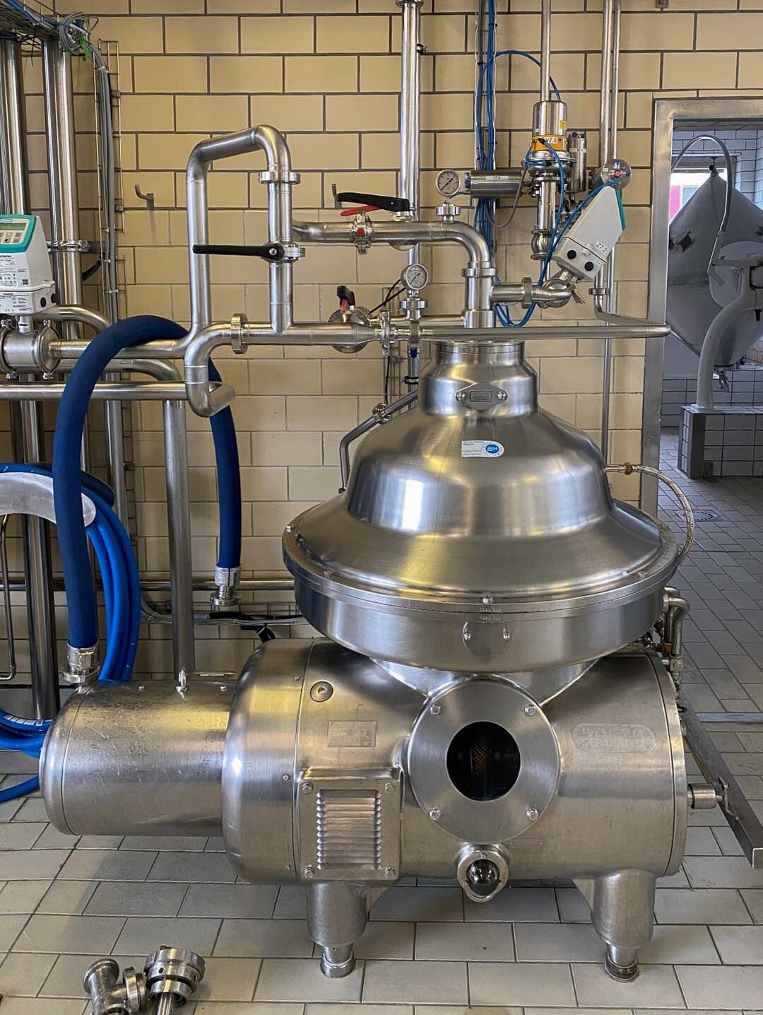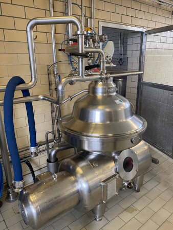 Westfalia MSA 90-01-076 Melk- en wei-ontromer/separator. Jaar 1985, capaciteit: 7.000 - 10.000 liter per uur. Compleet met tegendrukventiel, flowtransmitter en regelklep voor room met bypass voor reiniging (speciaal ontwerp voor wei en melkroom), set gereedschappen. Zowel melk als wei worden afgeroomd door dezelfde separator, de separator is direct verbonden met het centrale koppelbord, bediening gecentraliseerd in het paneel. (Siemens TP 1500 HMI-scherm gemonteerd op melkpasteur). Compleet met documentatie, lay-out en P&ID.