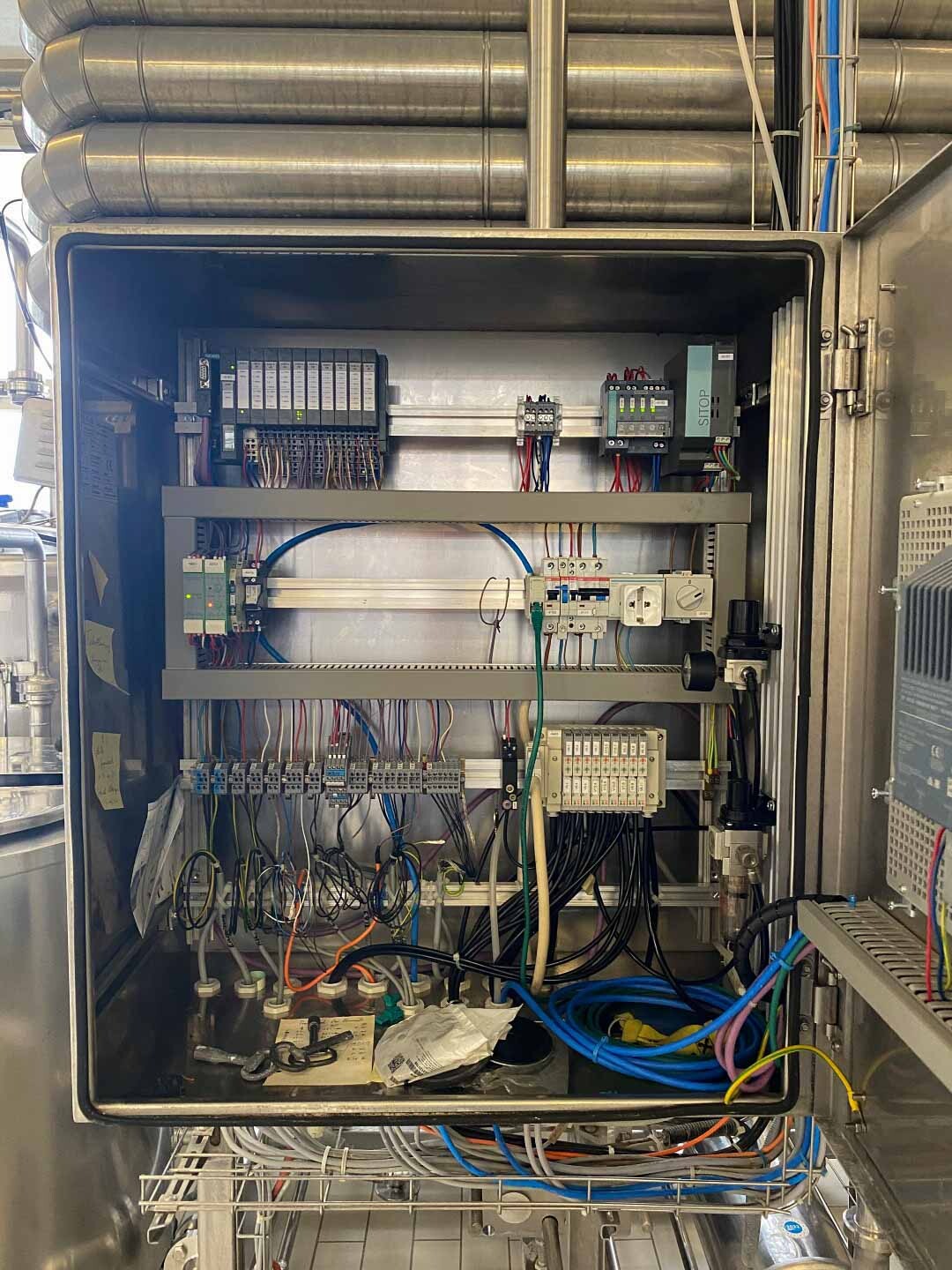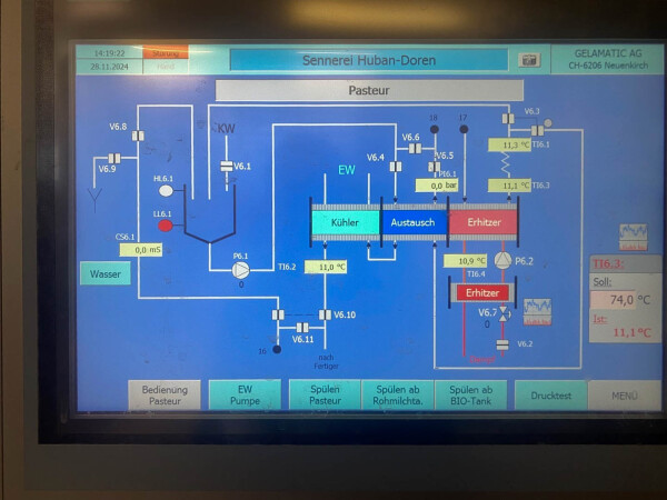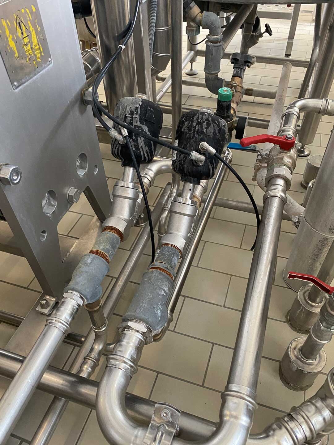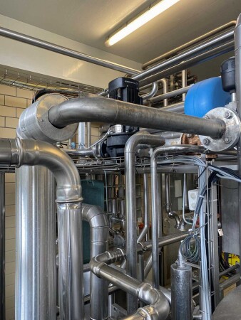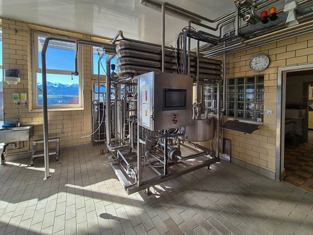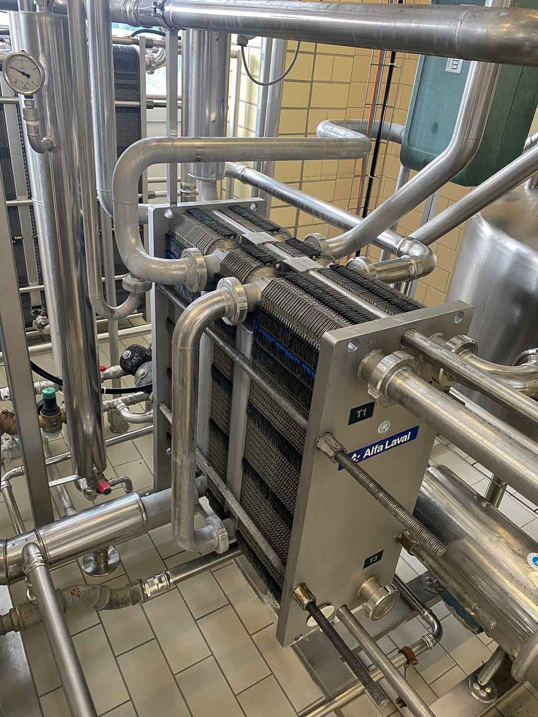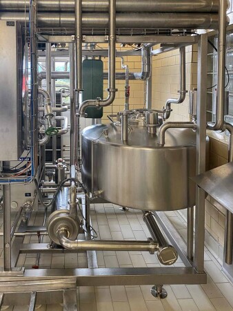 Skid gemonteerde melkpasteur. Capaciteit: 7.000 ltr/u. Thermisch proces: In 4°C → 55°C (separator) → 72°C (holding) → 30°C. Balanstank, filter, pompen, warmtewisselaar Alfa-Laval M6 jaar: 1995, kleppen, regelklep stoom. Geïsoleerde holding op de skid. Bediening van de hele fabriek op 1 centraal HMI-scherm Siemens TP 150, gemonteerd op deze unit. Compleet met documentatie, lay-out, P&ID's en software.