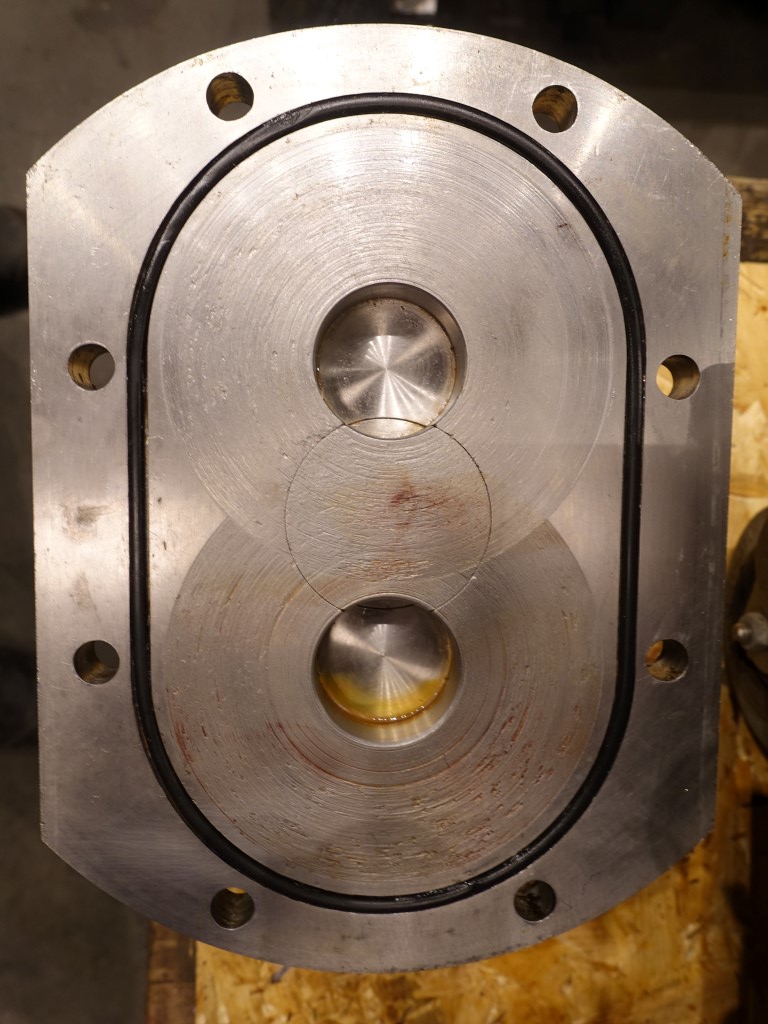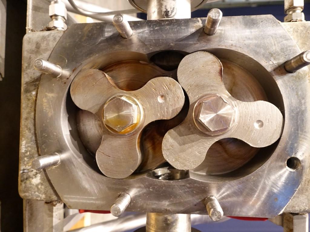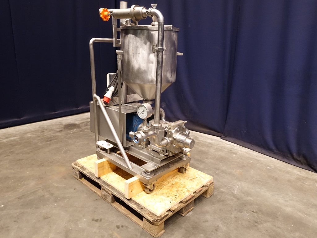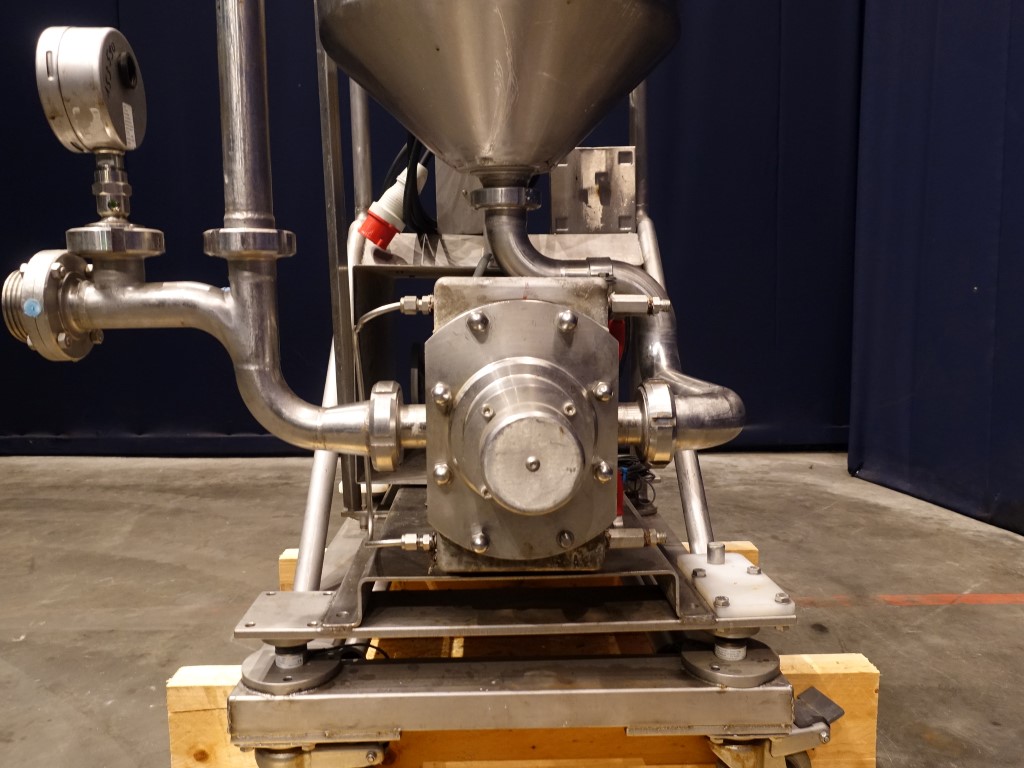Lobbe pump with tri stainless steel lobbes. Diameter lobbes: 98 mm. Displacement per revolution: 0,266 ltr. Current drive work: motor: 1,1 kW - 2,6 A - n1: 1410 rpm, n2: 80 - 400 rpm. Max speed: 1.000 rpm. Variable speed by mechanical variator. Stainless steel cover over electric motor. Design pressure up to 10 bar in newcondition. Over pressure valve. Mounted with 3 load (weighing) cells on a mobile frame with hopper (50 ltr). Connections: DN40, SMS.
