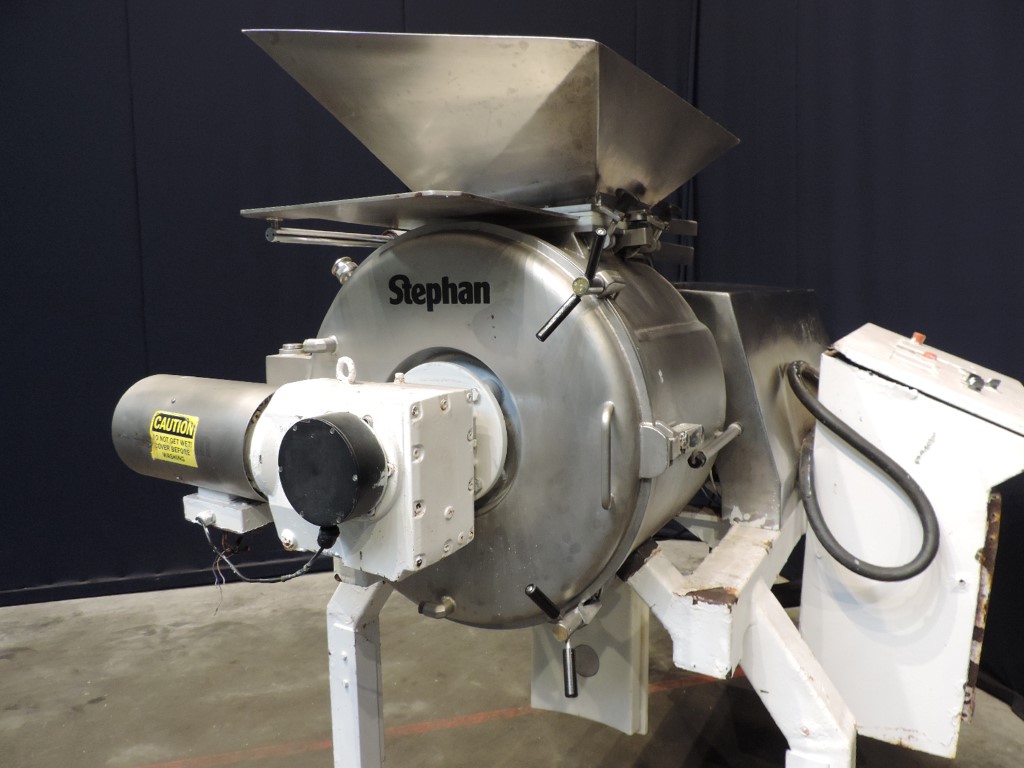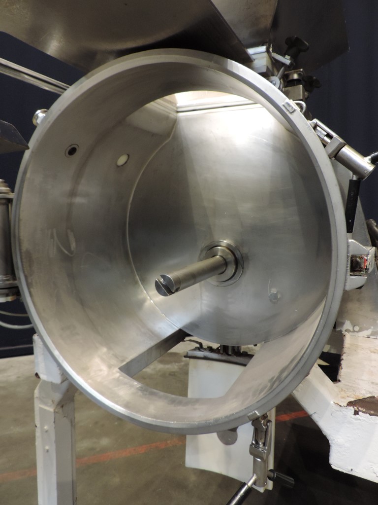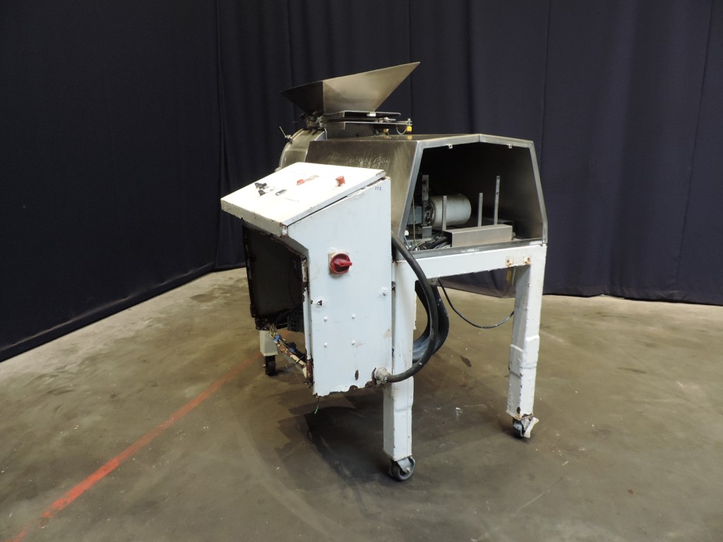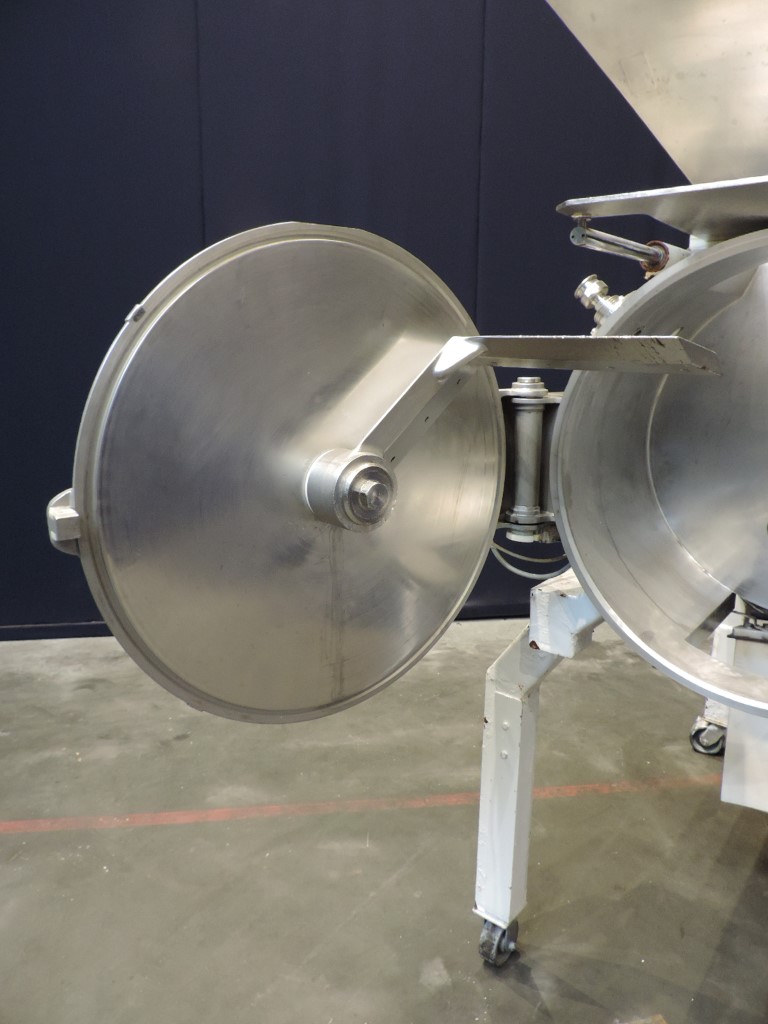 Universal horizontal mixer-cooker. The main product bowl and cover are double jacketed for cooling or heating (no valves on jacket), no vacuum. Hydraulic unit for moving outlet slide on bottom outlet. Top inlet and the main front lid have 2 clamps, manual tightening and contact sensor, infeed hopper. 2 agitators: 1 scraper agitator, 25 rpm and 1 mixer knife (knife itself excluded). Main motor 18/24 kW, 730 - 1470 rpm. Total electrics: 28 kW - 60 A - 380 V -50 Hz. Mobile steel painted frame. Empty steel control panel mountend on the machine.