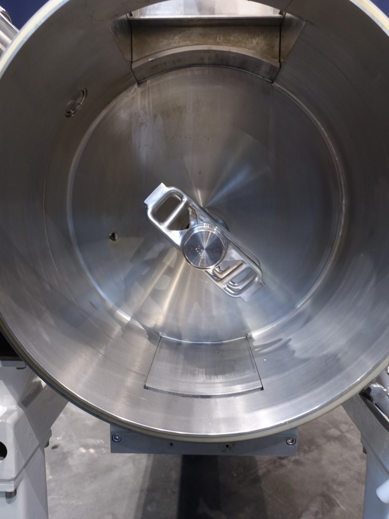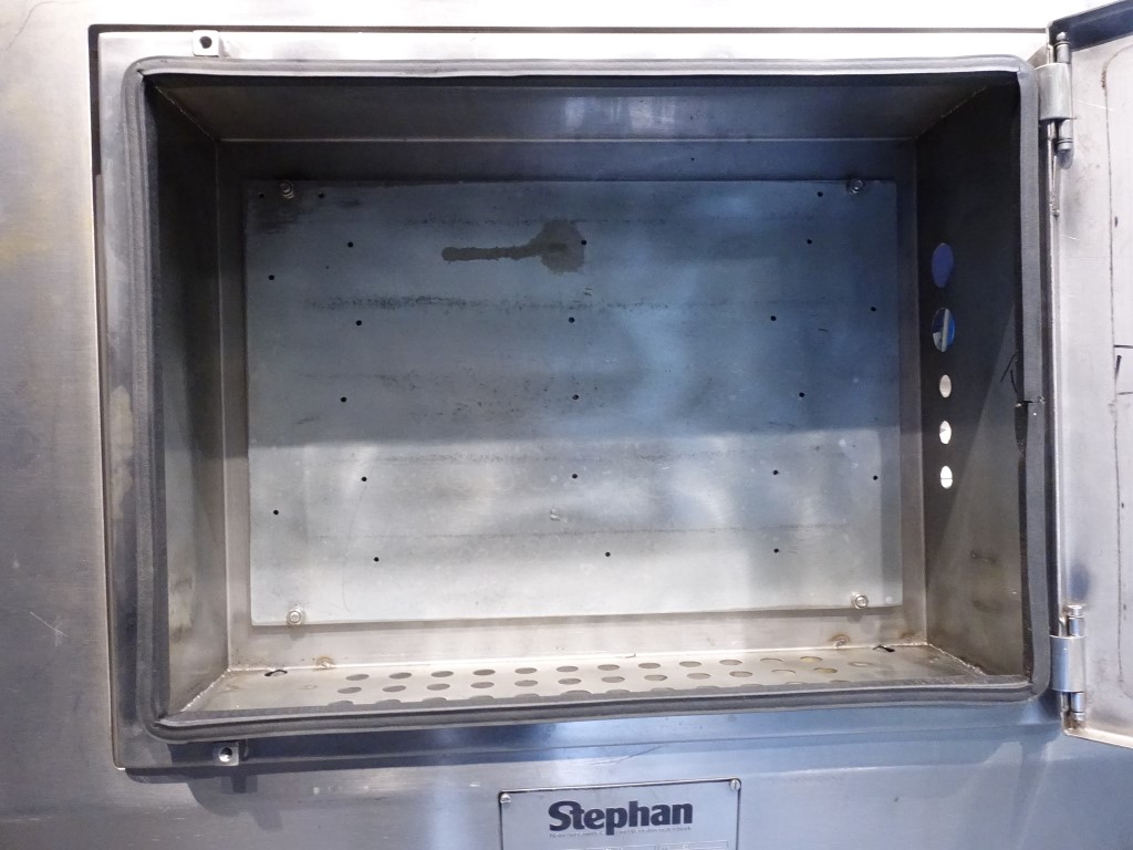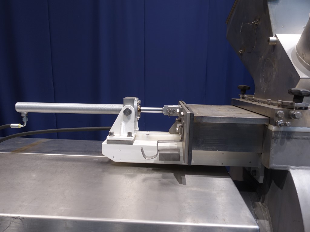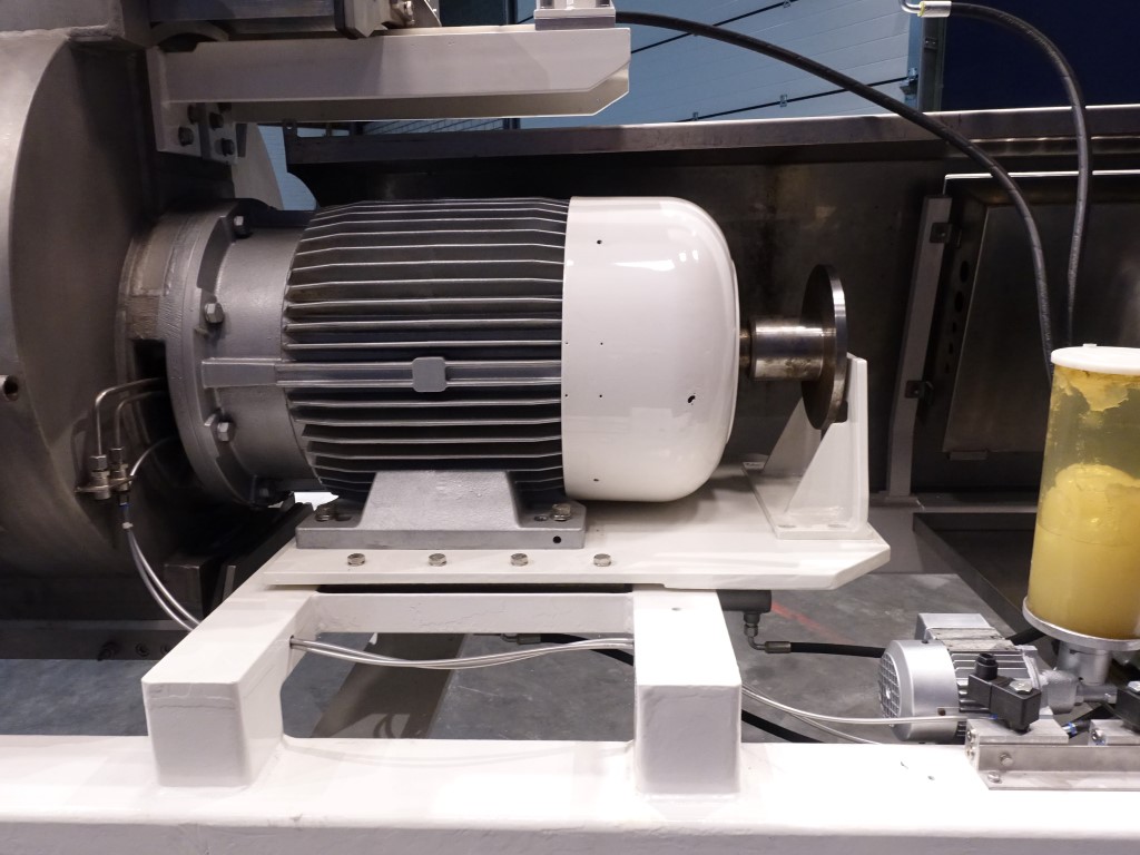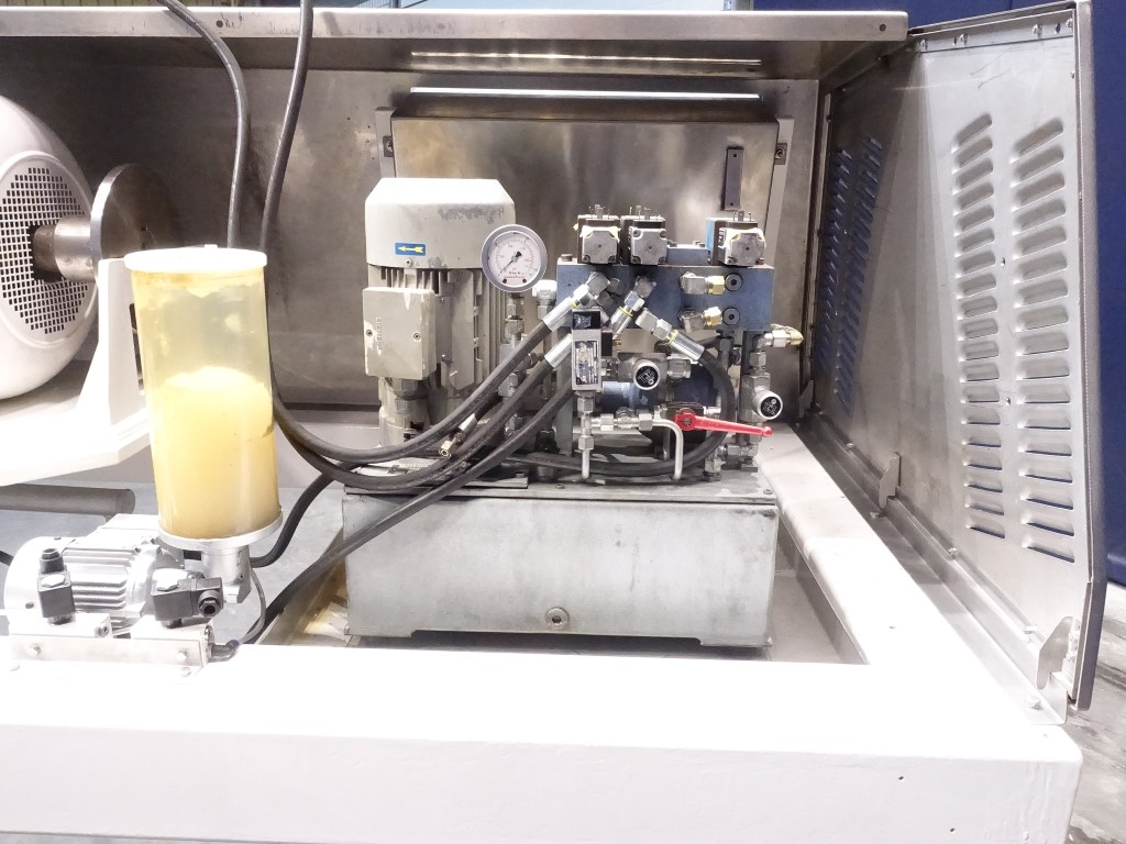 Universal horizontal mixer. The main product bowl and cover are single jackted. Currently no vacuum. Connection for temperature sensor in the bowl. Top and bottom slide for product in/outfeed by a trolley. Hydraulic unit (1,5 kW) for slide opening top and bottom. Grease pump. The main lid has 2 clamps manual tightening and contact sensor. Hopper on the top inlet. Extra product inlet 3'' on the side. 2 Agitators: 1 scraper agitator (4 kW, 25 rpm) and 1 mixer (22 kW - 43 A, 1.000 rpm, no nametag on motor). Painted frame. Excluding: Controls or break claw on main motor. Total dimensions: 1,5 x 3 x 2,6 mtr.