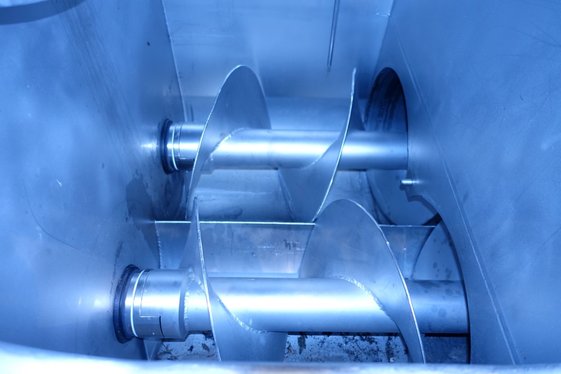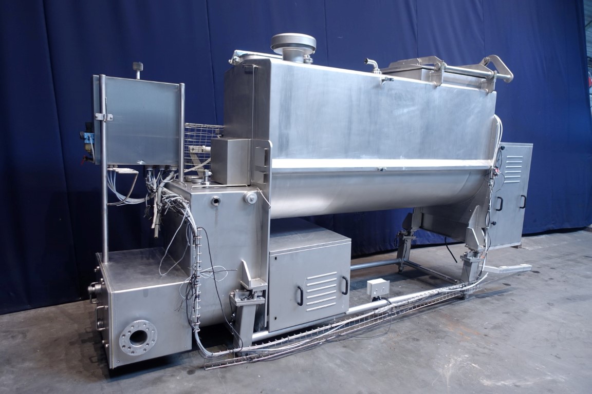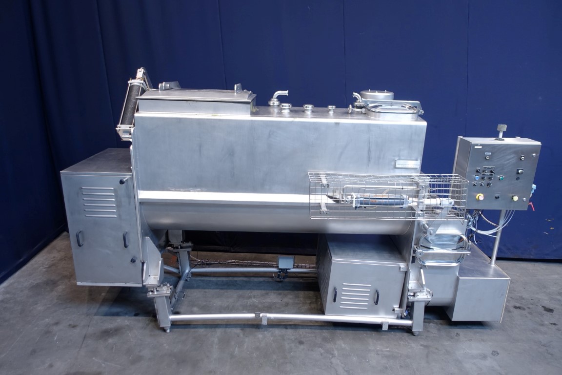 Stainless steel (SS304) ribbon blender (single shaft), previously used for mixing of cheeses in preparation of processed cheese. Main motor for driving ribbon: 15 kW - n2: 42 rpm. Bottom section with 2 outfeed augers with 1 outfeed flange with 1 connections. Motor of augers 4,4 kW - n2: 13 rpm. CIP cleanable with spraybowls. Manhole. Breather. Control panel. Some original drawings available.