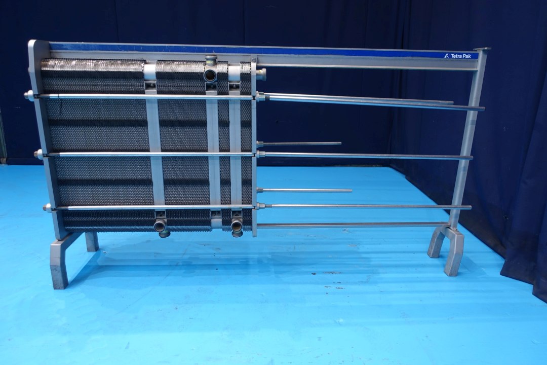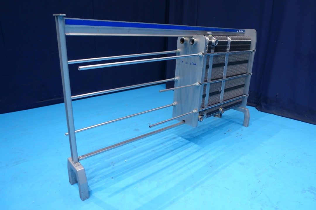 Plate heat exchanger, sanitary (PHE). Dessign pressure: 10,0 bar. Beam length: 240 cm, connections: 16x 2" SMS. Current configuration: 4 Sections: 108-50-10-10 plates, total 178 plates. Connections head: 2 up, follower 2 up. can be used as pasteuriser Total dimensions: 251x37x140 (lxwxh) cm - weight: 598 kg.