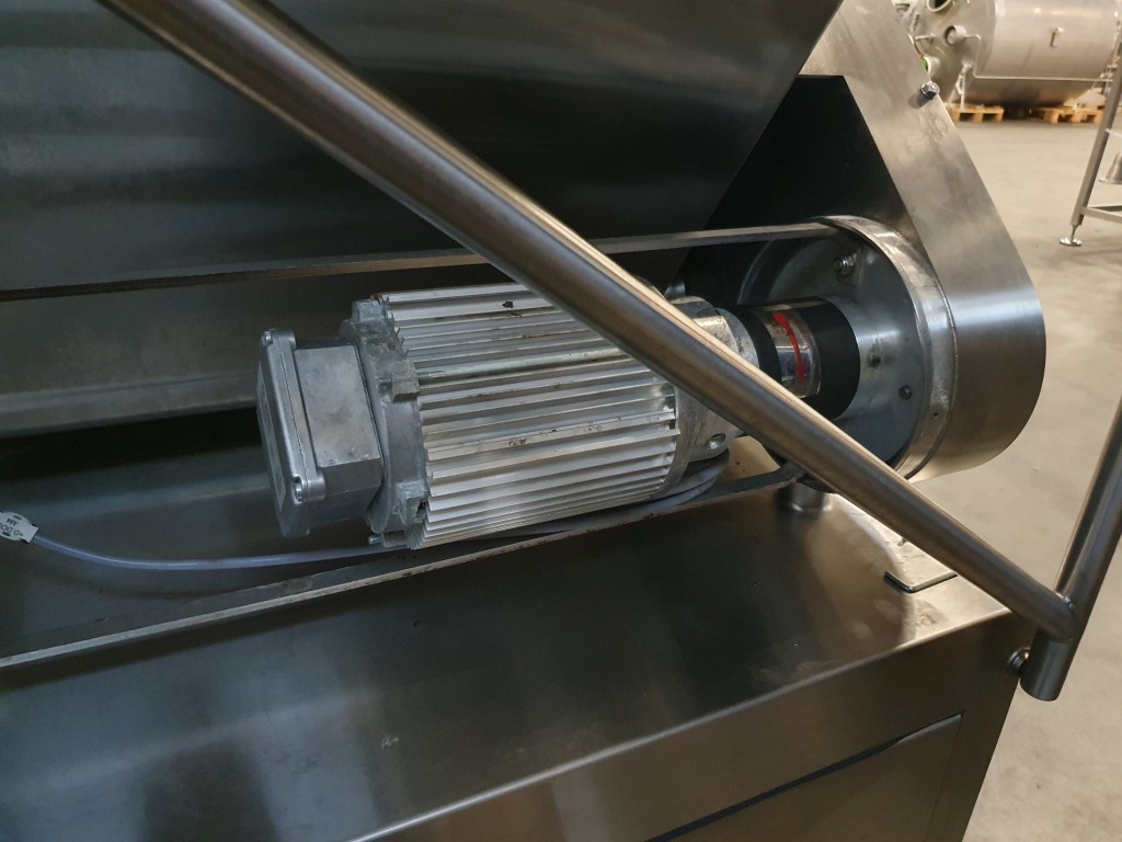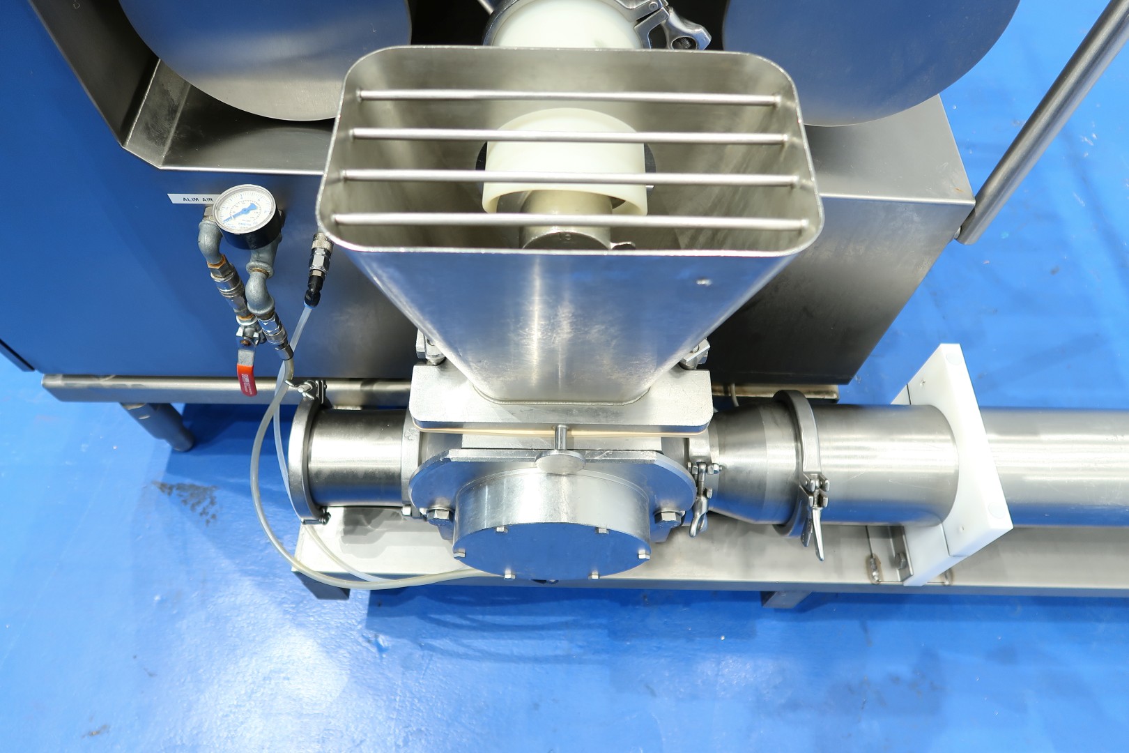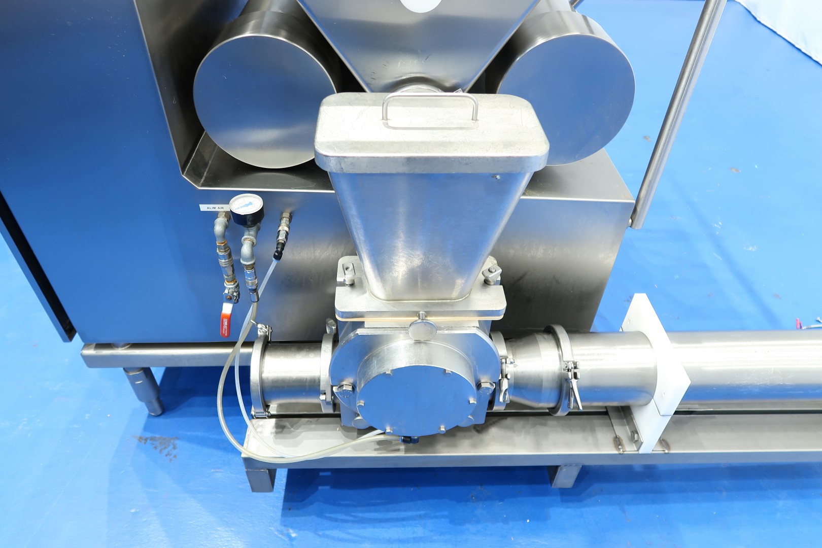 Ingredient doser / Fruit feeder, To add a dry ingredient to a liquid like icecream or butter (this machine). Main components of the unit: 1.) Dosing unit, 2.) Lamella transfer pump, 3.) Horizontal Mixer (used on butter) and 4.) Control panel. Hopper with 1 x SS auger to feed of ingredients to the lamella pump. Product to be dosed can be dry or liquid if it has sufficient viscosity to be retained by the augers. Liquid product capacity 200 - 4.000 liter per hour, dry product capacity 20 - 400 liter per hour. Hopper ± 70 L mounted on 3 weighing/load cells. With inline horizontal mixer. On SS frame with adjustable feet, parts for CIP cleaning. Connections: 2x DN100 Tri-clamp. With documentation (in French). No operation panel (was centralised). Total dimensions: 206x110x163 (lxwxh) cm - weight: 237 kg.