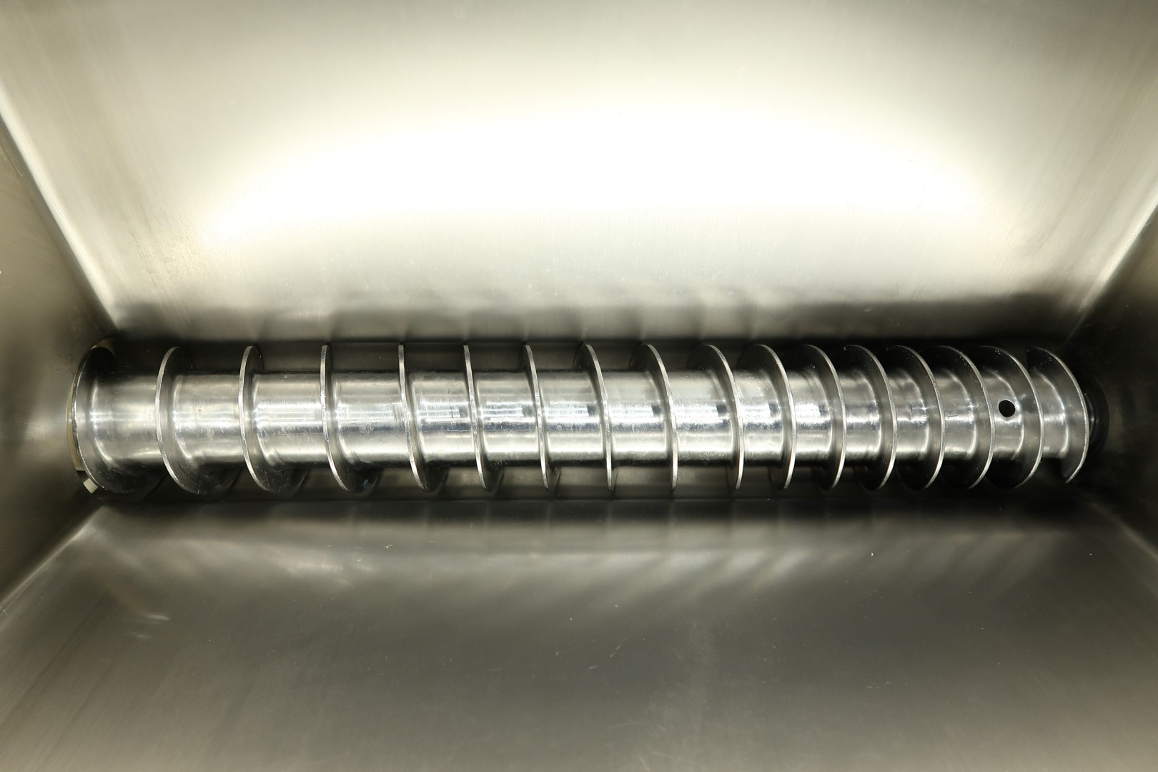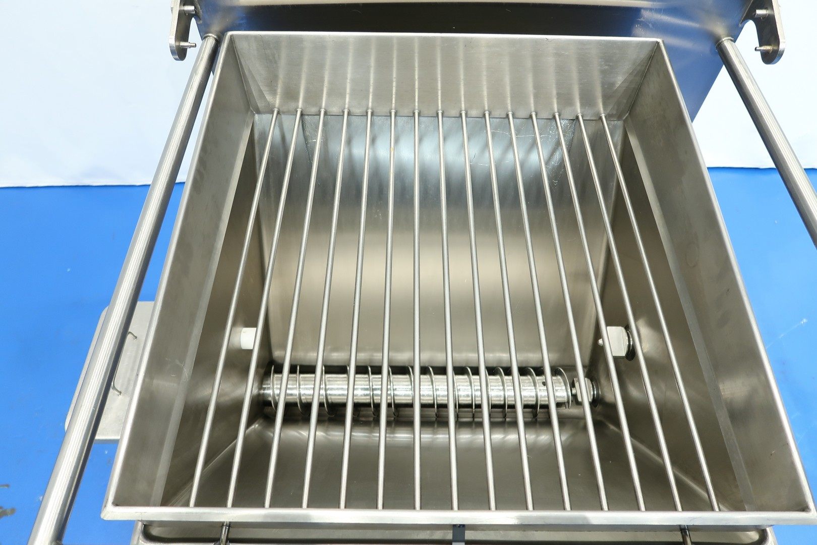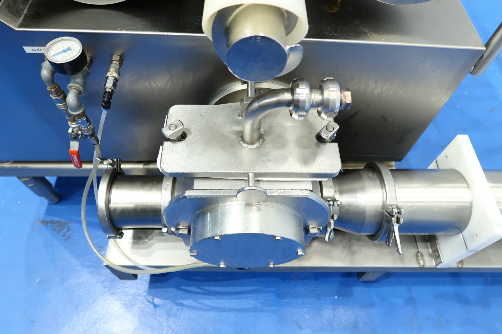 Ingredient doser / Fruit feeder, To add a dry ingredient to a liquid like icecream or butter (this machine). Main components of the unit: 1.) Dosing unit, 2.) Lamella transfer pump, 3.) Horizontal Mixer (used on butter) and 4.) Control panel. Hopper with 1 x SS auger to feed of ingredients to the lamella pump. Product to be dosed can be dry or liquid if it has sufficient viscosity to be retained by the augers. Liquid product capacity 200 - 4.000 liter per hour, dry product capacity 20 - 400 liter per hour. Hopper ± 70 L mounted on 3 weighing/load cells. With inline horizontal mixer. On SS frame with adjustable feet, parts for CIP cleaning. Connections: 2x DN100 Tri-clamp. With documentation (in French). No operation panel (was centralised). Total dimensions: 206x110x163 (lxwxh) cm - weight: 237 kg.