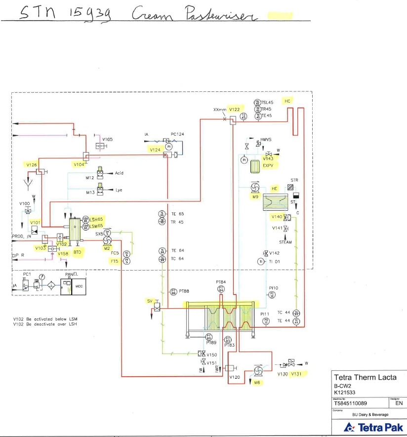 Cream pasteuriser skid mounted, model: Tetra Therm skid mounted with balance tank, centrifugal pumps (feed and booster pump), holding tube and Alfa Laval C6 plate heat exchanger 3 sections, regeneration, heating and cooling by icewater. Thermal cycle: 55-95-4°C, steam valves, steam hotwater heatexchanger, water pump, sensors, control box with temperature recorder. P&ID available and documentation (component information) included. Dimensions skid: 260x160x236 (lxwxh) cm - weight: 559 kg - plate heat exchanger weight: 431 kg.