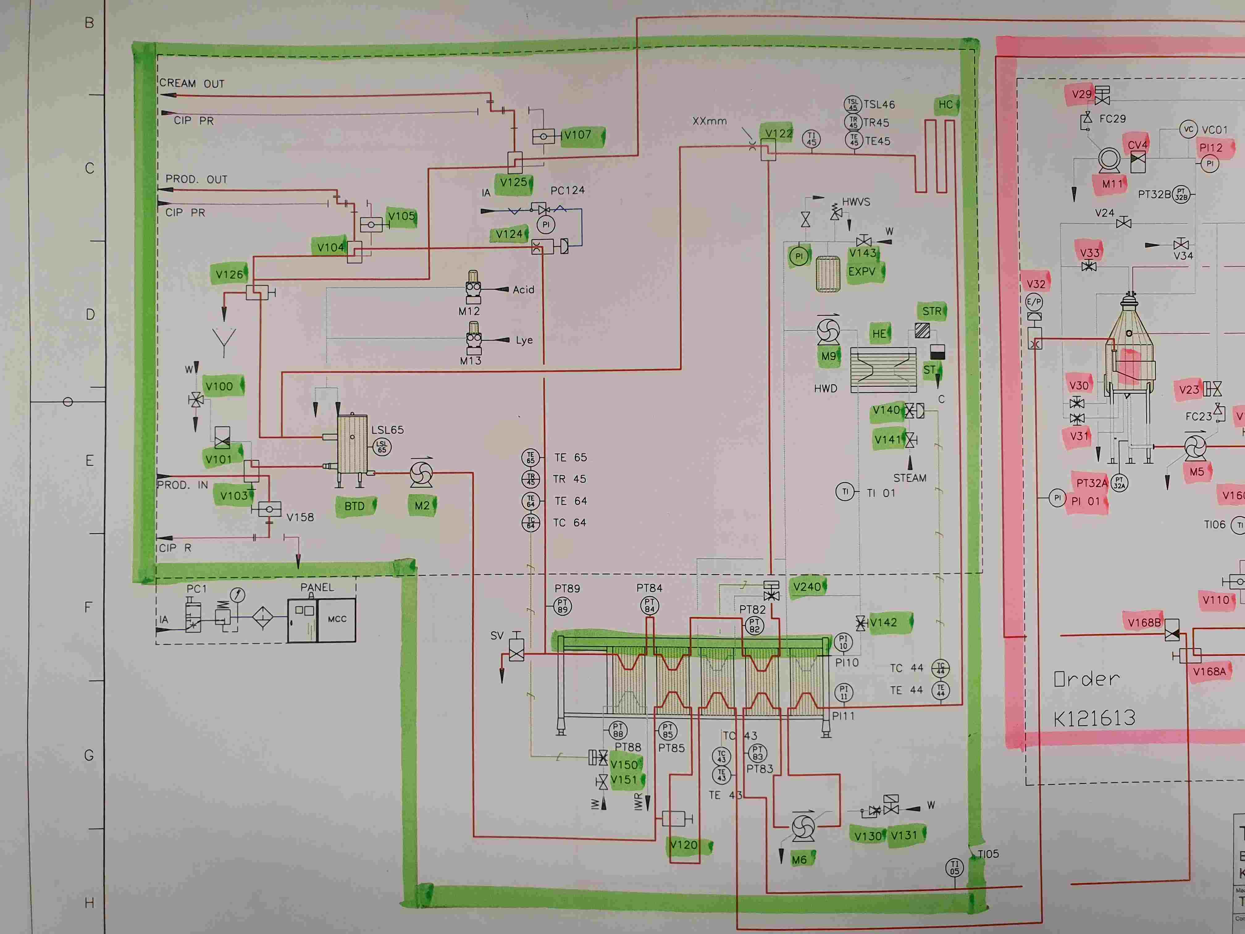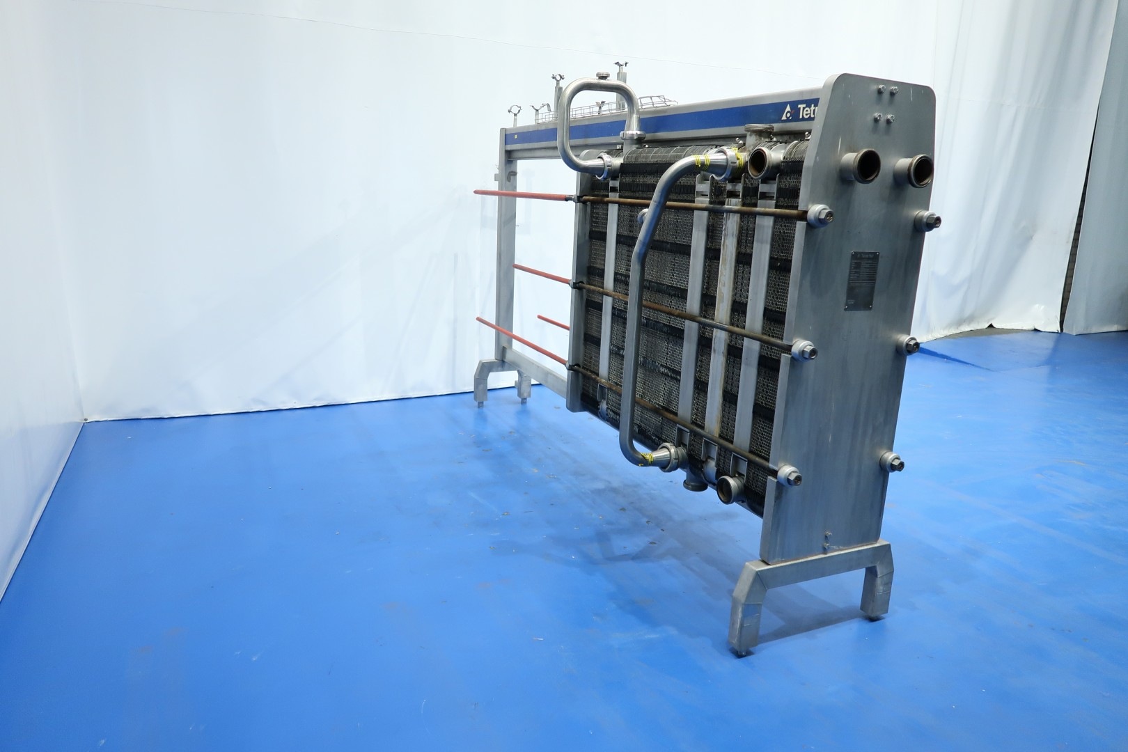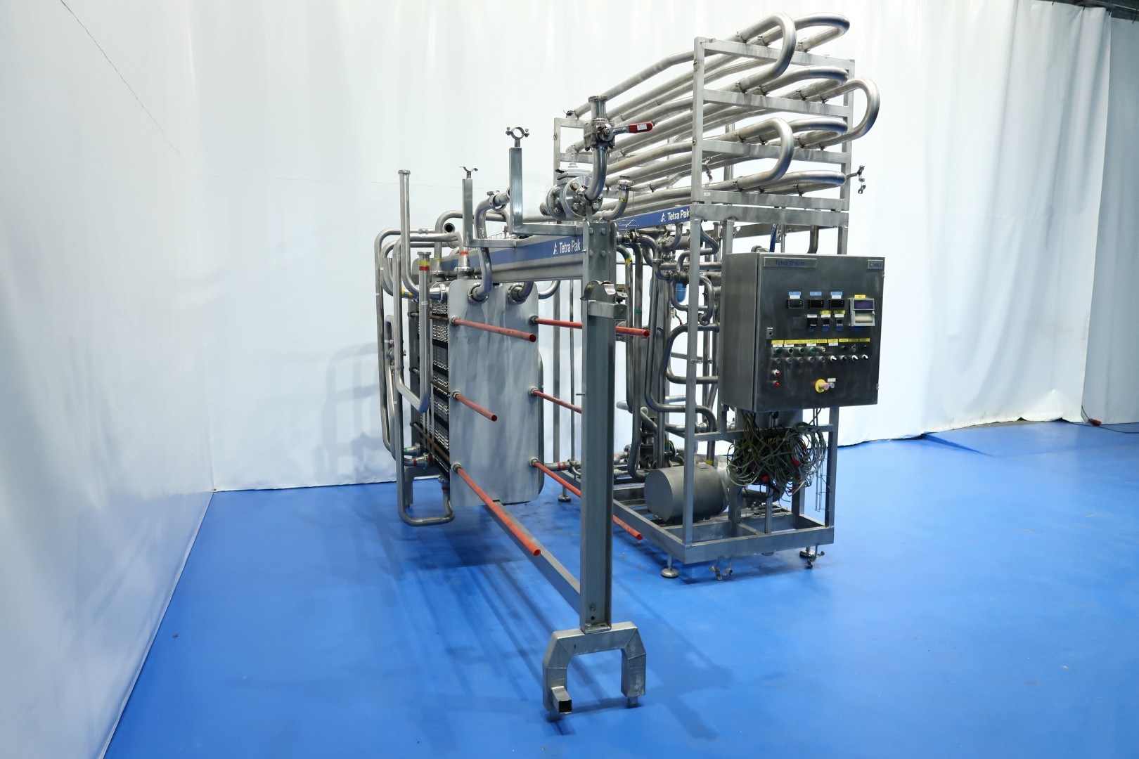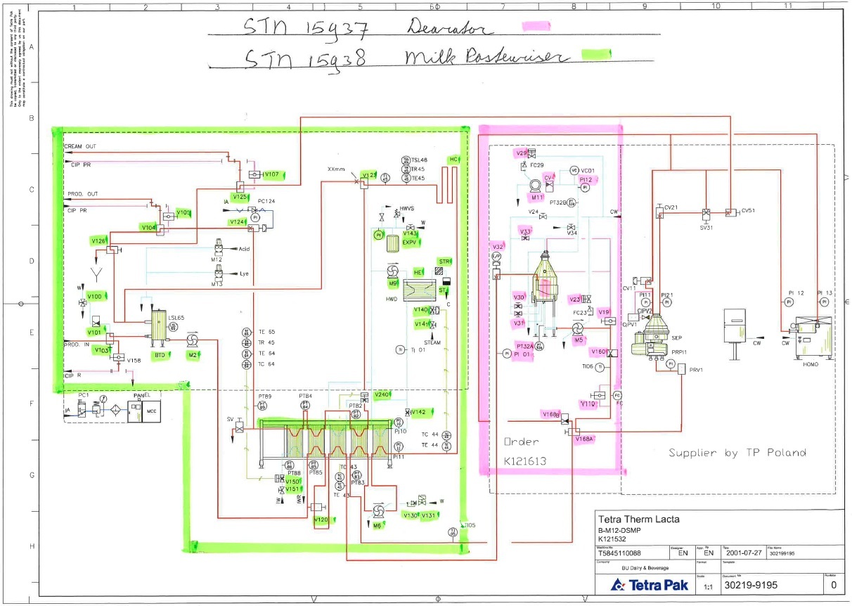 Milk pasteuriser skid mounted, Model Tetra Therm lacta with balance tank, pumps (1 x flushed seal), holding and Alfa Laval C8-SR plate heat exchanger, 4 sections, thermal cycle 4-55 (out separator)-65 (out deaerator)-75 (holding)-4°C. P&ID and documentation: electrical diagram included. Dimensions skid: 250x110x300 (lxwxh) cm weight: 605 kg - plate heat exchanger weight: 1.571 kg.