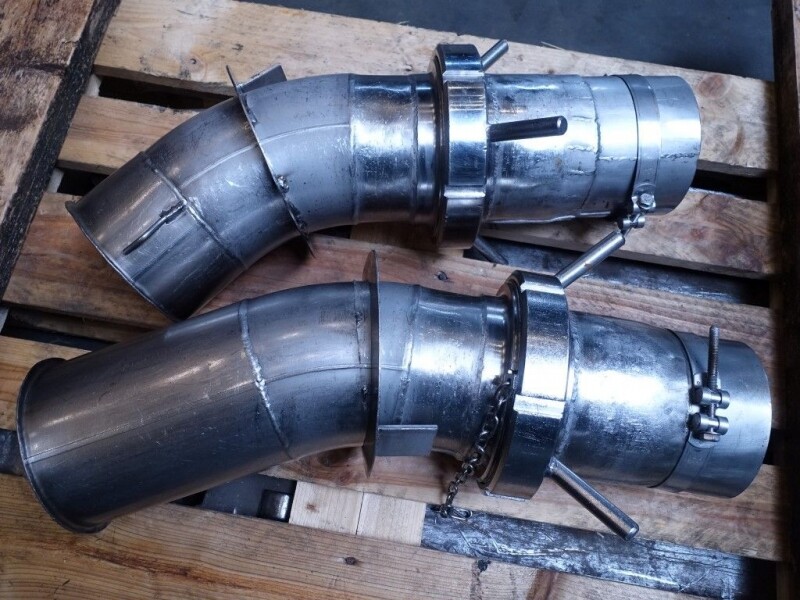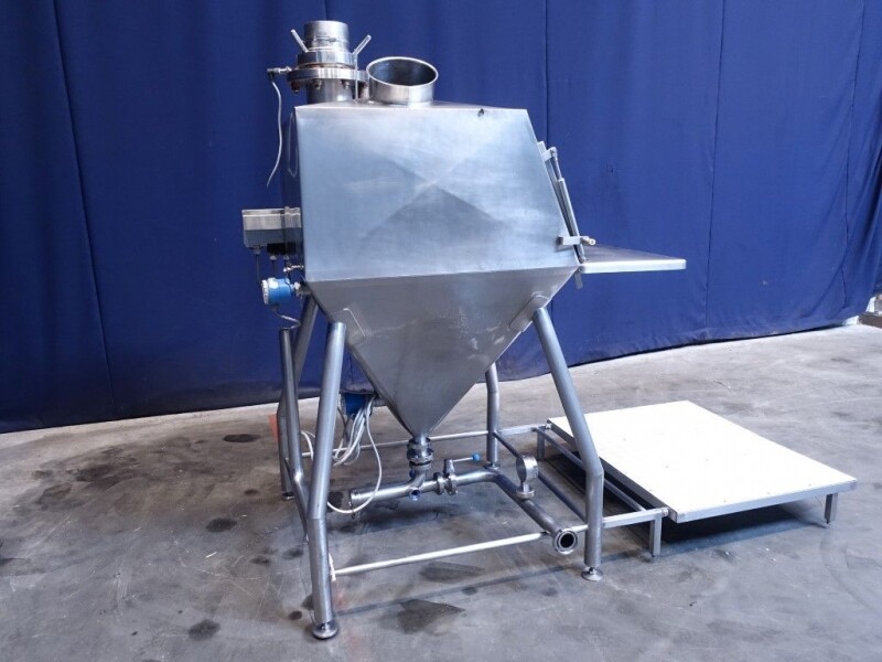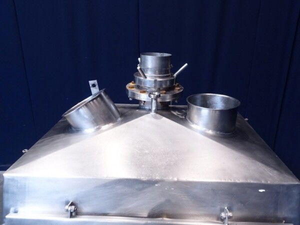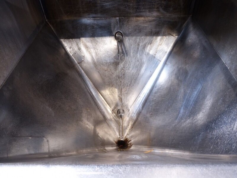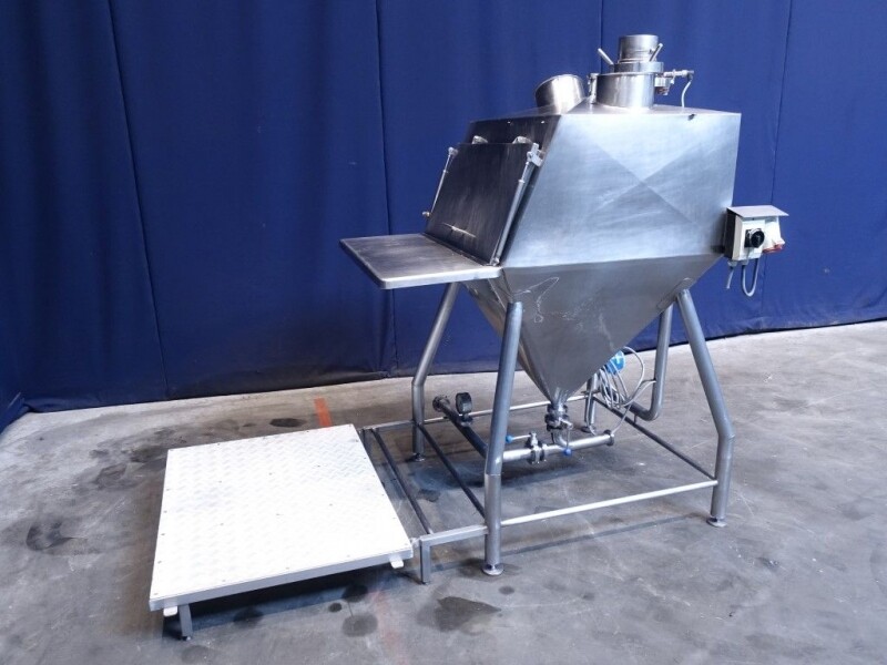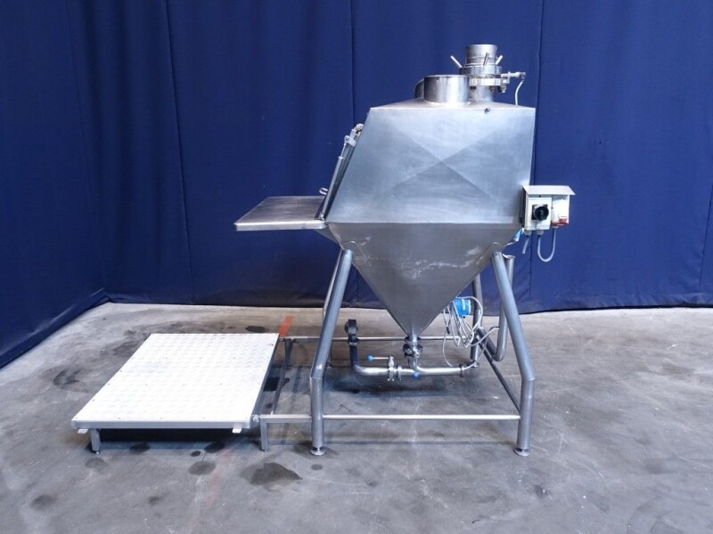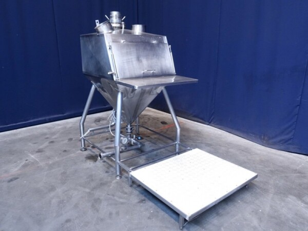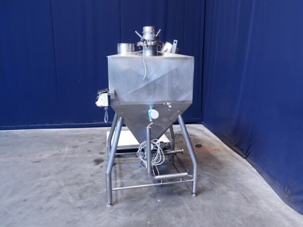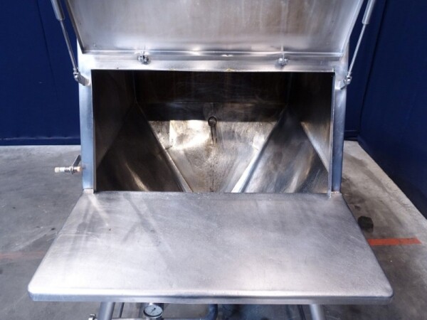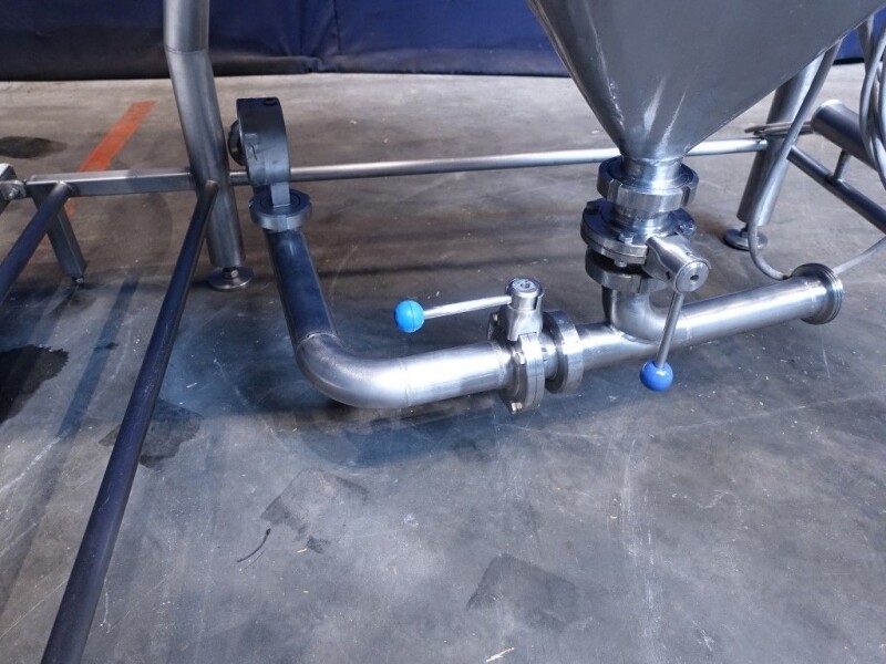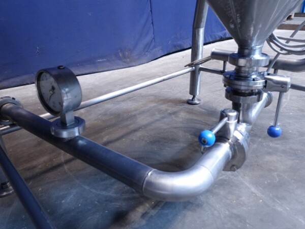 Trechter die gebruikt kan worden als een poederoplosser. Inclusief 2’’ handmatige vlinderkleppen. 1 analoge manometer. Gasveren die het mangat omhoog houden waardoor de ingrediënten handmatig kunnen worden toegevoegd. Niveau pennen hoog/laag.