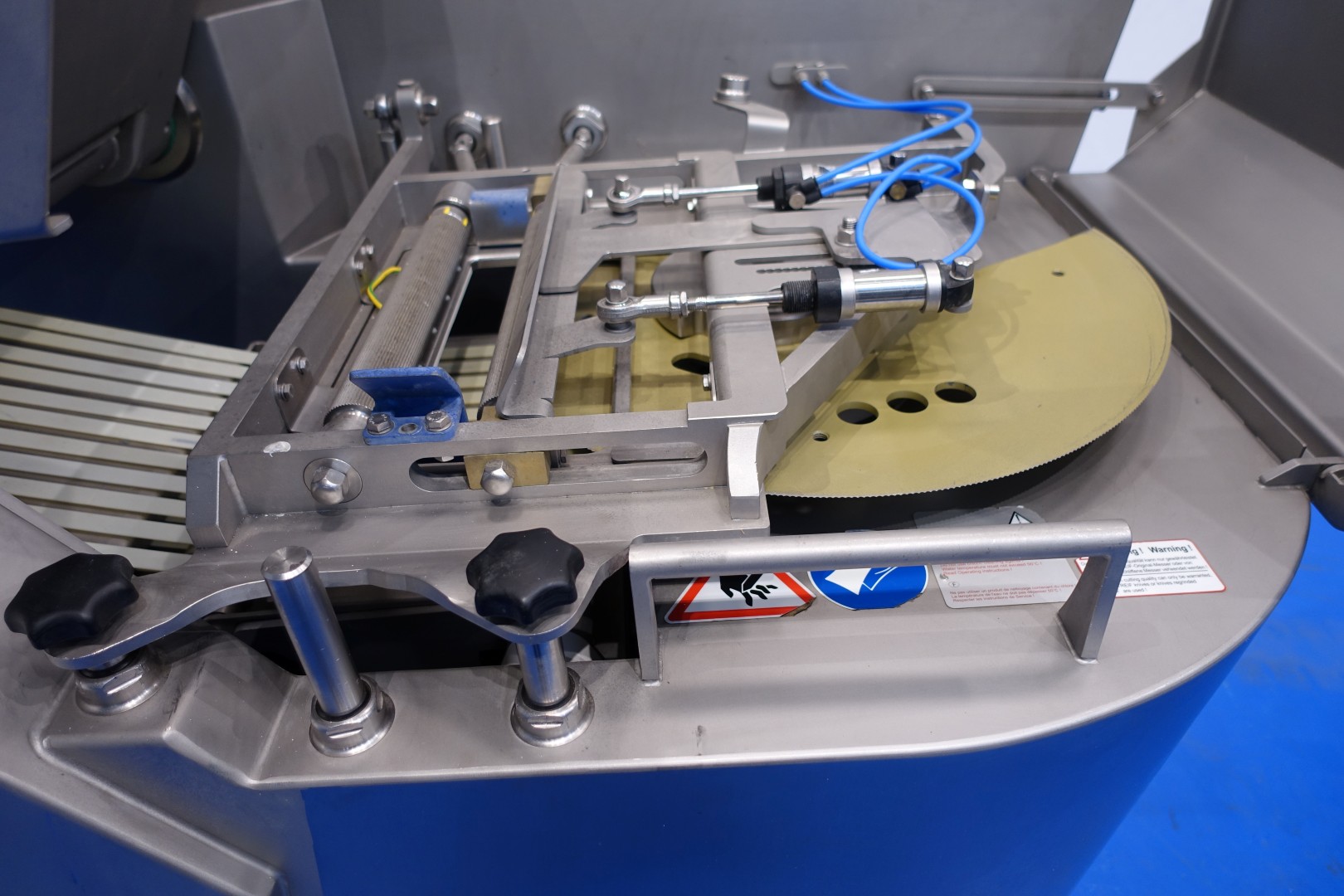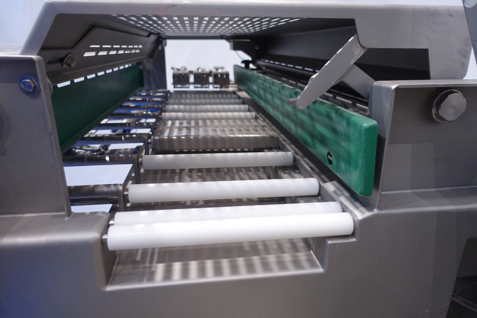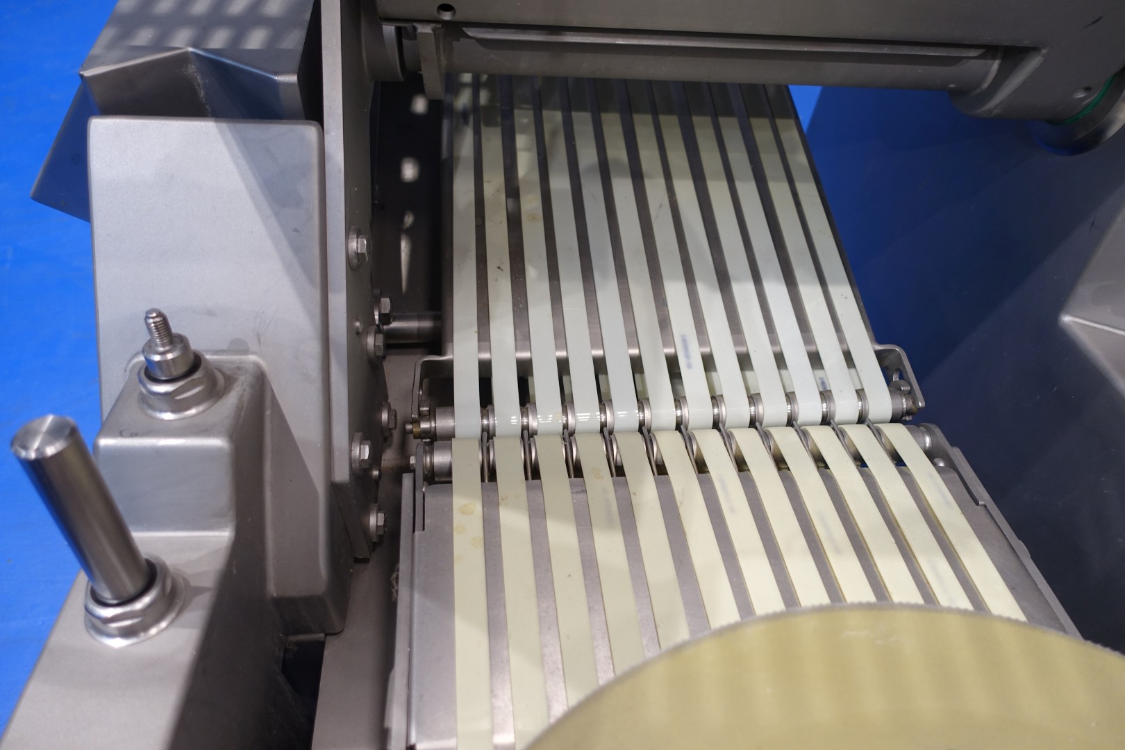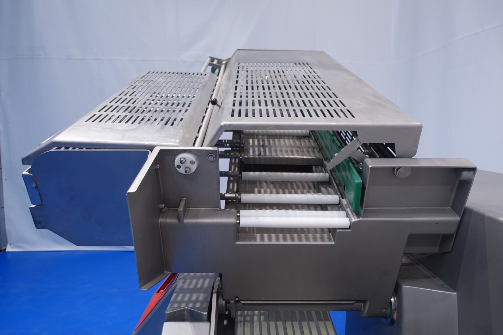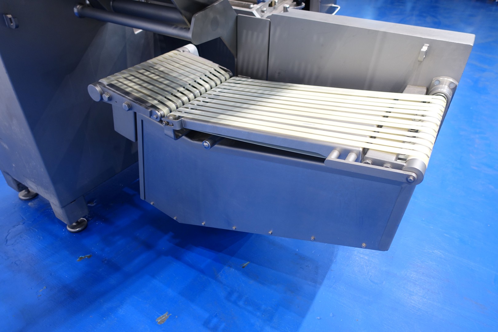 Cheese Slicer with automatic loading for all types of (semi) hard cheeses but also meat. The machine can be used in different ways stand alone or in production lines. Capacity up to 3200 cuts / min, slicing thickness range – 0.5 – 25 mm, chamber cross-section – 280 x 160 mm, length of the cut product (max.) – 1200 mm, height after unfolding – 2900, max. cut-off length (mm) 0.5–25, max. stacking height (mm) 100, touchscreen, up to 200 storable cutting programs, cutting statistics, automatic loading, rotatable loading chamber, infeed rollers for optimum guidance of long products. Sorting line with tray feeder for directly transporting products to the packaging machine. Total dimensions (2 parts): 530x180x215 (lxwxh) cm - total weight: 1.978 kg.