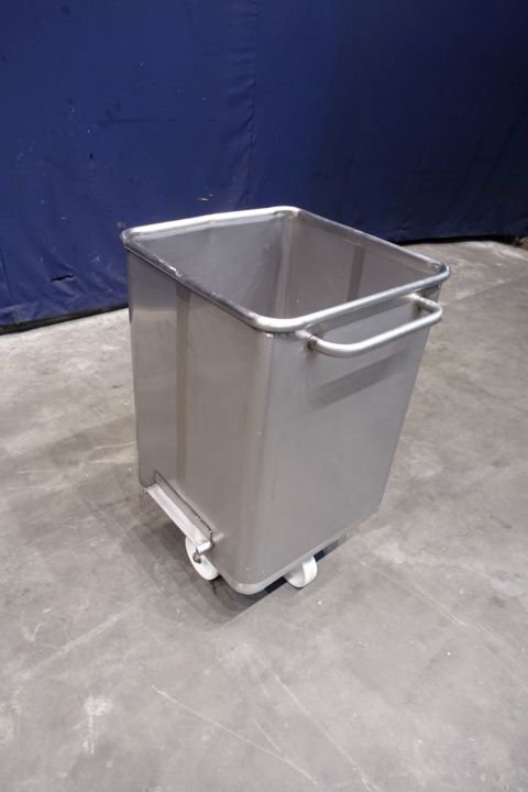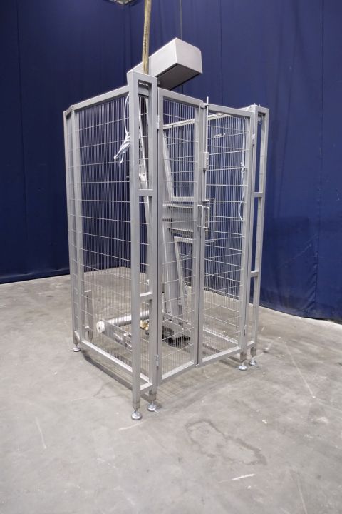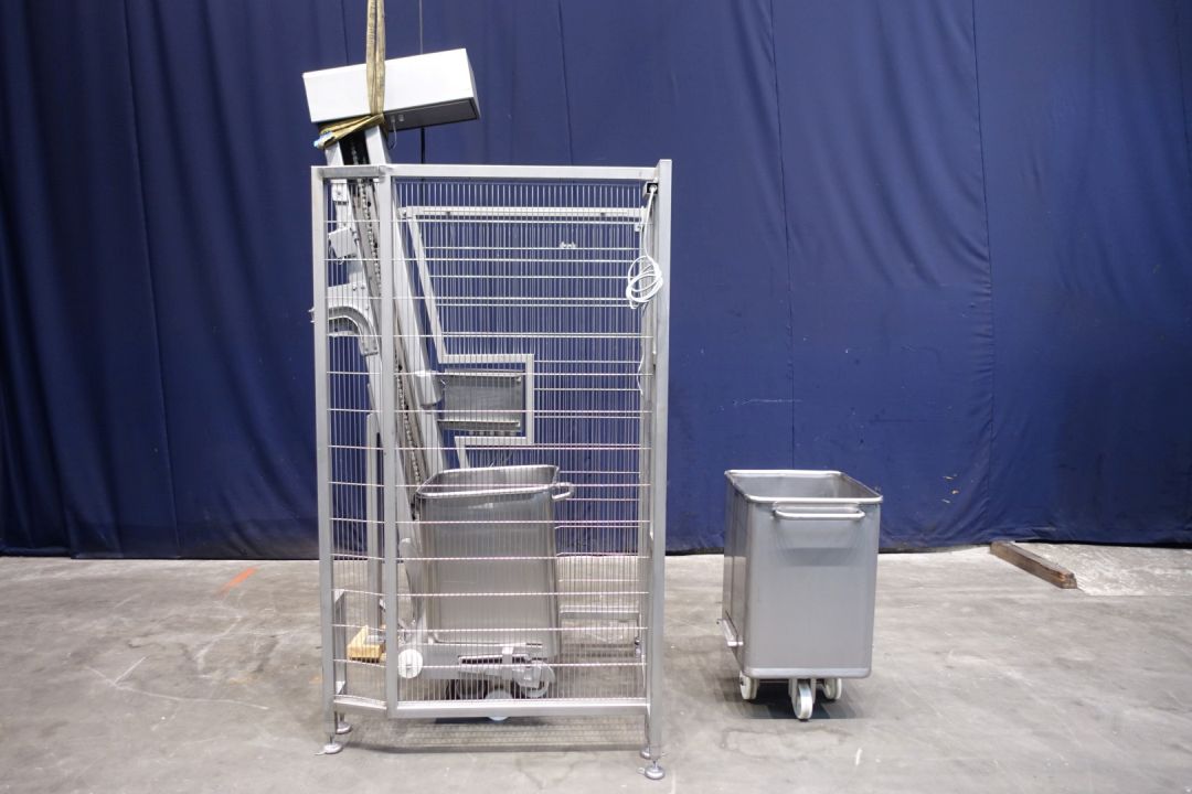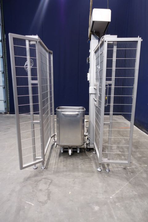 Food bin-norm trolley elevator with safety fence and with 2 x high norm trolley à 200 ltr. Maximum lifting/turning capacity 350 kg. Safety fence with sensors, easy manual button controls. Power: 3x400-230 V / 50 Hz / 10A. Total outside dimensions: 130 x 140 x 290 cm. Has been running with a Stephan 130 cooker machine.