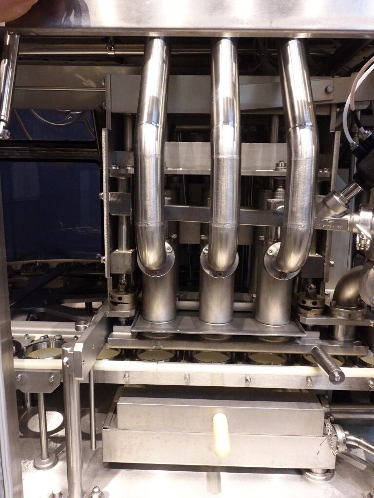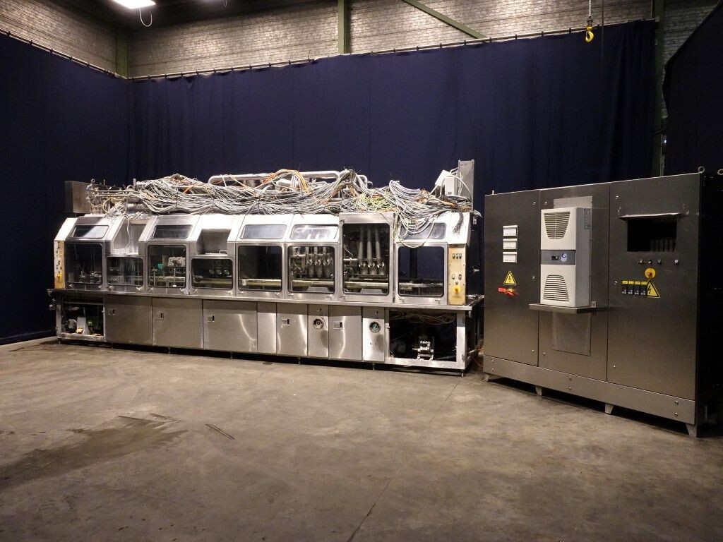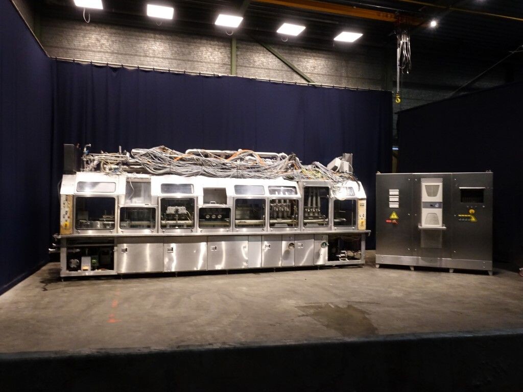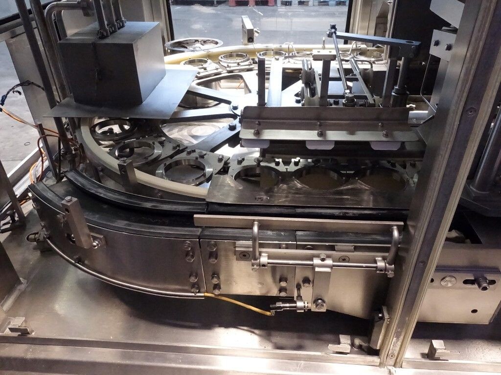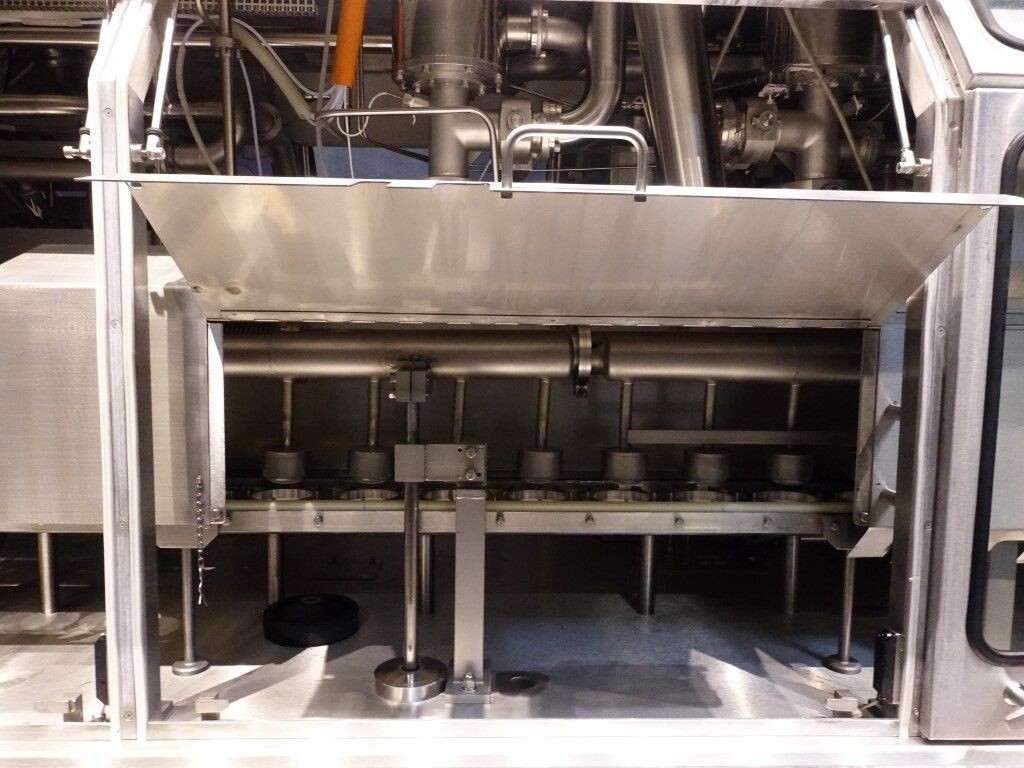 Ultra clean carrouselvuller, 3 kops. Stations: bekerontstapel station, geen- of dubbele bekerdetectie door sensor, bekerontsmetting door peroxide (H2O2) in 5 stappen. Voordoseersysteem (80 - 275 ml), hoofddoseersysteem (125 - 575 ml), nadoseersysteem (80 - 275 ml). Alle stations zijn CIP reinigbaar. seal ontkieming door peroxide (H2O2), doseren door middel van vacuüm. Inclusief hitte sealen, knijpen in de beker tijdens het sealen. Inclusief drukdeksel. Spraysysteem om de ketting en bekerhouders te desinfecteren. De uitvoer is met een enkelbaans transportband van 1,4 meter lang. De machine heeft beschermkappen van polycarbonaat en een automatisch centraal smeersysteem. Het formaat is eenvoudig te wijzigen. De machine heeft een ultra clean ontwerp met een steriel luchtsysteem en sterilisatie door nat peroxide. Besturing: Siemens S5 (geheugenkaart ontbreekt). Het volgende ontbreekt: seal/snap cap houders, HMI scherm, blower en steriel luchtfilter. 1 lucht aanzuigventilator inbegrepen. Inclusief gebruikershandleiding, elektrische handleiding, onderdelenlijst beschikbaar in de Duitse taal.