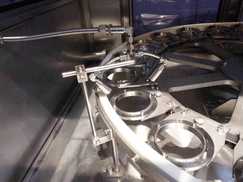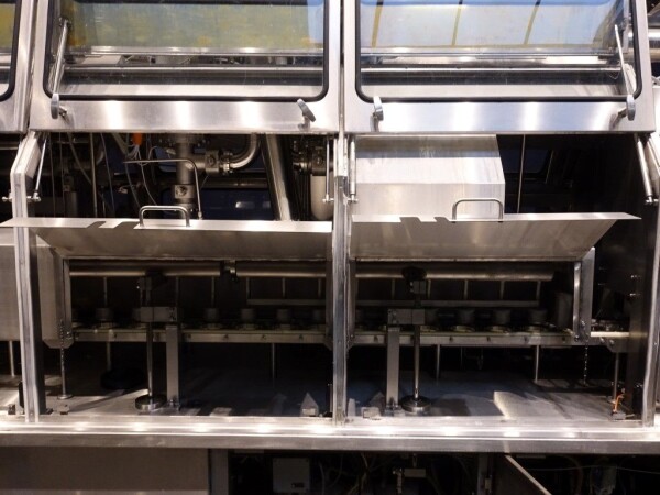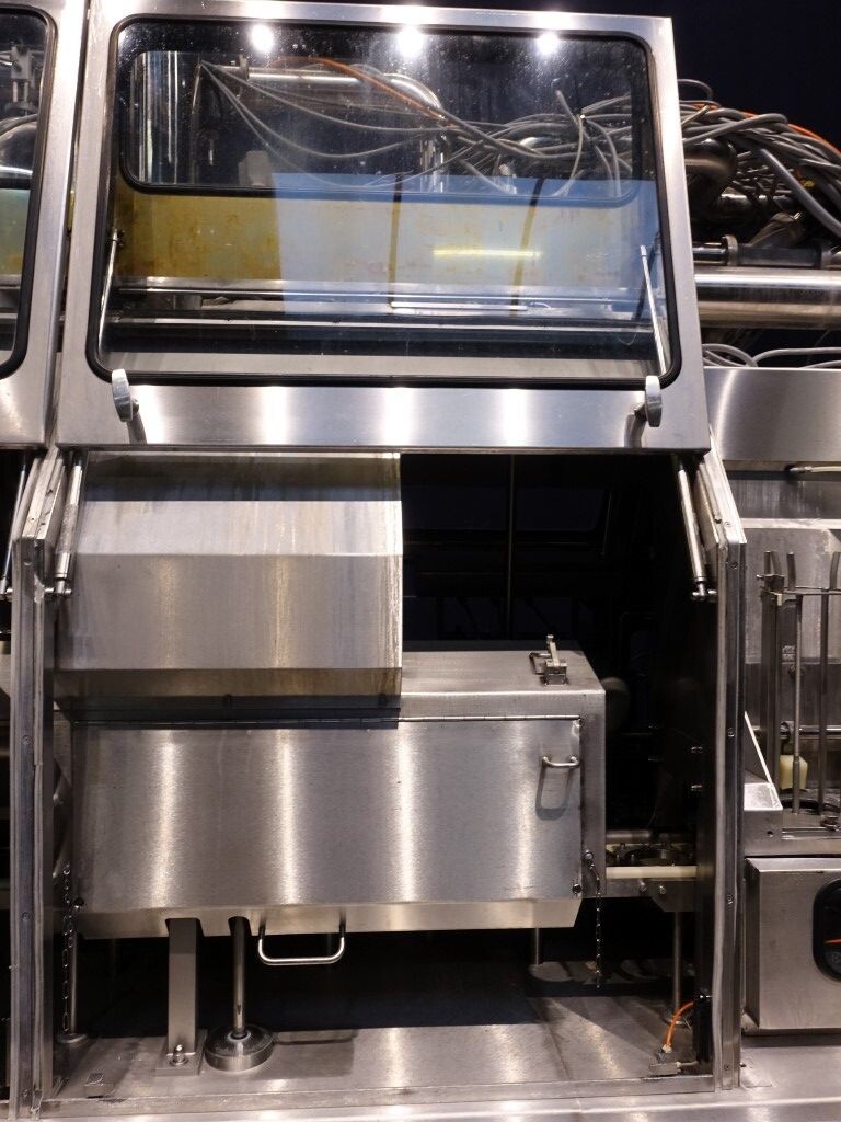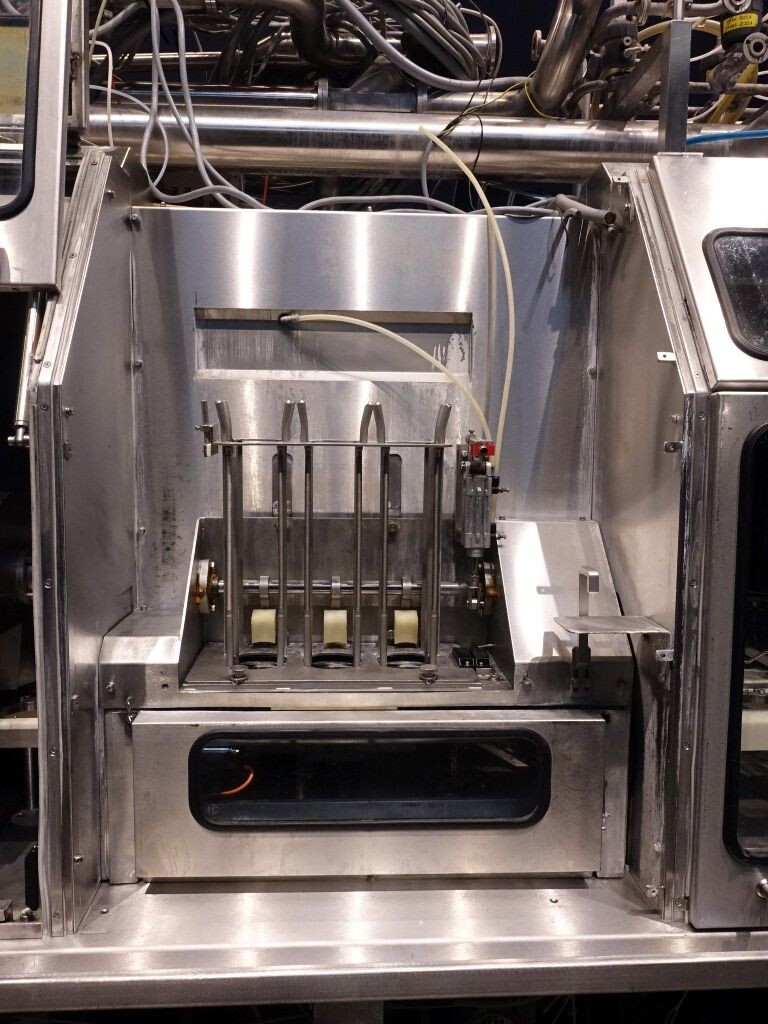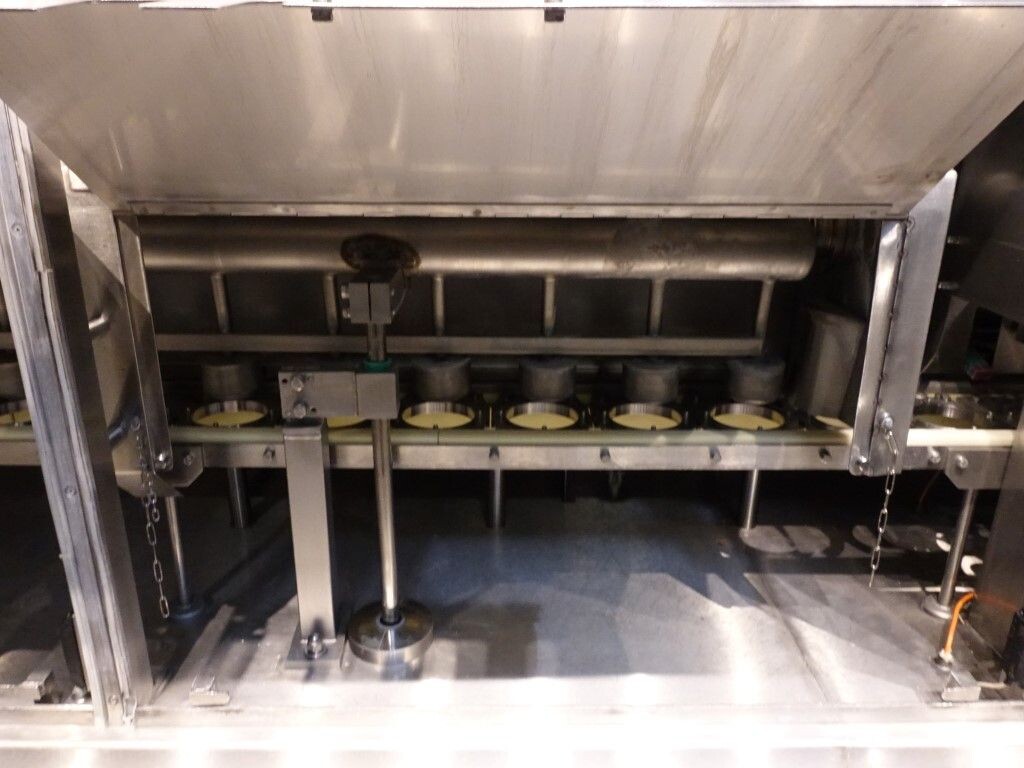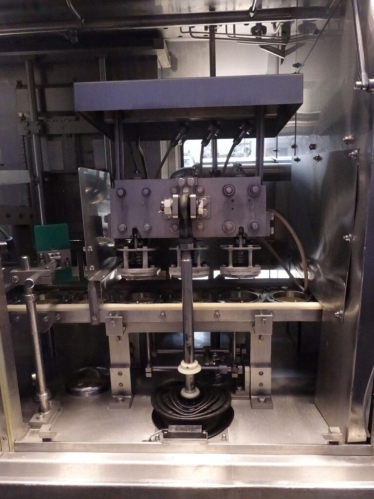 Ultra clean carrouselvuller, 3 kops. Stations: bekerontstapel station, geen- of dubbele bekerdetectie door sensor, bekerontsmetting door peroxide (H2O2) in 5 stappen. Voordoseersysteem (80 - 275 ml), hoofddoseersysteem (125 - 575 ml), nadoseersysteem (80 - 275 ml). Alle stations zijn CIP reinigbaar. seal ontkieming door peroxide (H2O2), doseren door middel van vacuüm. Inclusief hitte sealen, knijpen in de beker tijdens het sealen. Inclusief drukdeksel. Spraysysteem om de ketting en bekerhouders te desinfecteren. De uitvoer is met een enkelbaans transportband van 1,4 meter lang. De machine heeft beschermkappen van polycarbonaat en een automatisch centraal smeersysteem. Het formaat is eenvoudig te wijzigen. De machine heeft een ultra clean ontwerp met een steriel luchtsysteem en sterilisatie door nat peroxide. Besturing: Siemens S5 (geheugenkaart ontbreekt). Het volgende ontbreekt: seal/snap cap houders, HMI scherm, blower en steriel luchtfilter. 1 lucht aanzuigventilator inbegrepen. Inclusief gebruikershandleiding, elektrische handleiding, onderdelenlijst beschikbaar in de Duitse taal.