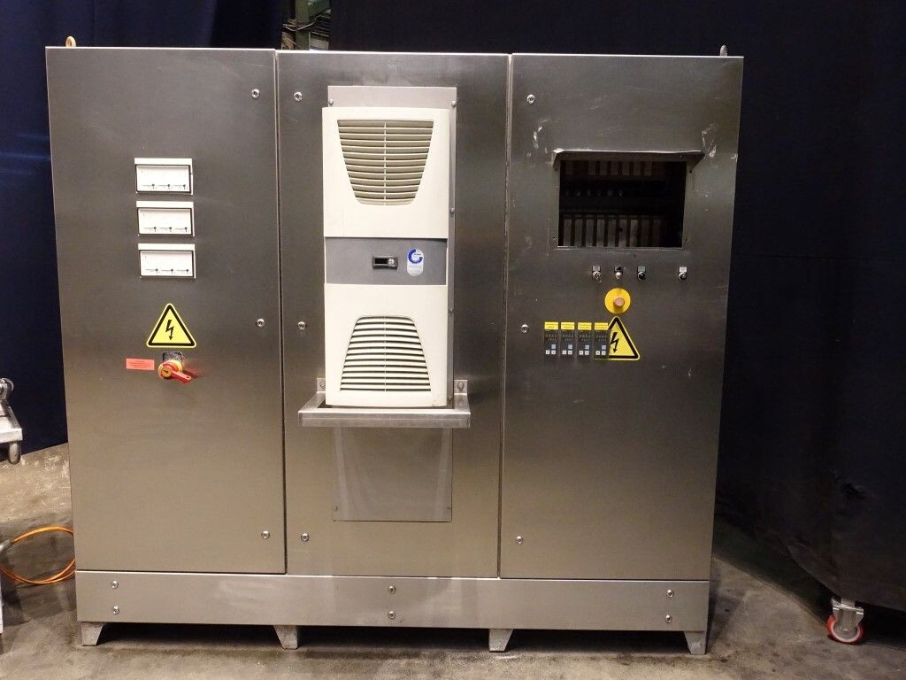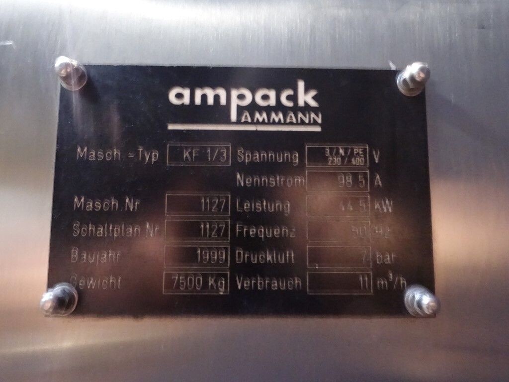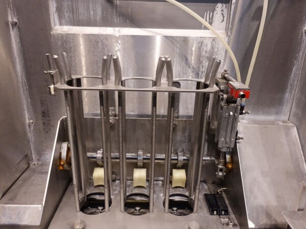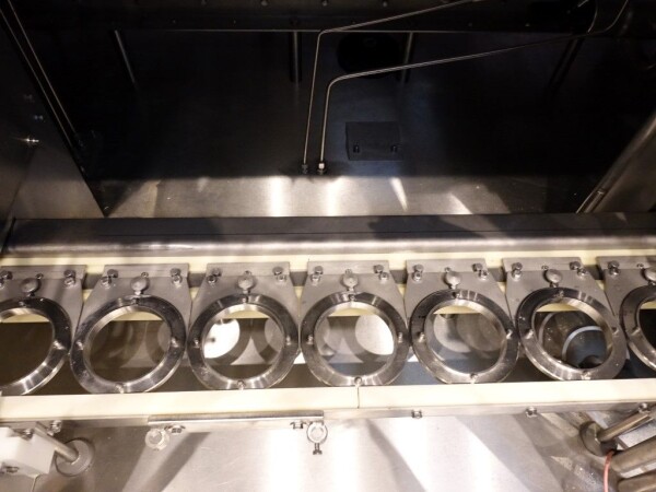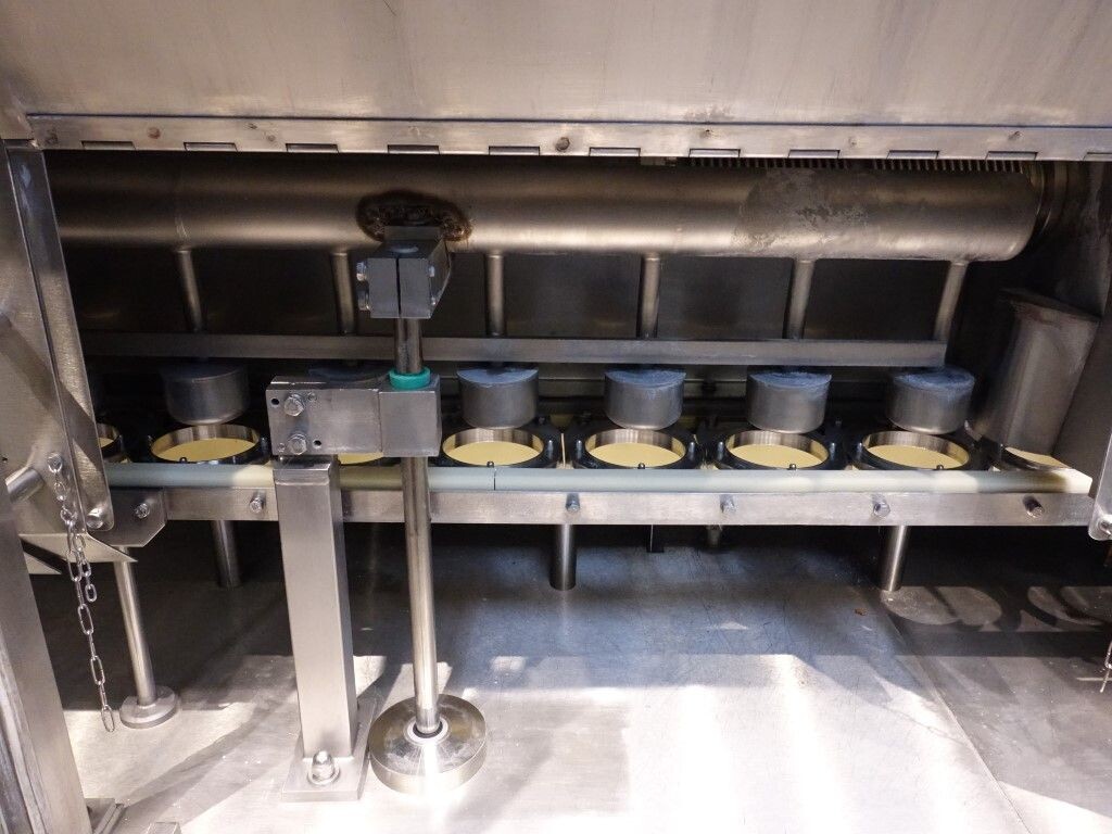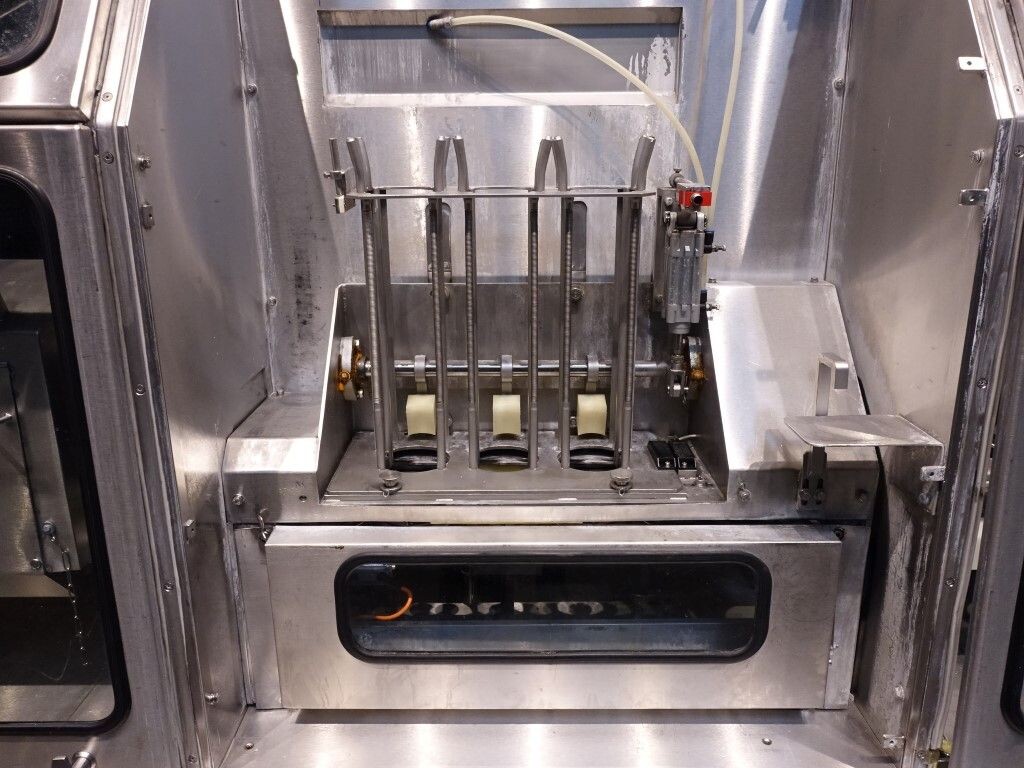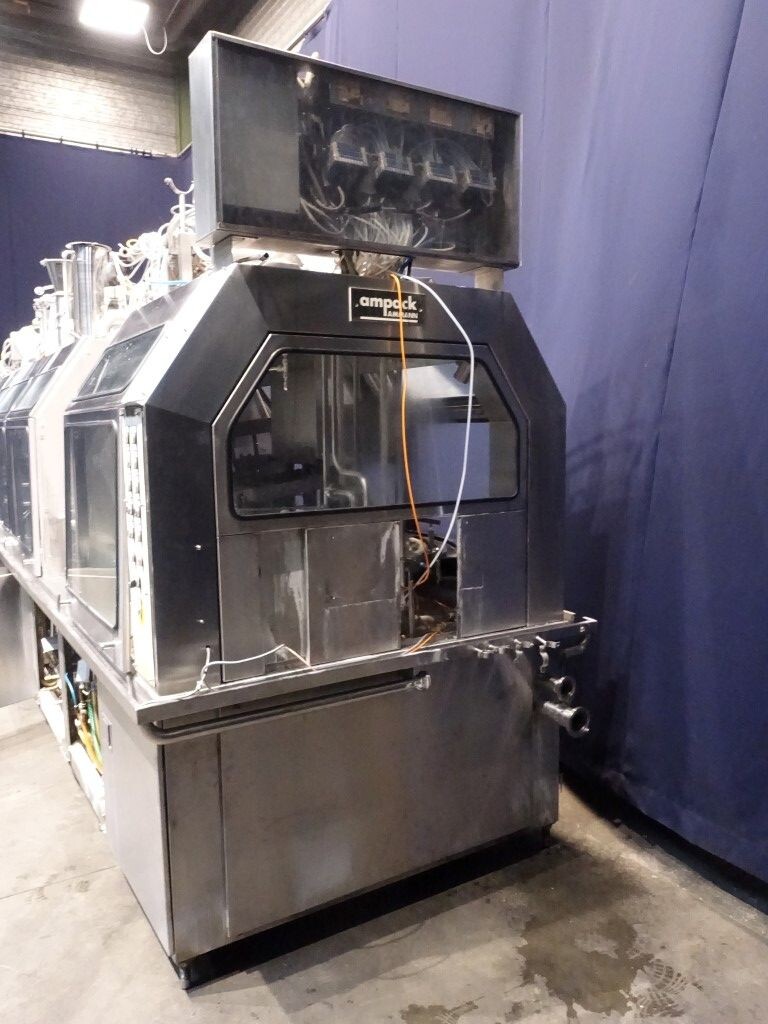 Ultra clean carrouselvuller, 3 kops. Stations: bekerontstapel station, geen- of dubbele bekerdetectie door sensor, bekerontsmetting door peroxide (H2O2) in 5 stappen. Voordoseersysteem (80 - 275 ml), hoofddoseersysteem (125 - 575 ml), nadoseersysteem (80 - 275 ml). Alle stations zijn CIP reinigbaar. seal ontkieming door peroxide (H2O2), doseren door middel van vacuüm. Inclusief hitte sealen, knijpen in de beker tijdens het sealen. Inclusief drukdeksel. Spraysysteem om de ketting en bekerhouders te desinfecteren. De uitvoer is met een enkelbaans transportband van 1,4 meter lang. De machine heeft beschermkappen van polycarbonaat en een automatisch centraal smeersysteem. Het formaat is eenvoudig te wijzigen. De machine heeft een ultra clean ontwerp met een steriel luchtsysteem en sterilisatie door nat peroxide. Besturing: Siemens S5 (geheugenkaart ontbreekt). Het volgende ontbreekt: seal/snap cap houders, HMI scherm, blower en steriel luchtfilter. 1 lucht aanzuigventilator inbegrepen. Inclusief gebruikershandleiding, elektrische handleiding, onderdelenlijst beschikbaar in de Duitse taal.