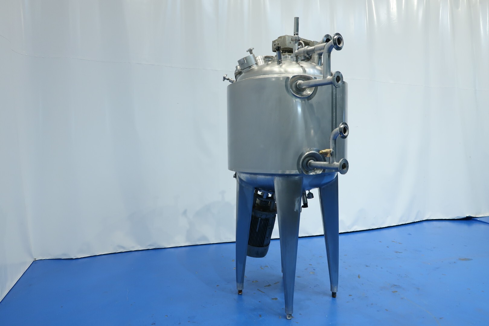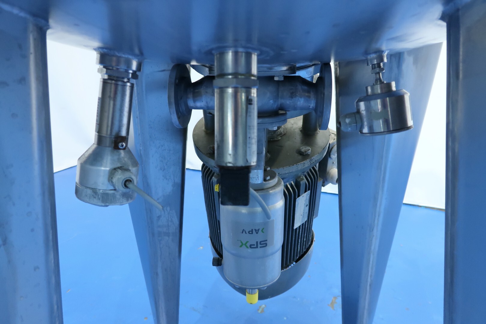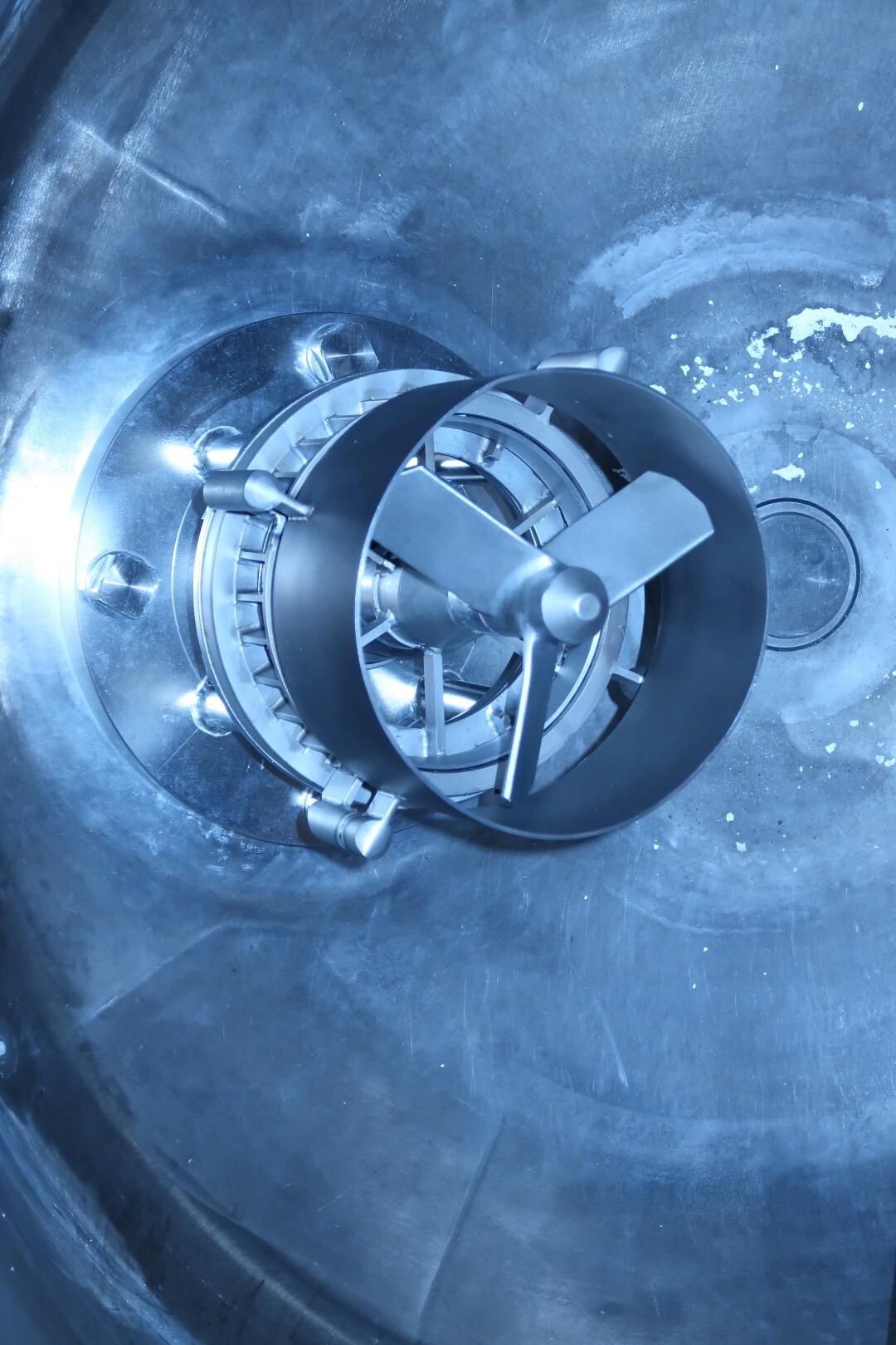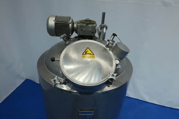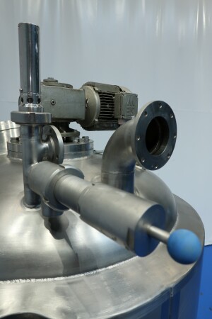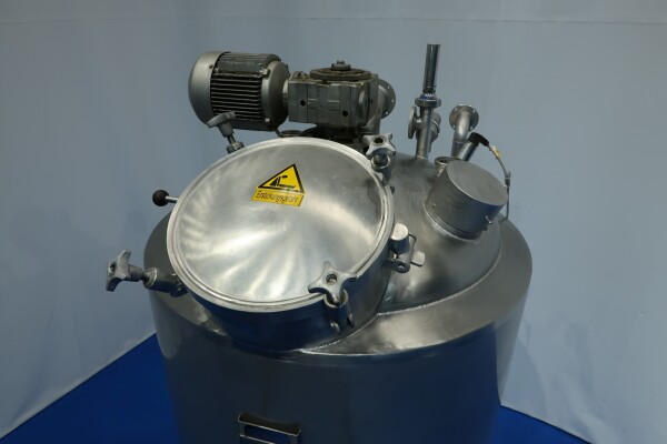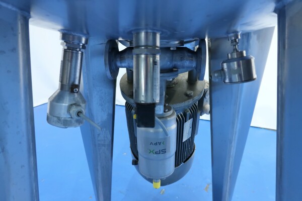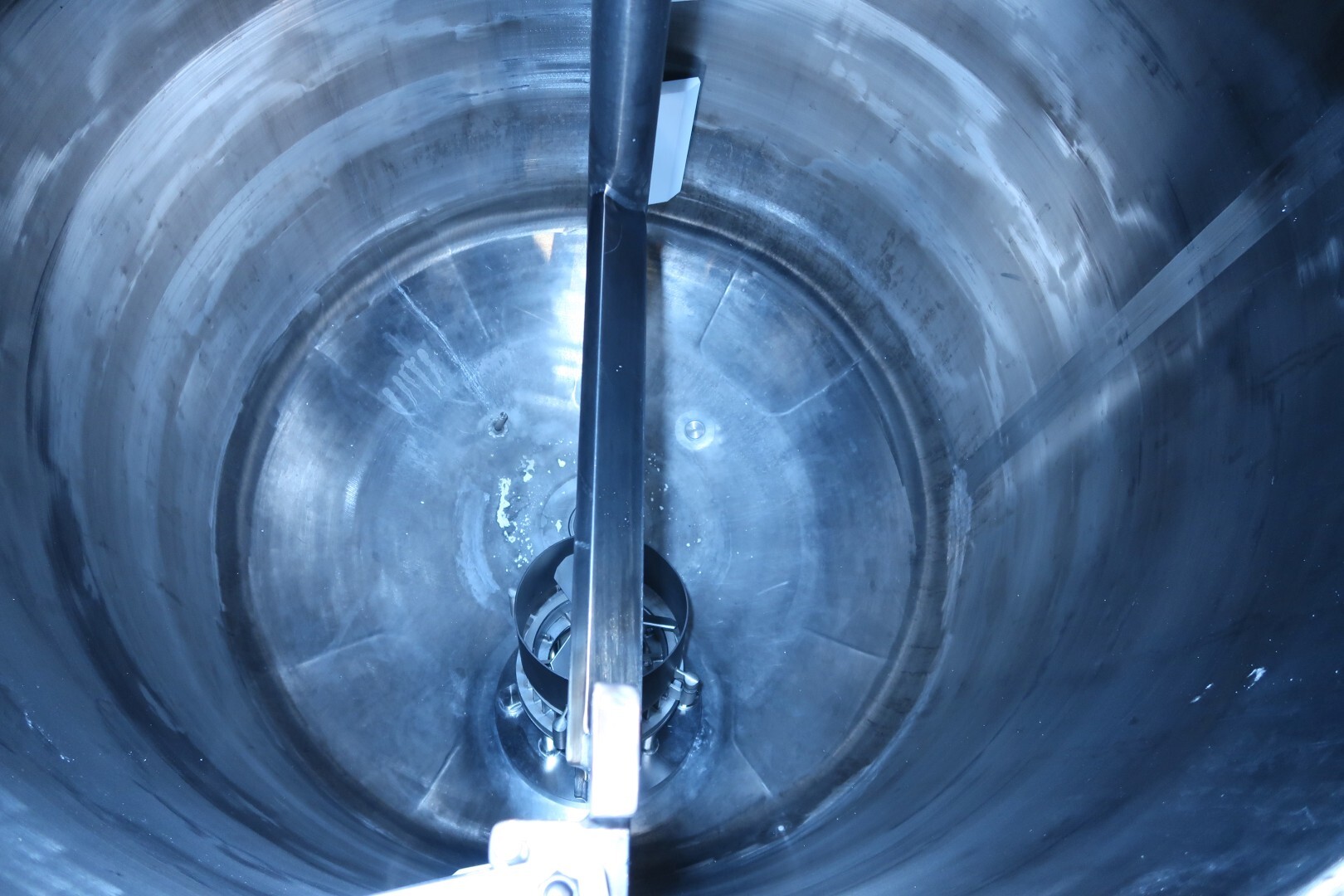 Vacuümprocestank met dubbele mantel voor verwarming en koeling. Uitgerust met twee roerwerken voor optimale menging. Robuuste, snelle rotor/stator-zeef-propellermenger, aangedreven door een 18,5 kW motor met een toerental van 2920 tpm, aangevuld met een schraperroerwerk in het cilindrische gedeelte met een 0,86 kW motor en een maximumtoerental van 32 tpm. De mantel is bestand tegen drukken tot 4 bar, terwijl de tank zelf kan werken onder vacuüm tot -0,8 bar en overdruk tot 0,99 bar, met ingebouwde overdruk- en onderdrukveiligheidskleppen bovenop. De productafvoer wordt eenvoudig geregeld via een 1,5" APV-bodemklep met positiesensor, gemonteerd op een hoogte van 93,5 cm. De tank is tevens uitgerust met een monsternameklep en interne verlichting voor een comfortabele bediening. Nauwkeurige procesbewaking wordt gegarandeerd door druk-, temperatuur- en niveausensoren aan de onderkant, samen met een hoog niveau sensor aan de bovenkant. Twee aansluitingen aan de bovenkant maken CIP-sproeibollen mogelijk (momenteel niet geïnstalleerd). De tank heeft een rond mangat van 272 mm en staat op drie verstelbare poten.