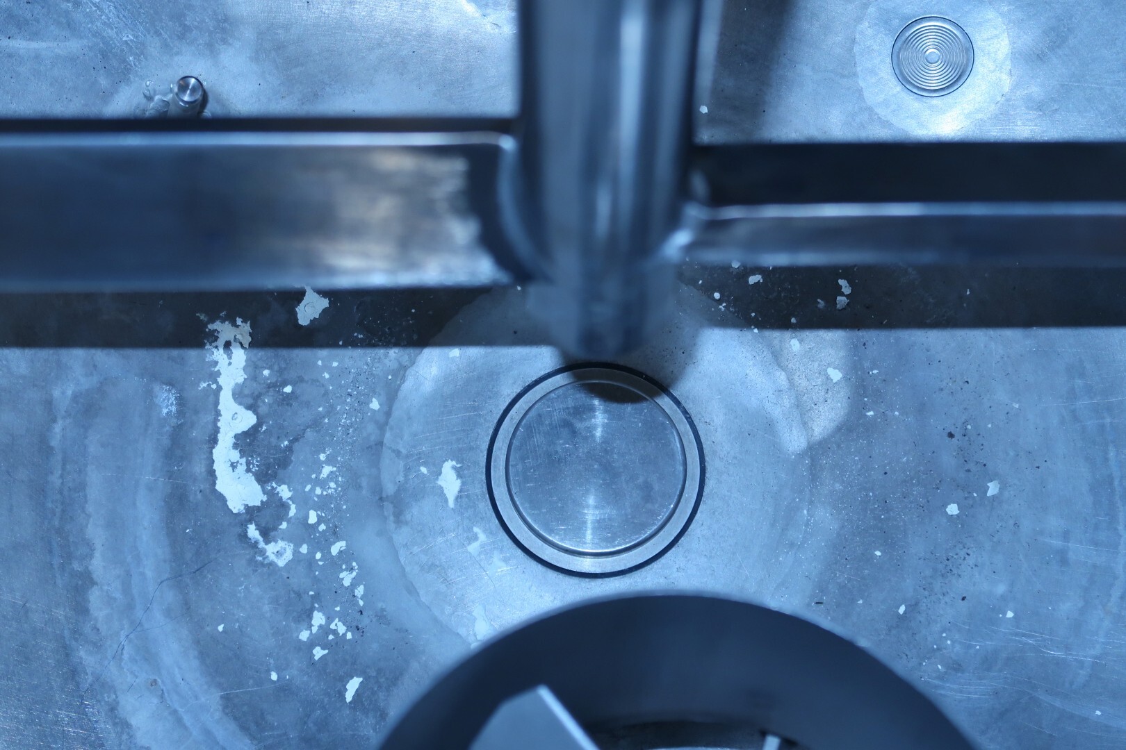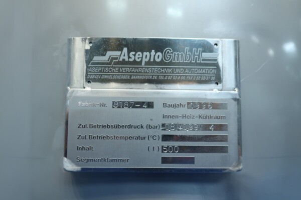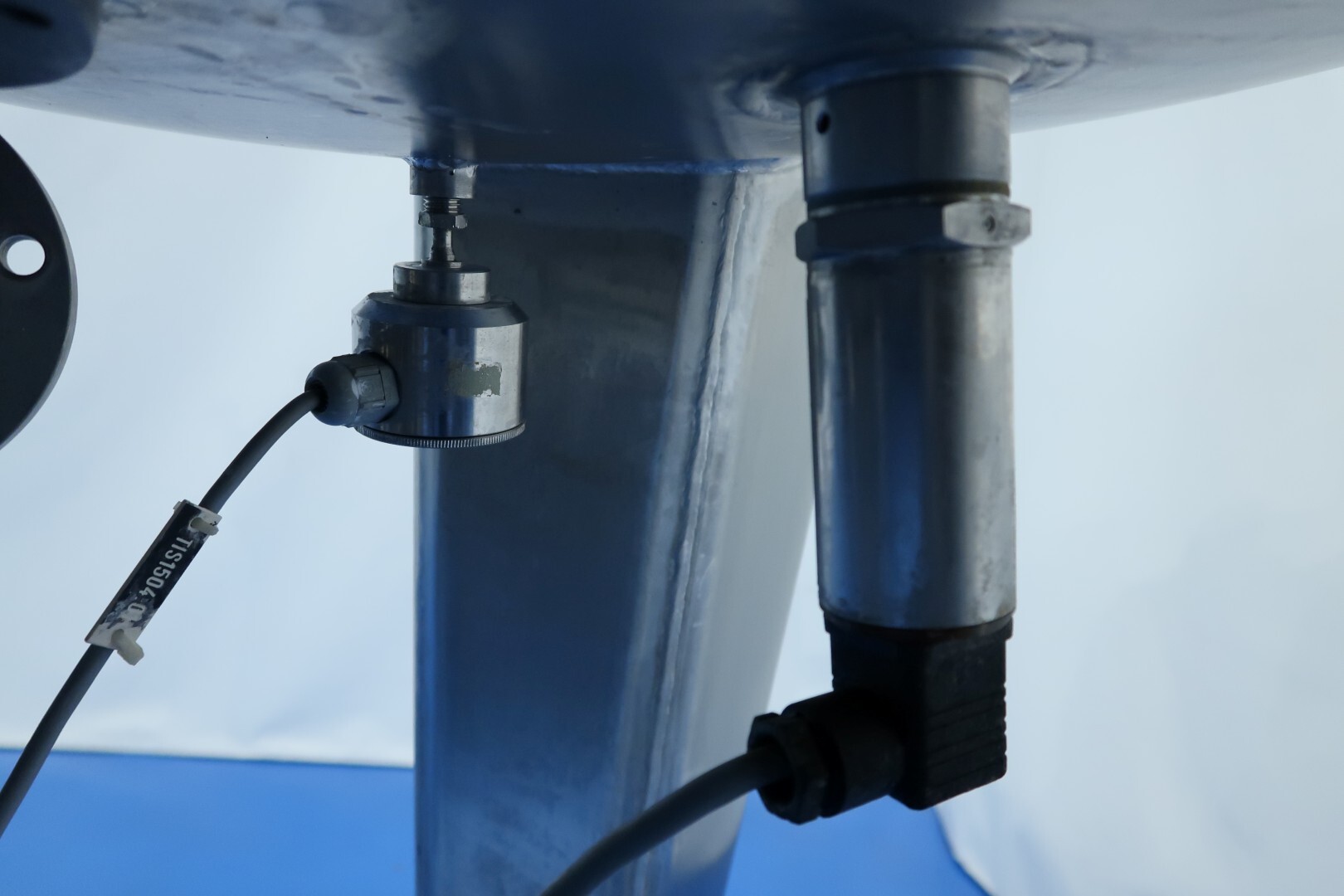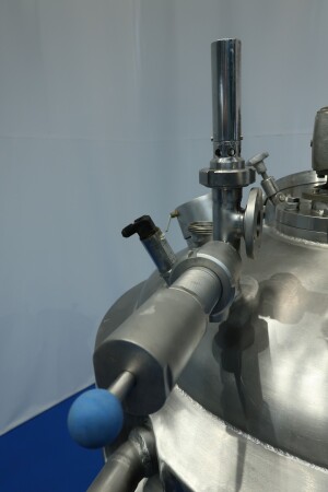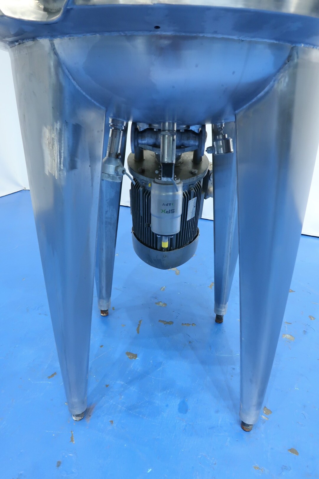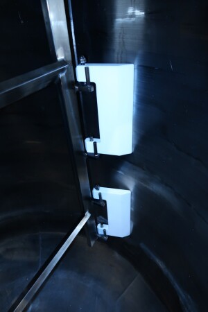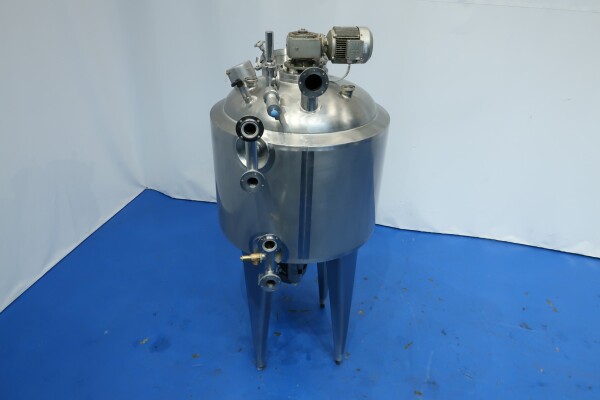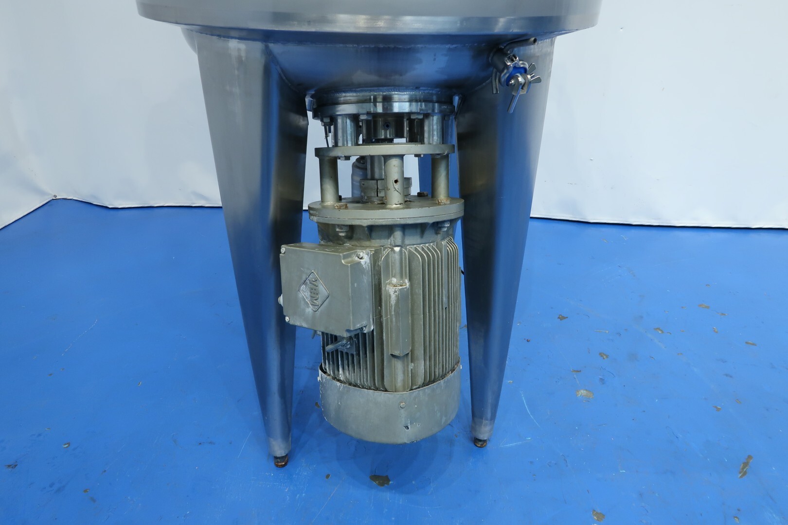 Vacuümprocestank met dubbele mantel voor verwarming en koeling. Uitgerust met twee roerwerken voor optimale menging. Robuuste, snelle rotor/stator-zeef-propellermenger, aangedreven door een 18,5 kW motor met een toerental van 2920 tpm, aangevuld met een schraperroerwerk in het cilindrische gedeelte met een 0,86 kW motor en een maximumtoerental van 32 tpm. De mantel is bestand tegen drukken tot 4 bar, terwijl de tank zelf kan werken onder vacuüm tot -0,8 bar en overdruk tot 0,99 bar, met ingebouwde overdruk- en onderdrukveiligheidskleppen bovenop. De productafvoer wordt eenvoudig geregeld via een 1,5" APV-bodemklep met positiesensor, gemonteerd op een hoogte van 93,5 cm. De tank is tevens uitgerust met een monsternameklep en interne verlichting voor een comfortabele bediening. Nauwkeurige procesbewaking wordt gegarandeerd door druk-, temperatuur- en niveausensoren aan de onderkant, samen met een hoog niveau sensor aan de bovenkant. Twee aansluitingen aan de bovenkant maken CIP-sproeibollen mogelijk (momenteel niet geïnstalleerd). De tank heeft een rond mangat van 272 mm en staat op drie verstelbare poten.