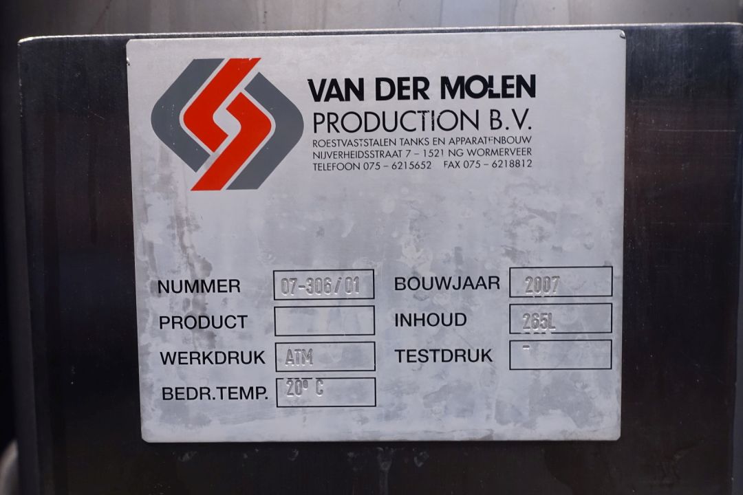 Closed leveltank with manhole in the top. Bottom floor outlet with manual butterfly valve. 3 feet. Pressure: ATM. Temperature: 20 °C. Total dimensions: 110 x 70 x 210 cm.