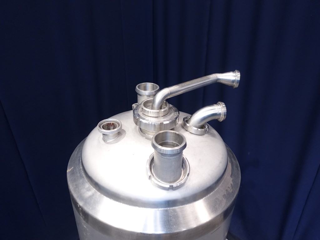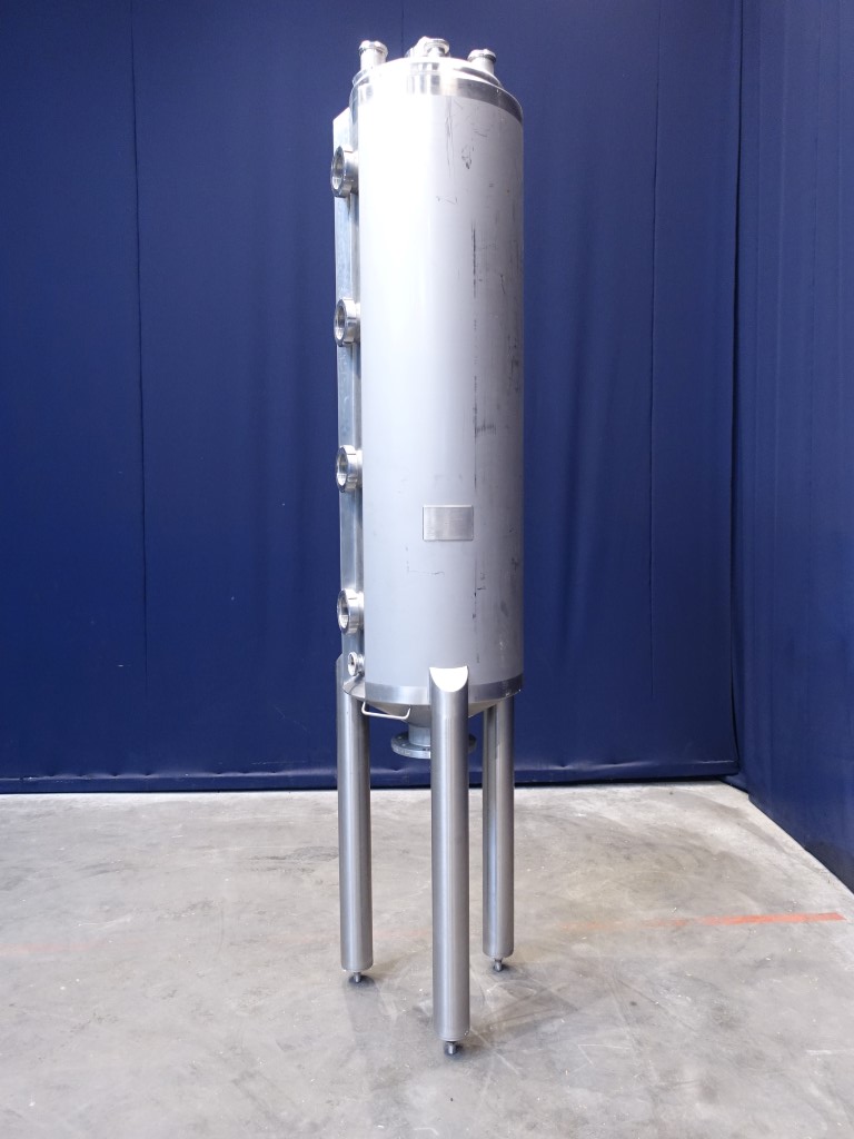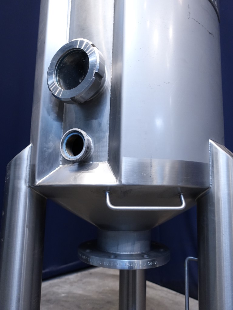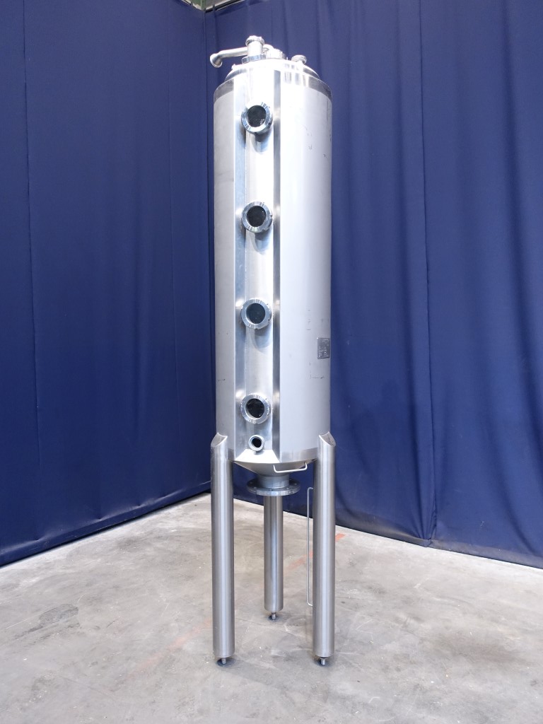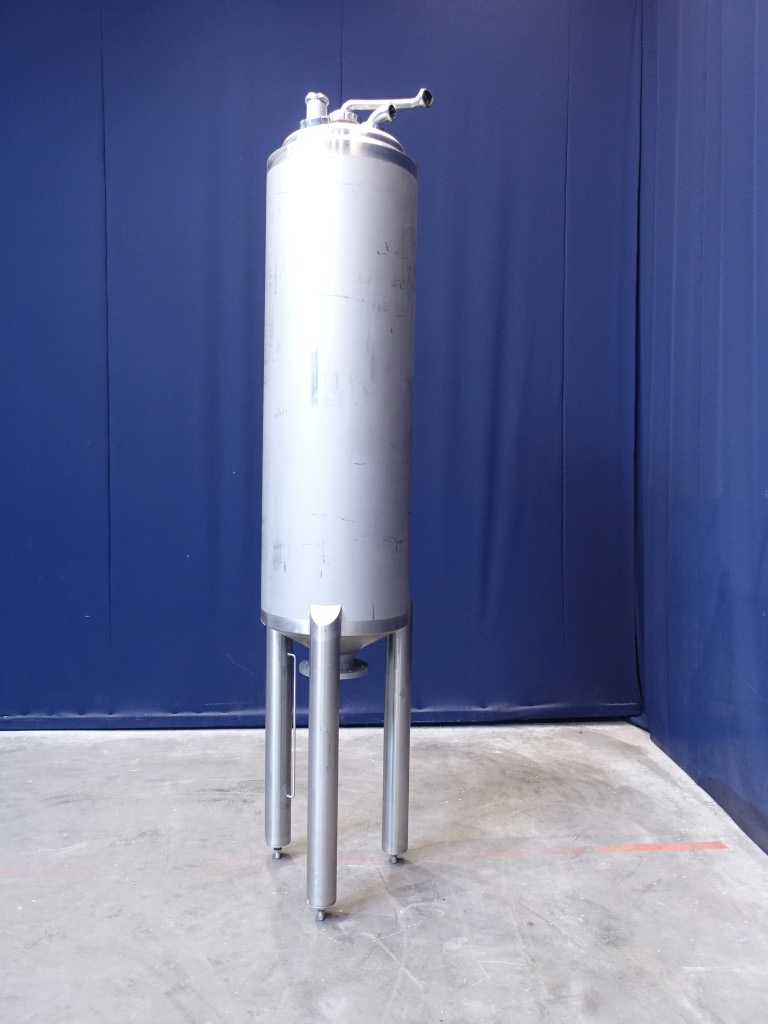 Vertical tank. Nominal volume: 372 liter. Pressure in tank atmospherique, conical bottom. Product outlet DN150 flange, outlet height: 90 cm. 1 CIP spray bowl, 2'' DIN connection. Connections on top of tank 2 x 2'' DIN and 2 x 3'' DIN. 3 adjustable feet. Inside dimensions of tank: Ø 50 cm and heigth: 200 cm. Total dimensions: 65 x 65 x 200 cm.
