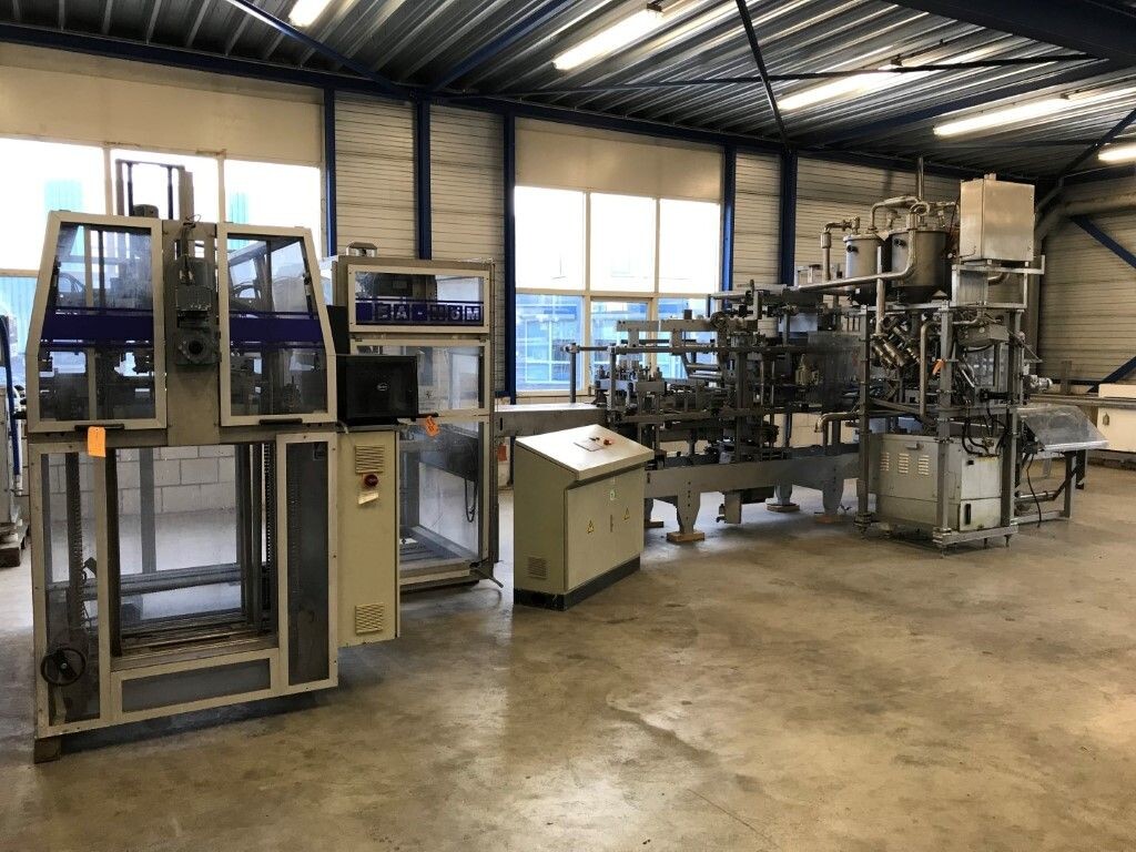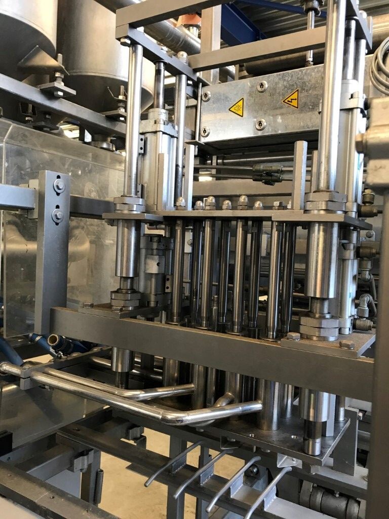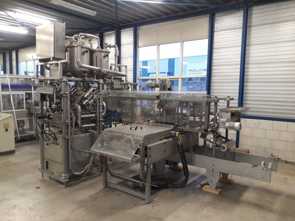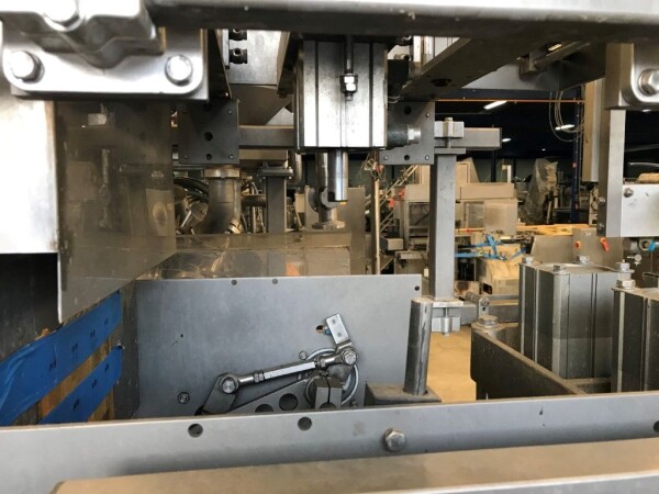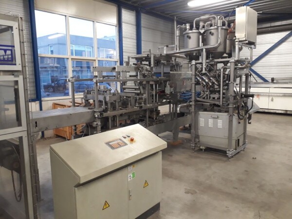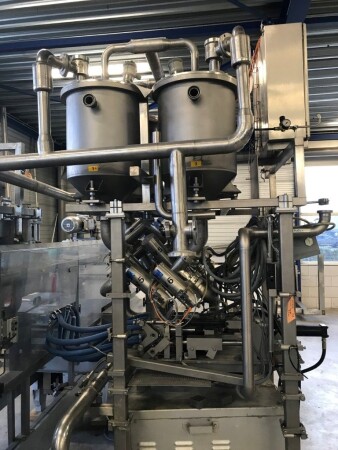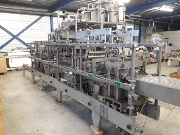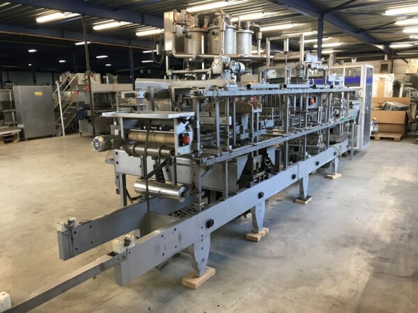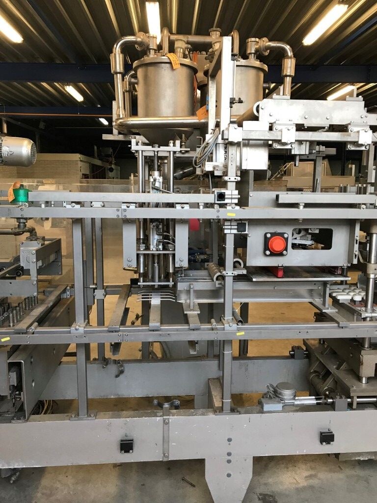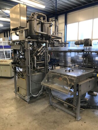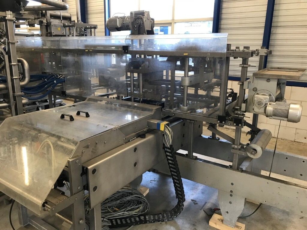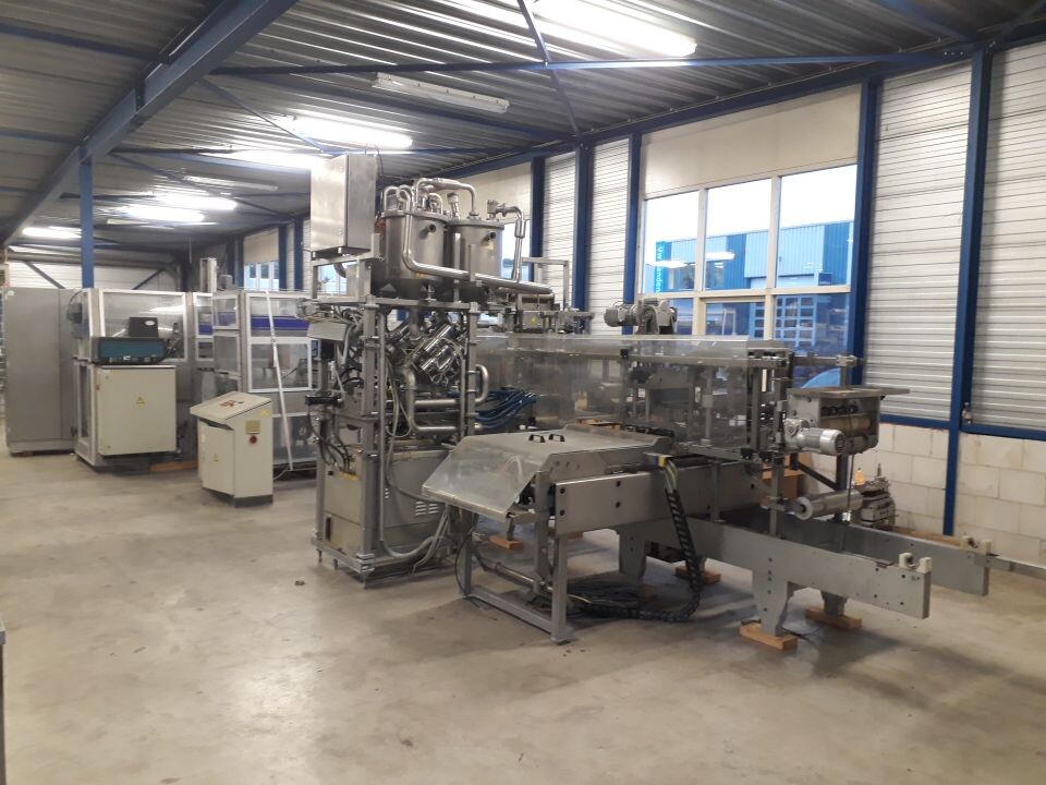 Vorm-, vul-, sluitmachine (FFS) voor roeryoghurt met fruitdeeltjes met een maximale grootte van 10 mm. Capaciteit: 4 x 2 = 8 bekers per slag, 20 slagen per minuut. Huidige beker grootte: max. 125 gr., boven afmetingen: 63 x 63 mm, onderzijde rond met een diepte van 64 mm. Verpakkingsmateriaal: bodemfolie: PS, foliebreedte 276 mm, dikte 1000 μm. Bovenfolie: PS, foliebreedte 258 mm, dikte 100 μm. Banderol: breedte 496 mm. Stations: invoer van onder folie. Voorverwarmingsstation. Station voor thermovorming. Banderol station. Vuller voor het doseren van viscose producten (piston doseerunit, 4 trechters, CIP-reinigbaar, hydraulisch aangedreven). Toevoersysteem voor topfolie met Hereaus UV-ontsmettingsmodule. Uitlijnen van de topfolie (om de print te centreren) met een fotocel. Verzegelstation. Pons station in 2 x 2 = een cluster van 4 bekers. Uitvoer naar inpakker. Schakelkast met bedieningselementen en Siemens SIMODRIVE beschikbaar. Schone lucht filter bovenop de machine. Elektrisch schema en bedieningshandleiding beschikbaar. Inclusief inpakker en tray opzetter, fabrikant PCA Packmaschinen, type TA-3000, serienummer TA-135, bouwjaar: 2000, vermogen: 2,5 kW - 400 V. Nordson 3400-3EA hotmelt-eenheid. Schakelkast met Siemens S5 PLC.