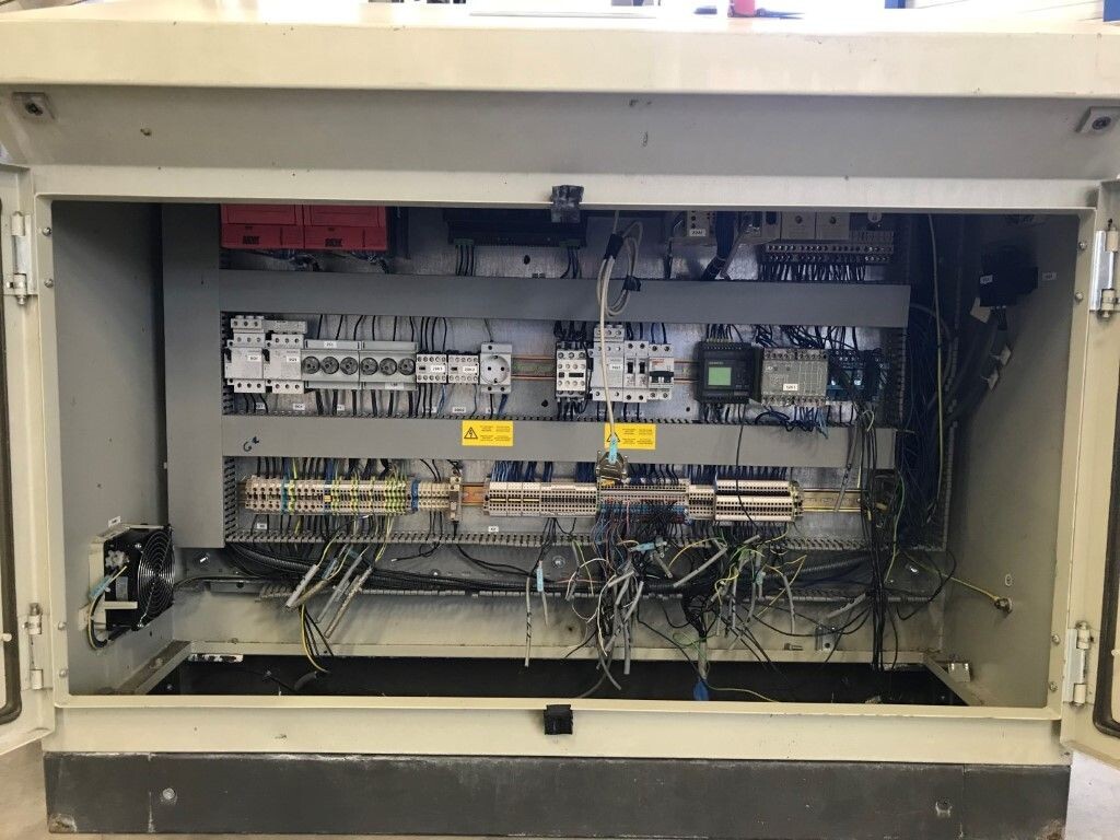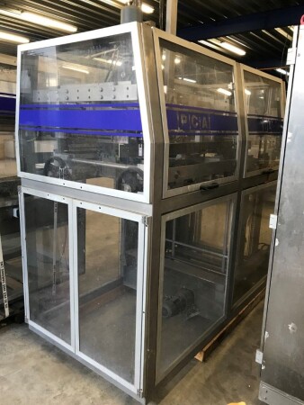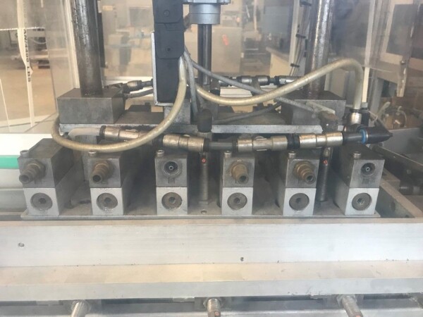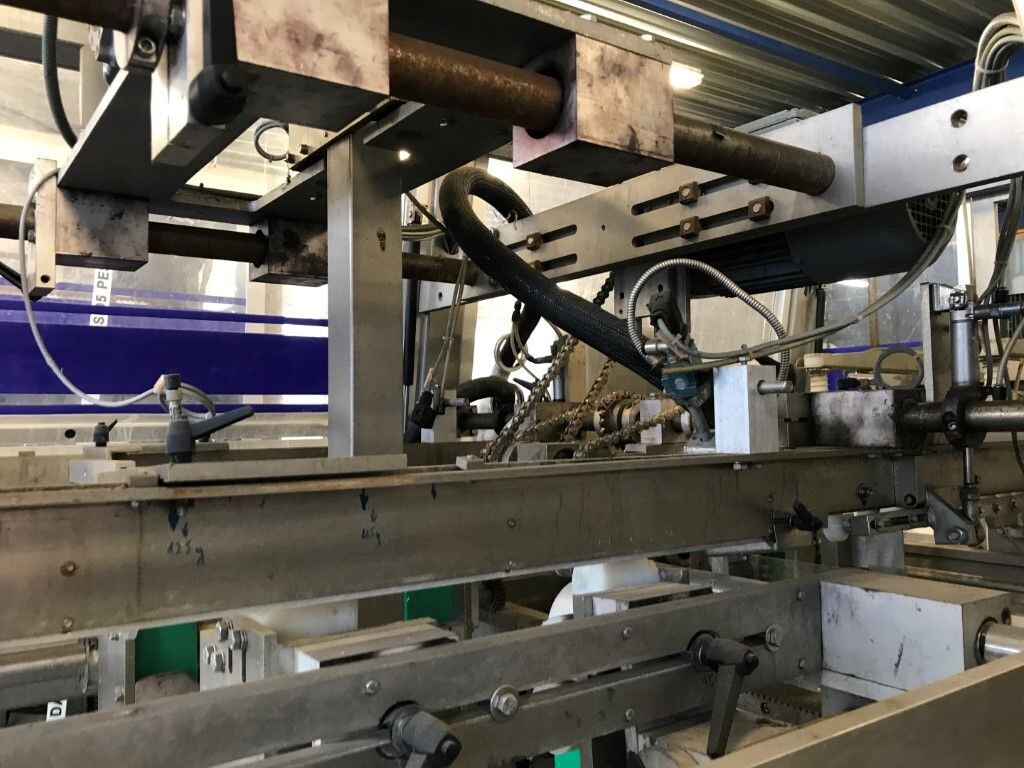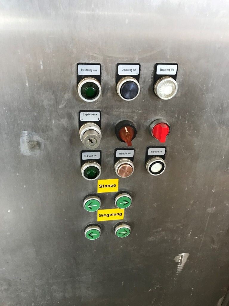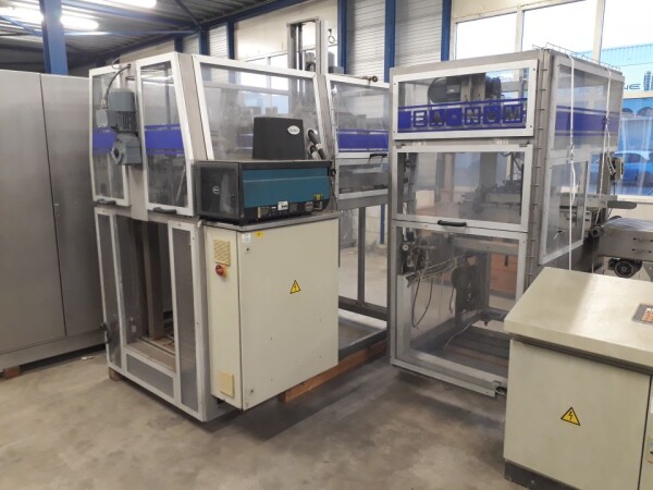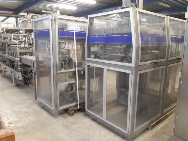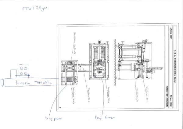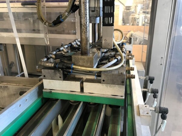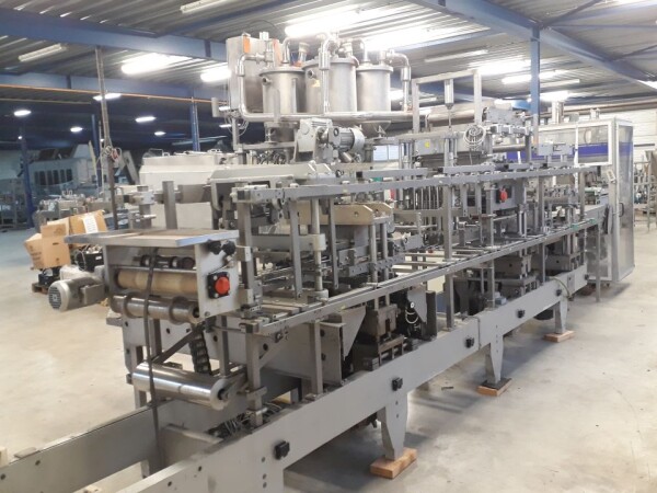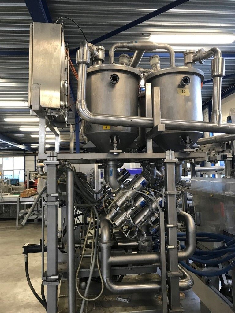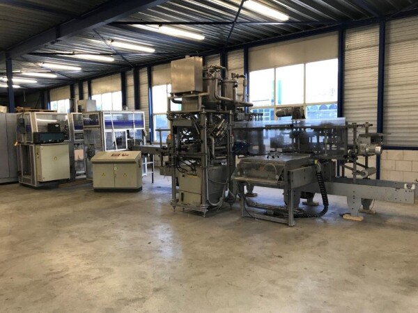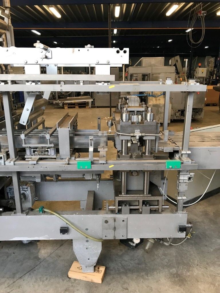 Vorm-, vul-, sluitmachine (FFS) voor roeryoghurt met fruitdeeltjes met een maximale grootte van 10 mm. Capaciteit: 4 x 2 = 8 bekers per slag, 20 slagen per minuut. Huidige beker grootte: max. 125 gr., boven afmetingen: 63 x 63 mm, onderzijde rond met een diepte van 64 mm. Verpakkingsmateriaal: bodemfolie: PS, foliebreedte 276 mm, dikte 1000 μm. Bovenfolie: PS, foliebreedte 258 mm, dikte 100 μm. Banderol: breedte 496 mm. Stations: invoer van onder folie. Voorverwarmingsstation. Station voor thermovorming. Banderol station. Vuller voor het doseren van viscose producten (piston doseerunit, 4 trechters, CIP-reinigbaar, hydraulisch aangedreven). Toevoersysteem voor topfolie met Hereaus UV-ontsmettingsmodule. Uitlijnen van de topfolie (om de print te centreren) met een fotocel. Verzegelstation. Pons station in 2 x 2 = een cluster van 4 bekers. Uitvoer naar inpakker. Schakelkast met bedieningselementen en Siemens SIMODRIVE beschikbaar. Schone lucht filter bovenop de machine. Elektrisch schema en bedieningshandleiding beschikbaar. Inclusief inpakker en tray opzetter, fabrikant PCA Packmaschinen, type TA-3000, serienummer TA-135, bouwjaar: 2000, vermogen: 2,5 kW - 400 V. Nordson 3400-3EA hotmelt-eenheid. Schakelkast met Siemens S5 PLC.