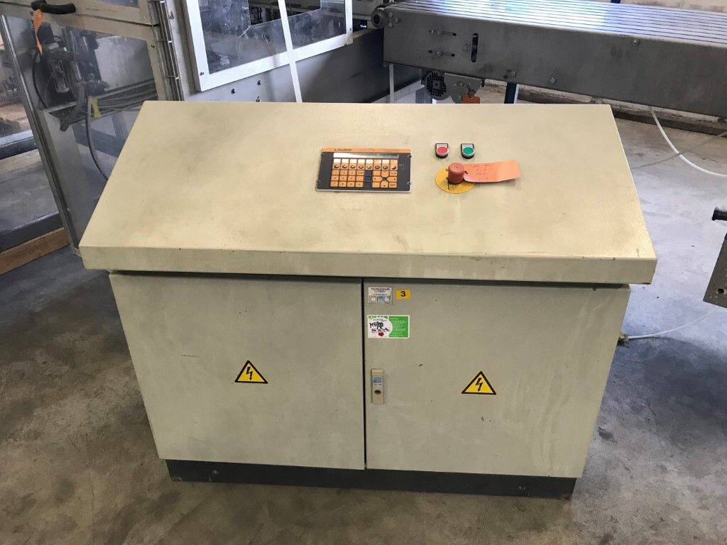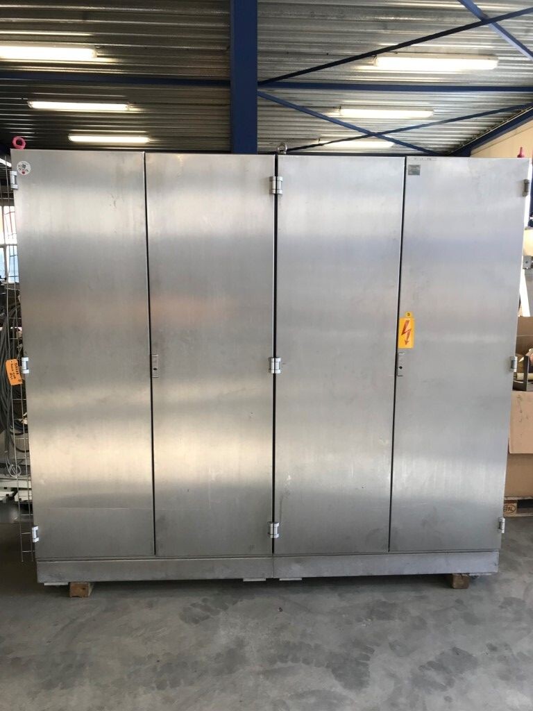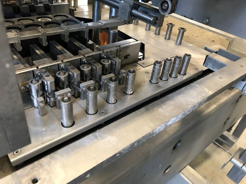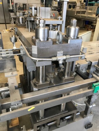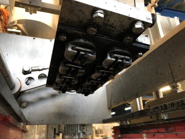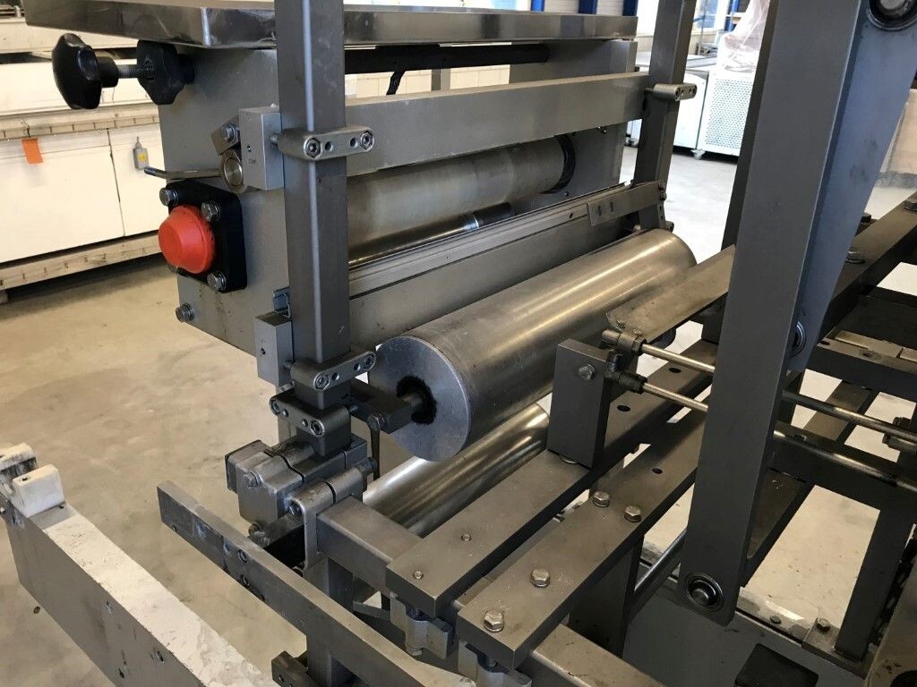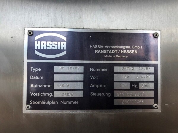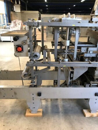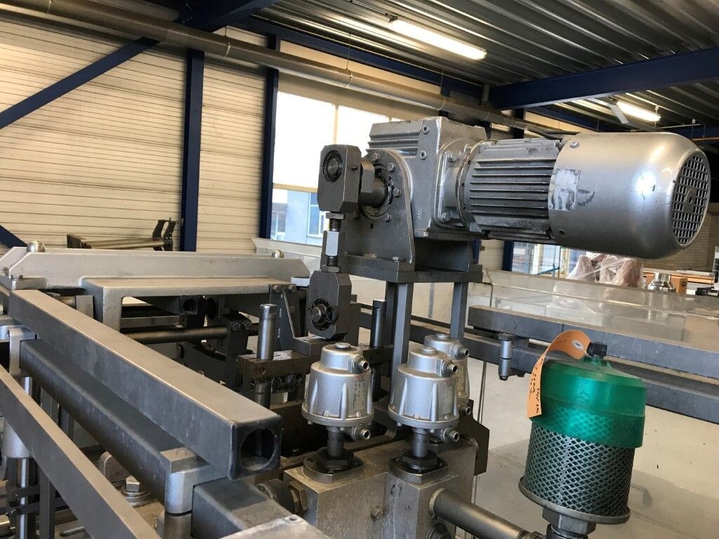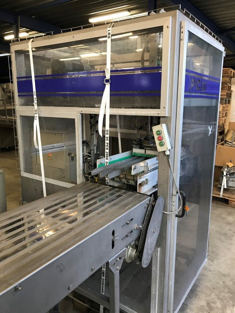 Vorm-, vul-, sluitmachine (FFS) voor roeryoghurt met fruitdeeltjes met een maximale grootte van 10 mm. Capaciteit: 4 x 2 = 8 bekers per slag, 20 slagen per minuut. Huidige beker grootte: max. 125 gr., boven afmetingen: 63 x 63 mm, onderzijde rond met een diepte van 64 mm. Verpakkingsmateriaal: bodemfolie: PS, foliebreedte 276 mm, dikte 1000 μm. Bovenfolie: PS, foliebreedte 258 mm, dikte 100 μm. Banderol: breedte 496 mm. Stations: invoer van onder folie. Voorverwarmingsstation. Station voor thermovorming. Banderol station. Vuller voor het doseren van viscose producten (piston doseerunit, 4 trechters, CIP-reinigbaar, hydraulisch aangedreven). Toevoersysteem voor topfolie met Hereaus UV-ontsmettingsmodule. Uitlijnen van de topfolie (om de print te centreren) met een fotocel. Verzegelstation. Pons station in 2 x 2 = een cluster van 4 bekers. Uitvoer naar inpakker. Schakelkast met bedieningselementen en Siemens SIMODRIVE beschikbaar. Schone lucht filter bovenop de machine. Elektrisch schema en bedieningshandleiding beschikbaar. Inclusief inpakker en tray opzetter, fabrikant PCA Packmaschinen, type TA-3000, serienummer TA-135, bouwjaar: 2000, vermogen: 2,5 kW - 400 V. Nordson 3400-3EA hotmelt-eenheid. Schakelkast met Siemens S5 PLC.