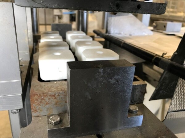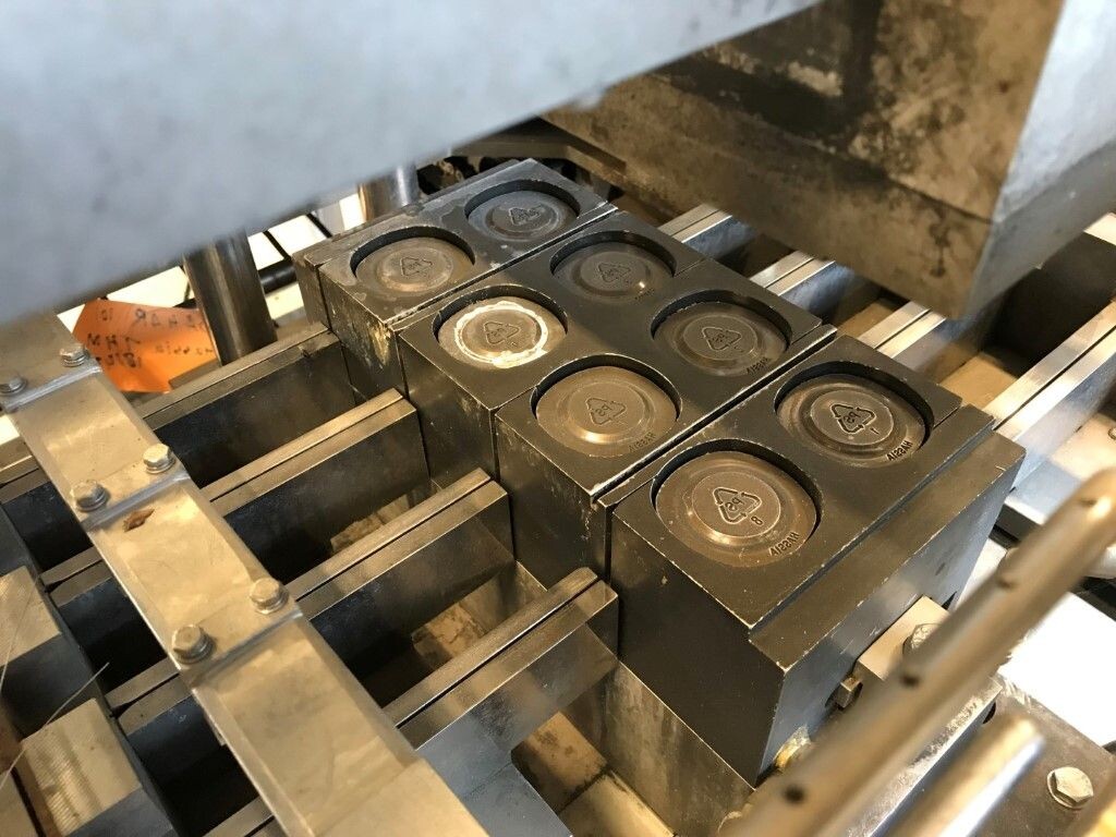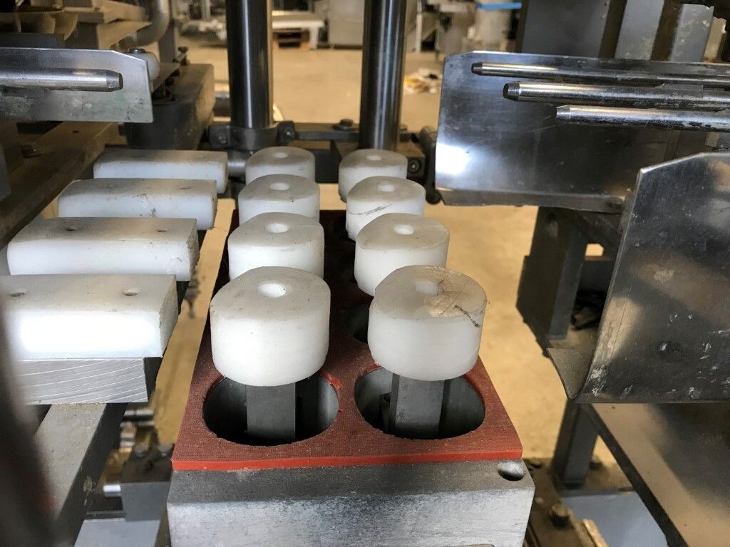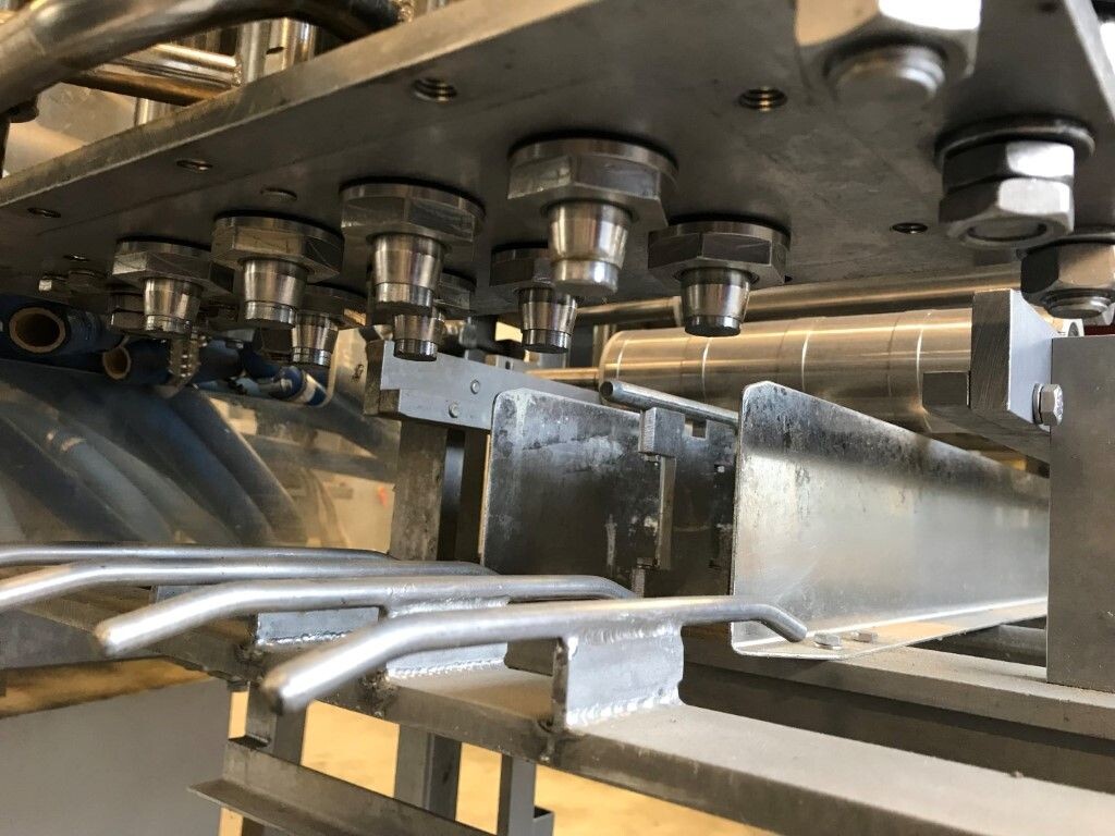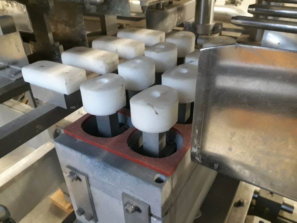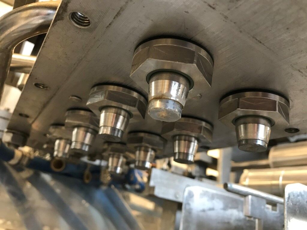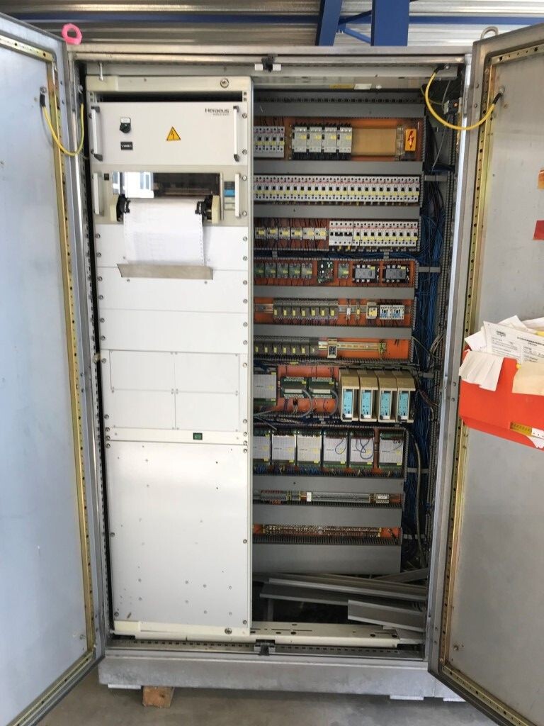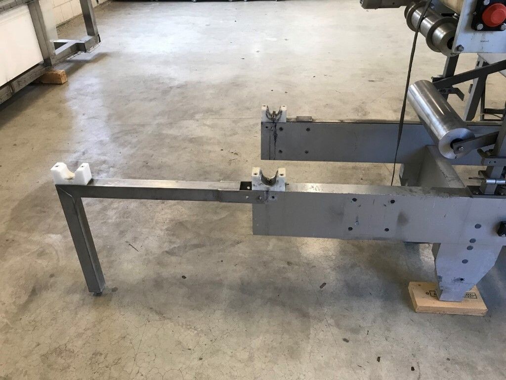 Vorm-, vul-, sluitmachine (FFS) voor roeryoghurt met fruitdeeltjes met een maximale grootte van 10 mm. Capaciteit: 4 x 2 = 8 bekers per slag, 20 slagen per minuut. Huidige beker grootte: max. 125 gr., boven afmetingen: 63 x 63 mm, onderzijde rond met een diepte van 64 mm. Verpakkingsmateriaal: bodemfolie: PS, foliebreedte 276 mm, dikte 1000 μm. Bovenfolie: PS, foliebreedte 258 mm, dikte 100 μm. Banderol: breedte 496 mm. Stations: invoer van onder folie. Voorverwarmingsstation. Station voor thermovorming. Banderol station. Vuller voor het doseren van viscose producten (piston doseerunit, 4 trechters, CIP-reinigbaar, hydraulisch aangedreven). Toevoersysteem voor topfolie met Hereaus UV-ontsmettingsmodule. Uitlijnen van de topfolie (om de print te centreren) met een fotocel. Verzegelstation. Pons station in 2 x 2 = een cluster van 4 bekers. Uitvoer naar inpakker. Schakelkast met bedieningselementen en Siemens SIMODRIVE beschikbaar. Schone lucht filter bovenop de machine. Elektrisch schema en bedieningshandleiding beschikbaar. Inclusief inpakker en tray opzetter, fabrikant PCA Packmaschinen, type TA-3000, serienummer TA-135, bouwjaar: 2000, vermogen: 2,5 kW - 400 V. Nordson 3400-3EA hotmelt-eenheid. Schakelkast met Siemens S5 PLC.