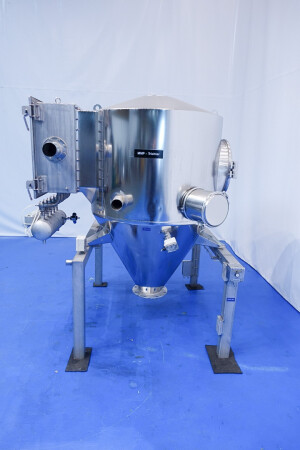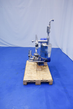 Butterfly valve on inlet, by-pass valve for cleaning. The powders and liquids come together with the liquid in the special mixing head, this triblender has a special infeed to prevent bridging of powder and air entrapment.