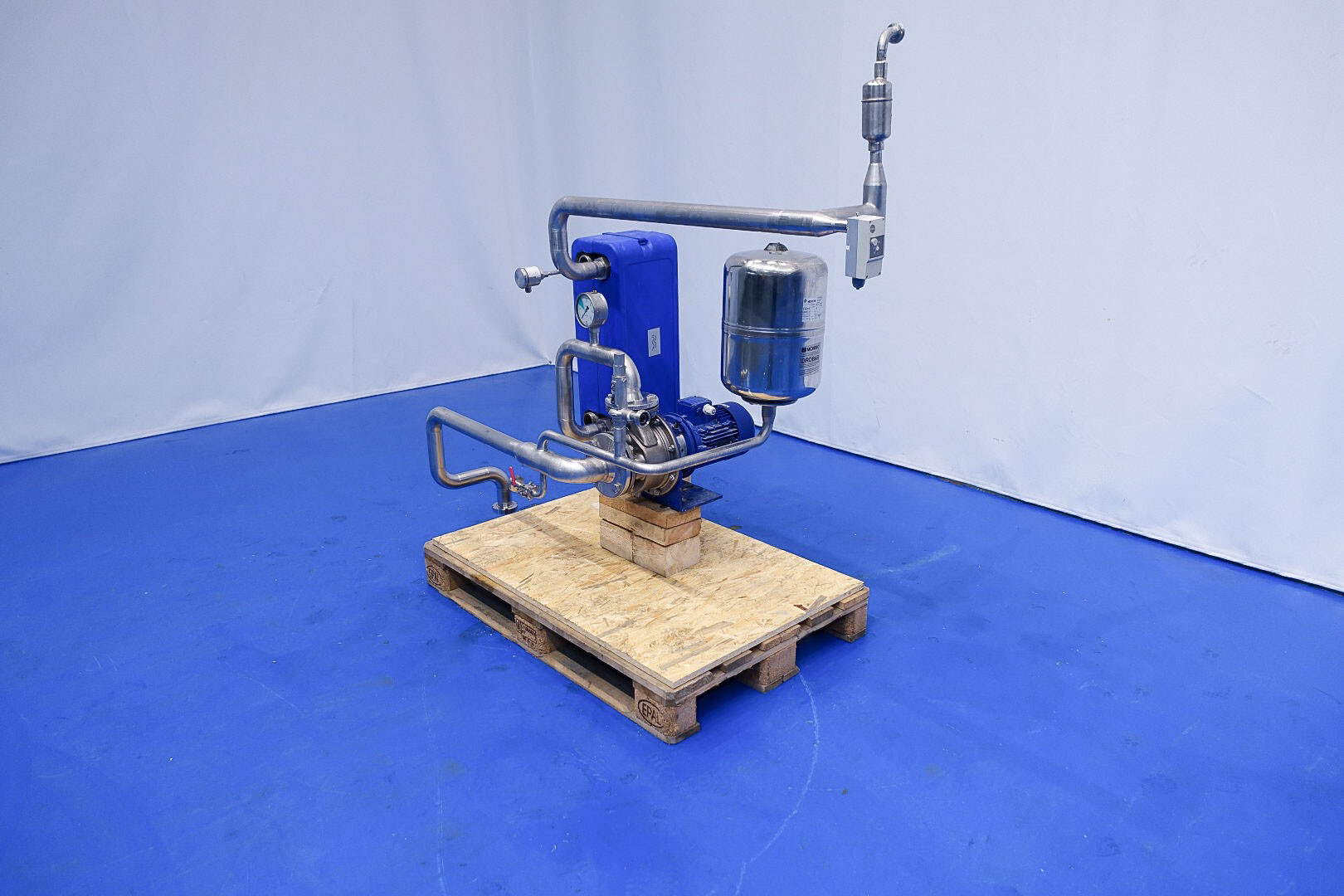 2) A system to make hotwater out of steam (counter flow with the product on the plate heatexchanger). With circulation pump KSB, steam control valve, expansions vessel and steam/hotwater brazed heatexchanger (model CB76-60H)