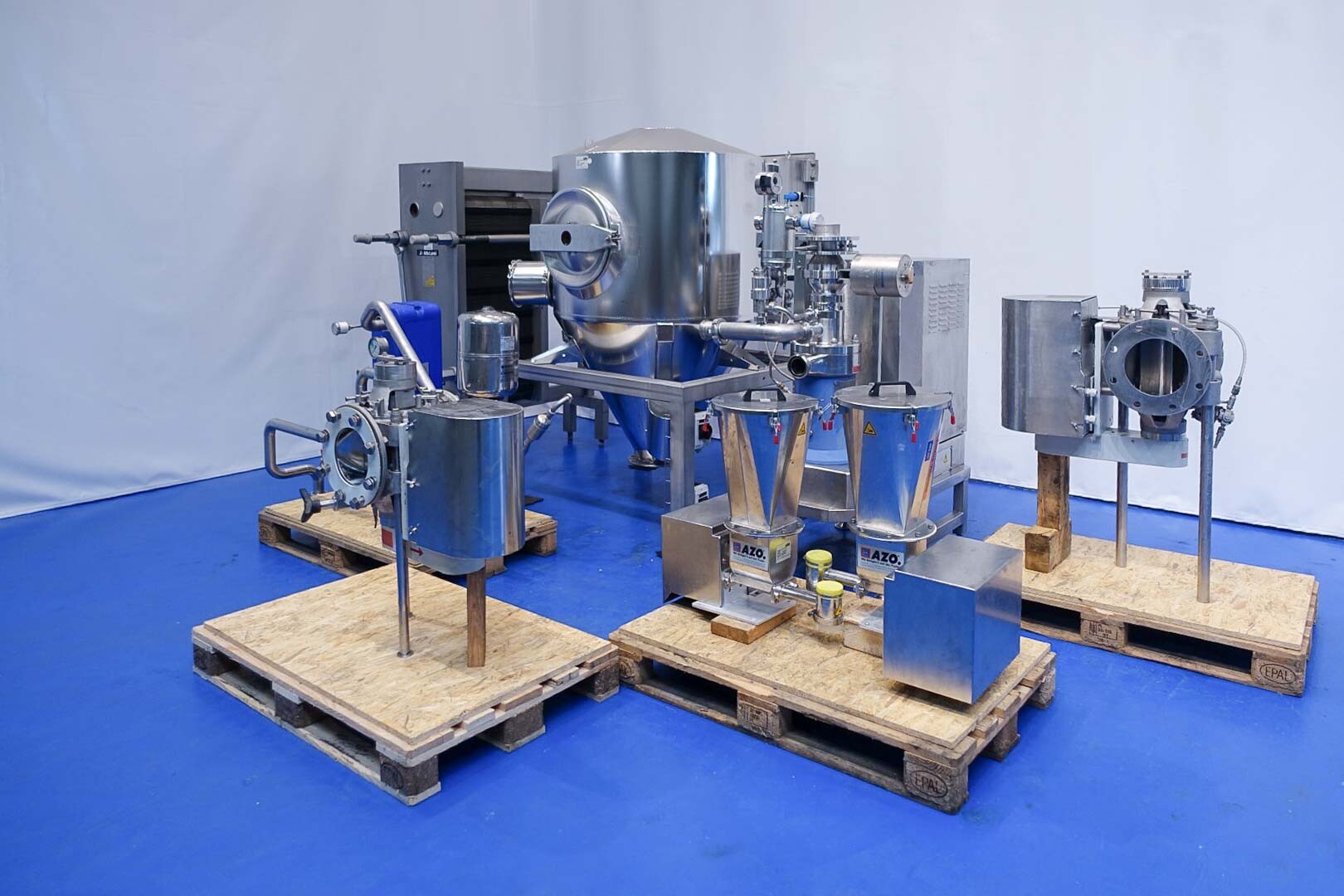 5) 2 dosing units for small ingredients (like vitamins) make: Azo, model: Azo dos P30/2 with double augers and hopper.