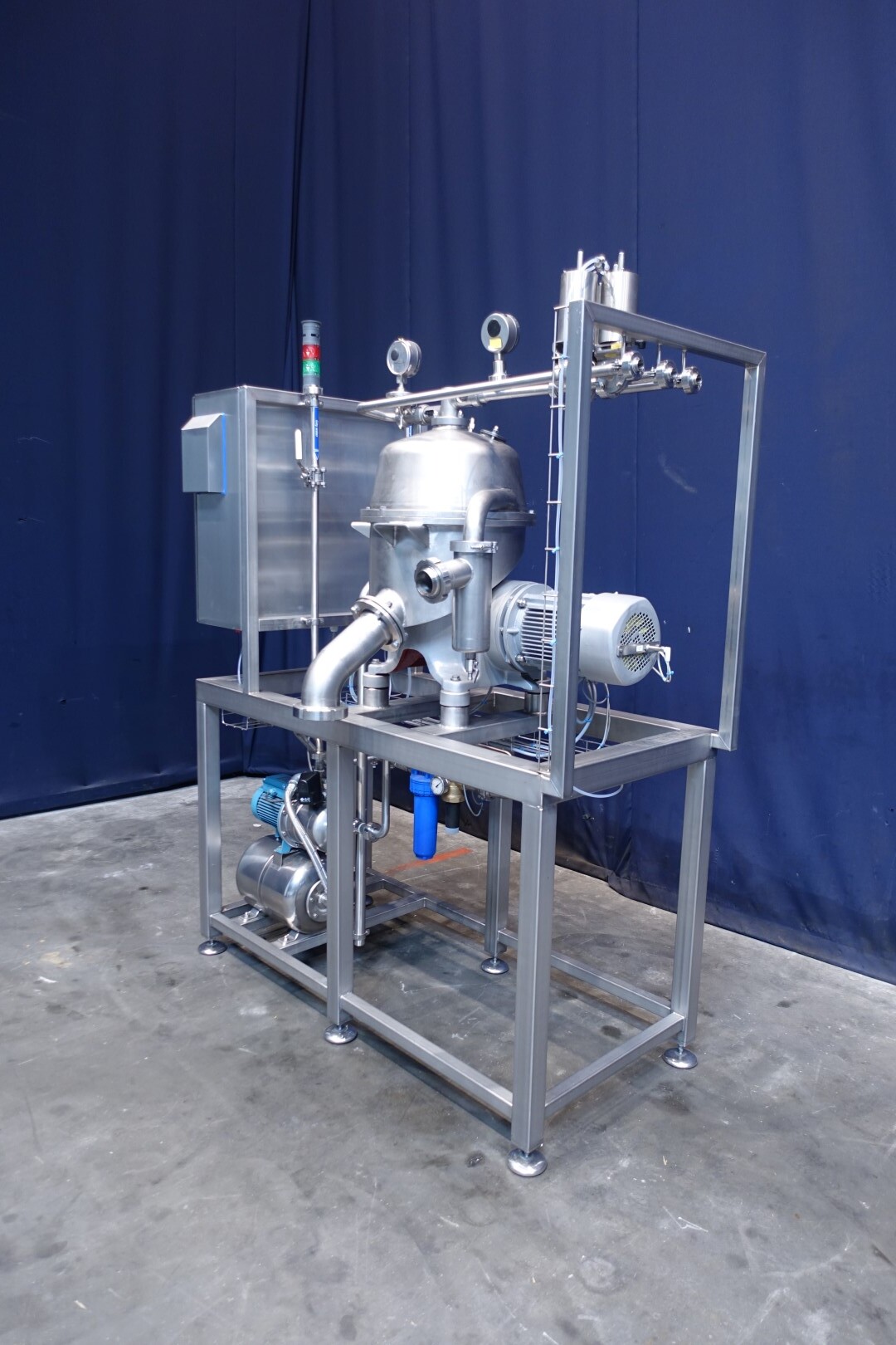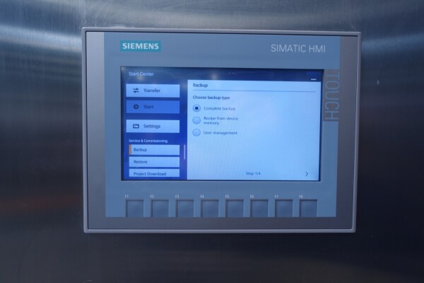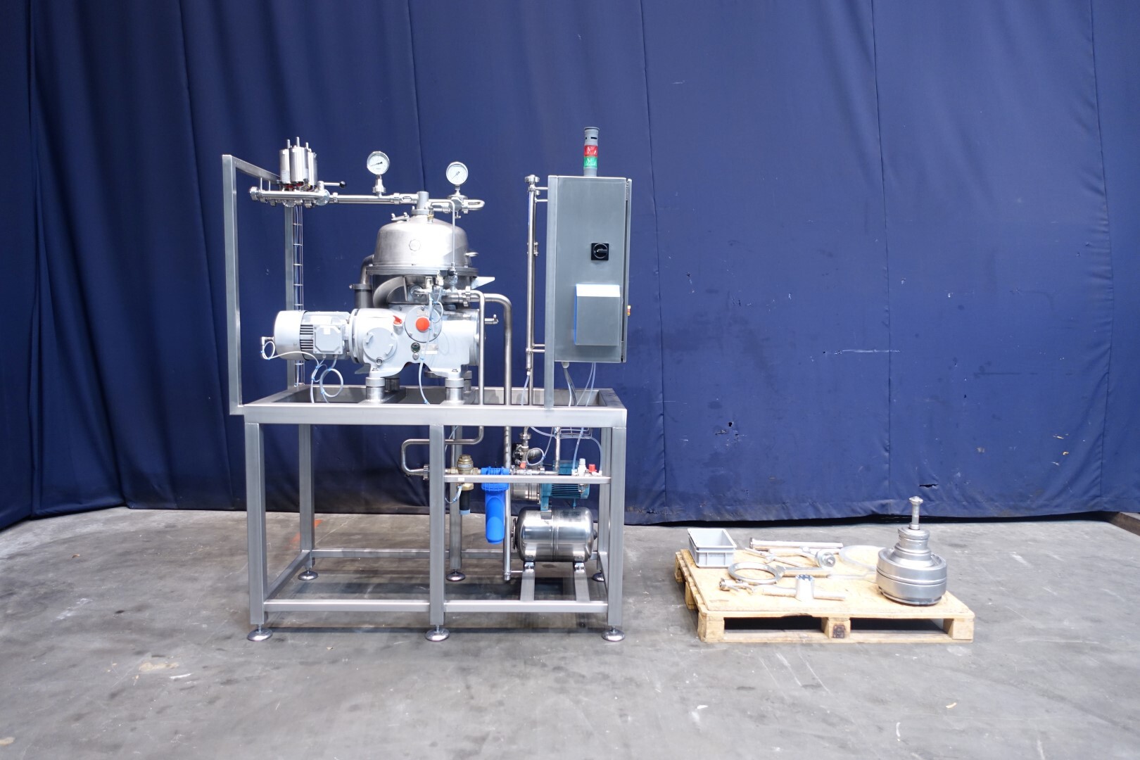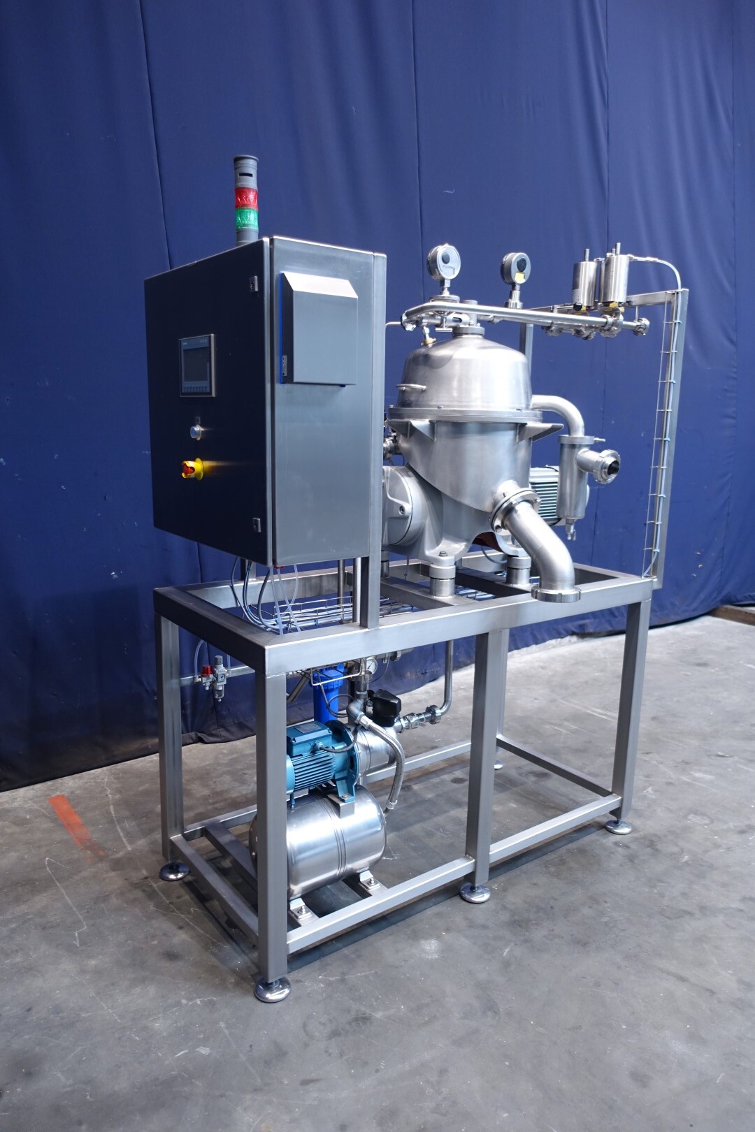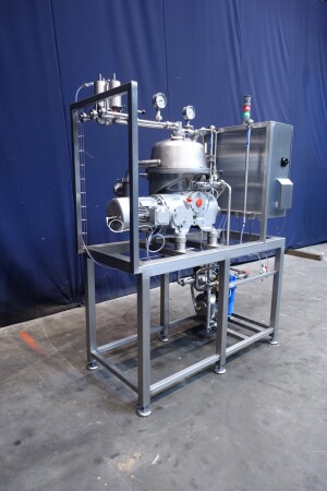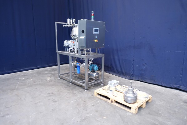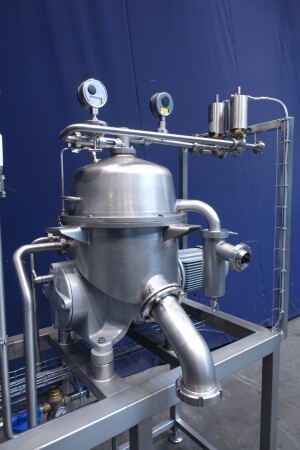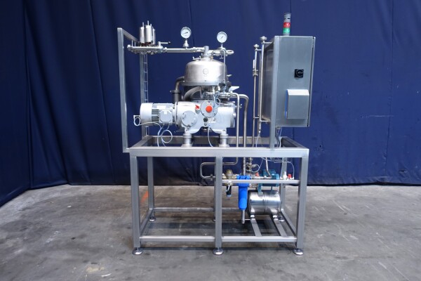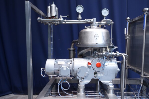 Восстановленная вода — жироотделитель с одним центростремительным насосом для тяжелой фазы (например, вода/обезжиренное молоко) с самоочищающейся чашей. Сепаратор используется для разделения жидких смесей, в которых доля легкой фазы (например, жир/остаточное масло) мала (менее 10%) или варьируется в широких пределах. Тяжелая фаза откачивается под давлением, легкая фаза покидает машину самотеком через нижнее выпускное отверстие. Скорость чаши 9.210 об/мин. Детали двигателя: 4 кВт. Ø Di, мм 271. Скорость чаши: 9.210 об/мин. Тяжелые жидкости: 1,0. Твердый: 1,15. перепускные клапаны продукта. Резервуар для сбора осадка. Полностью восстановлен, установлен на раме из нержавеющей стали. Новый блок управления с ПЛК Siemens S7-1200 и сенсорной панелью управления со всеми сообщениями и настройками. Двигатель-индикатор ампер, счетчик часов, преобразователь частоты, кабели, показания датчиков давления. Водяные клапаны для управления водой для открытия и закрытия чаши с редукторами воды и модулем постоянного давления воды. Фильтры для воды и запасные фильтры.